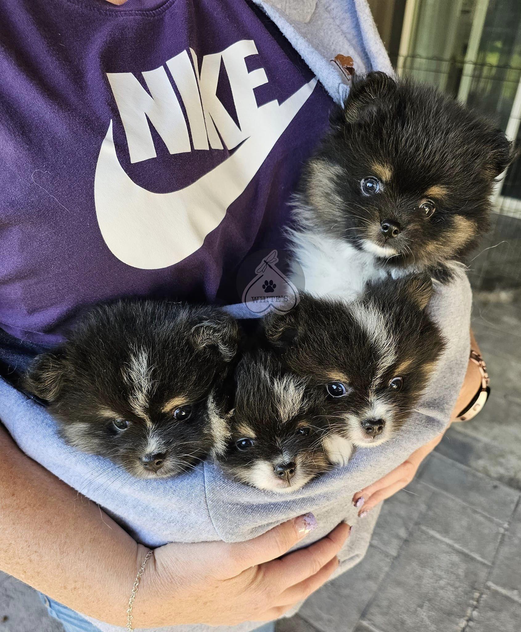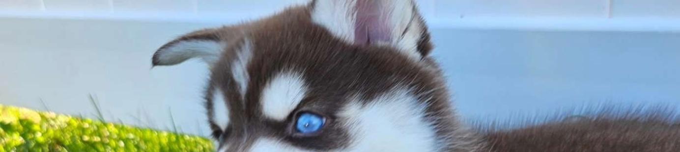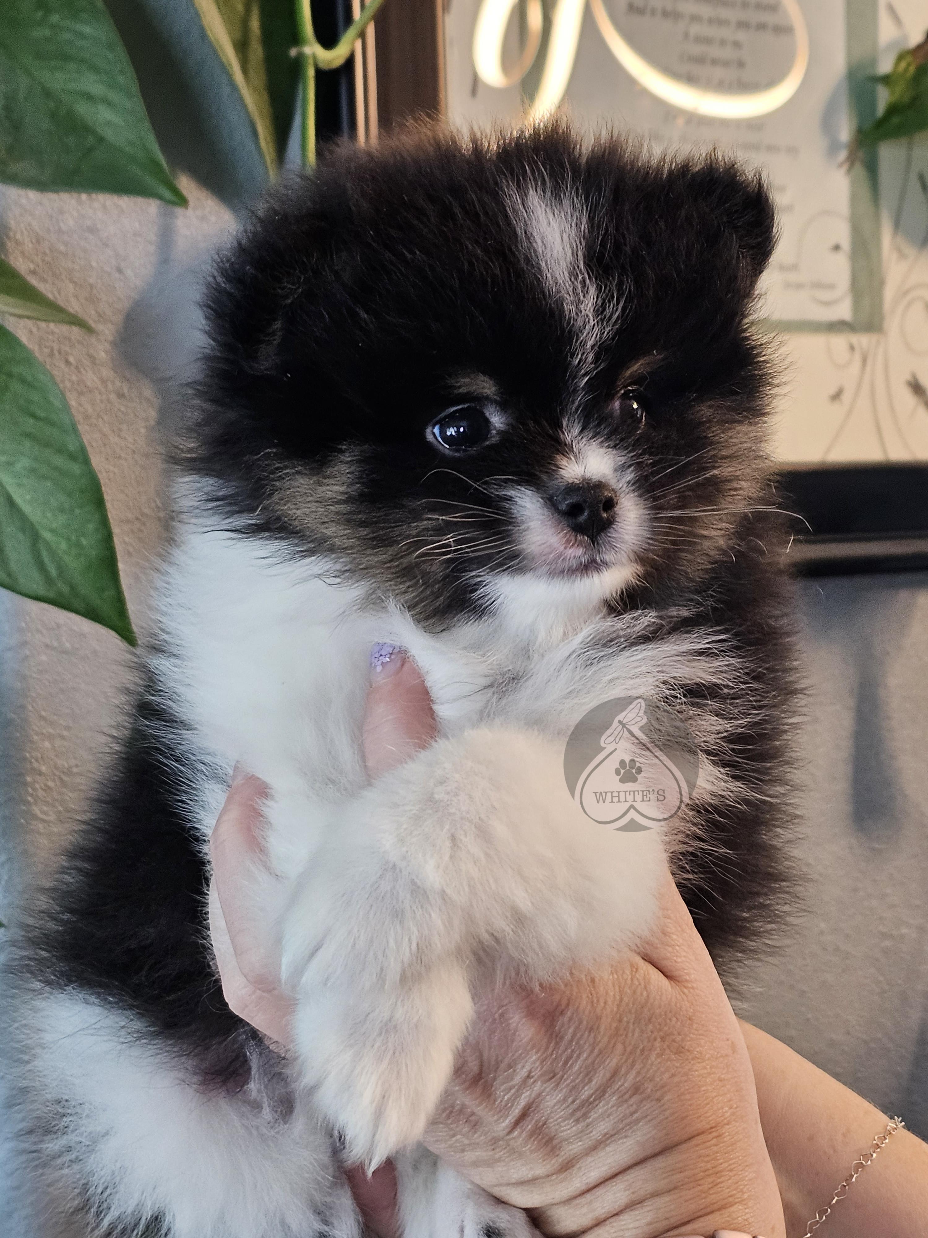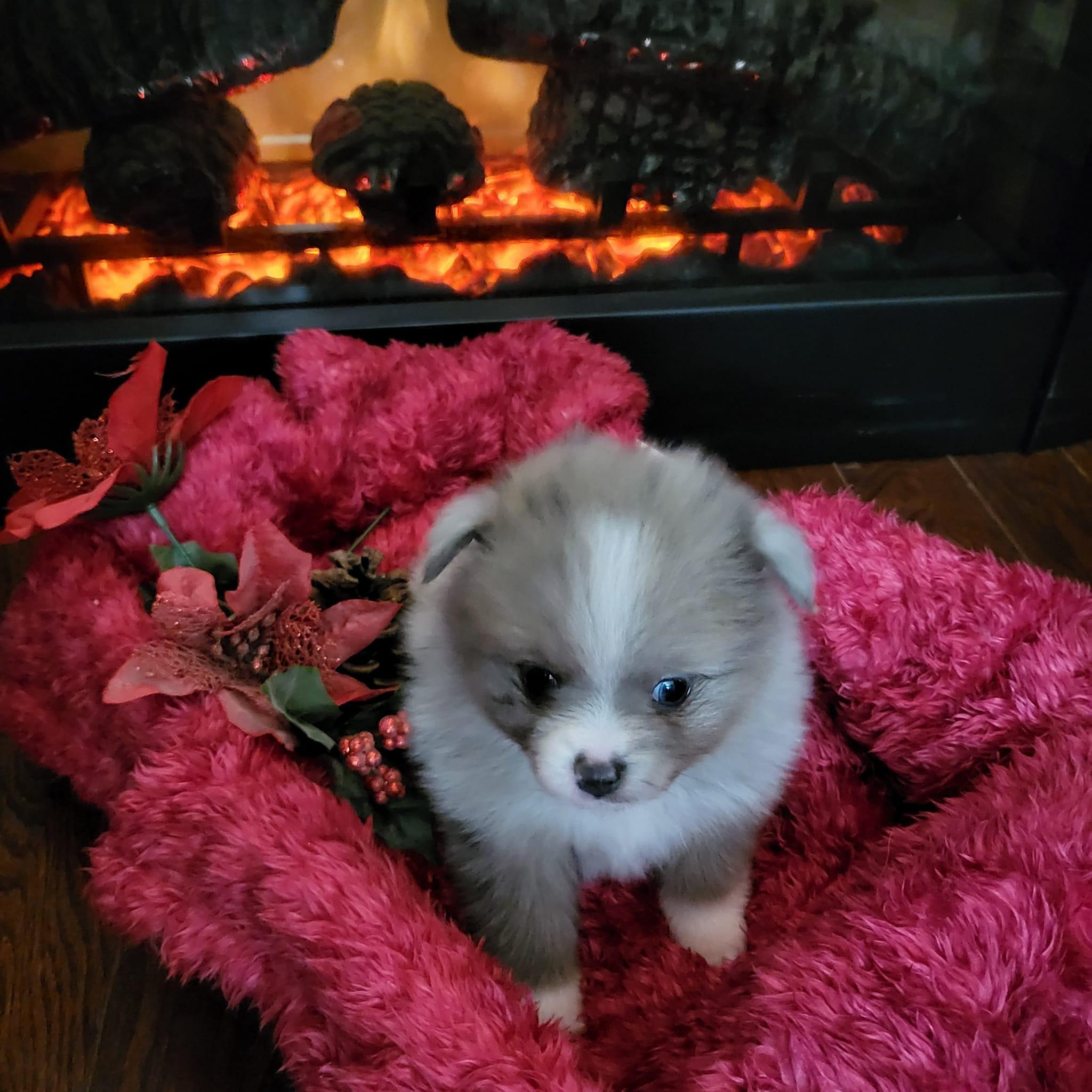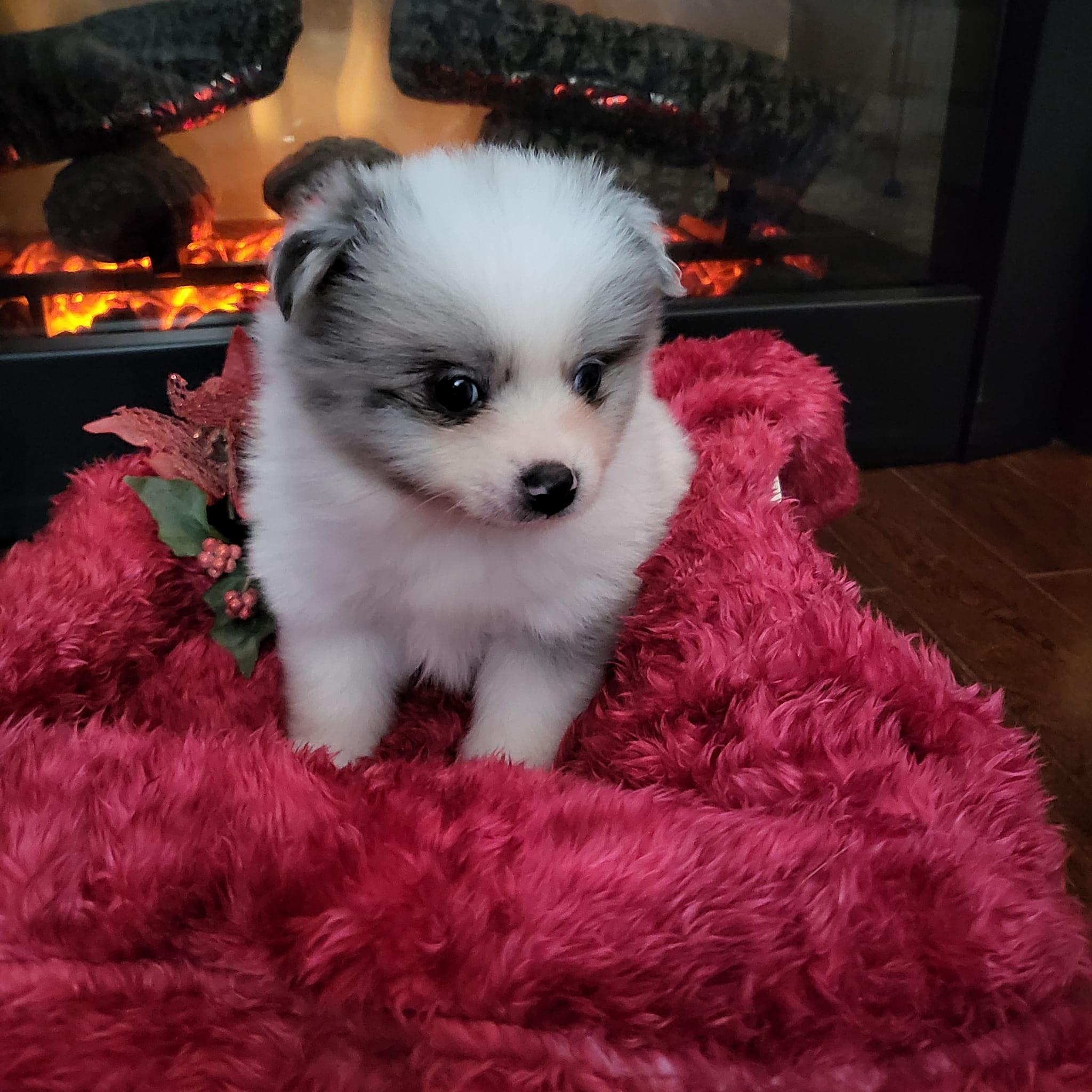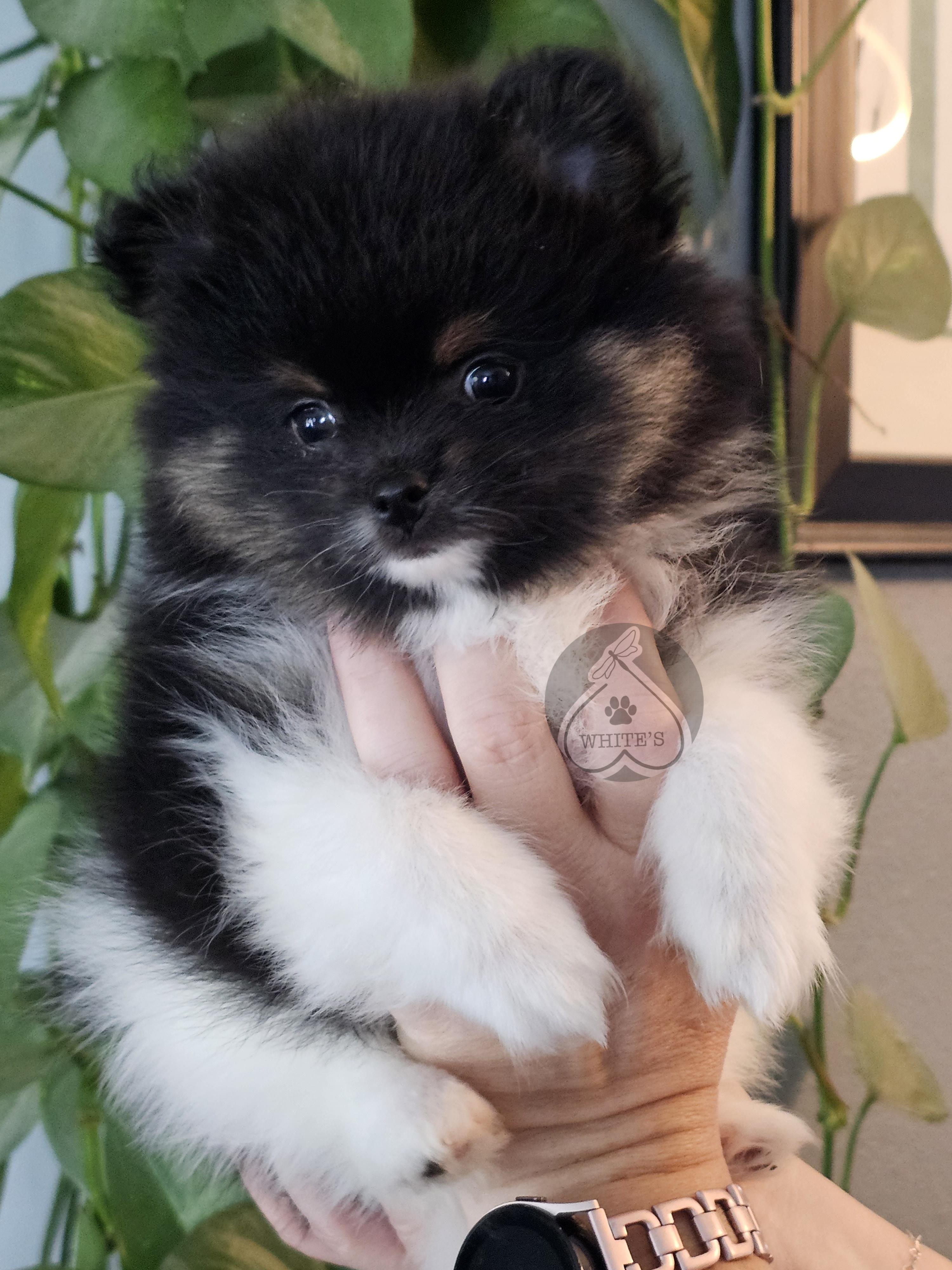 Our Pomsky puppies include black and white, chocolate, and red and white. Pomeranian puppies include black, blue, tri-colored, chocolate and tan, and black and tan. Colors will vary depending on the parent dogs.
