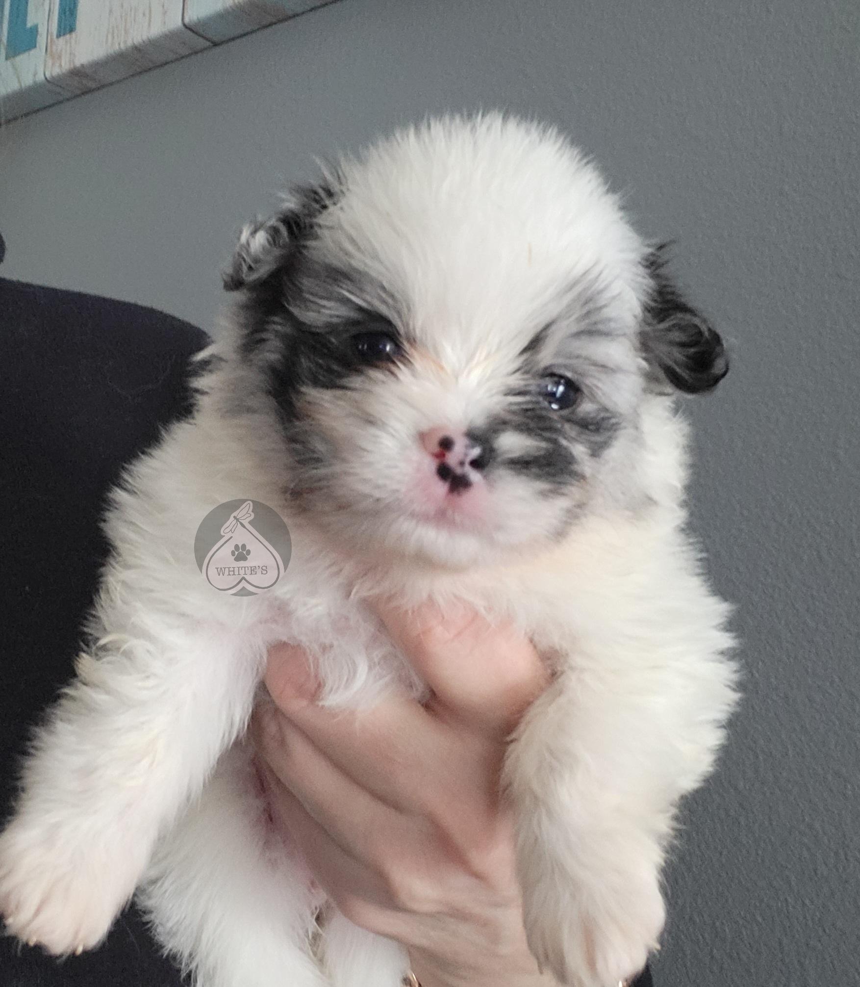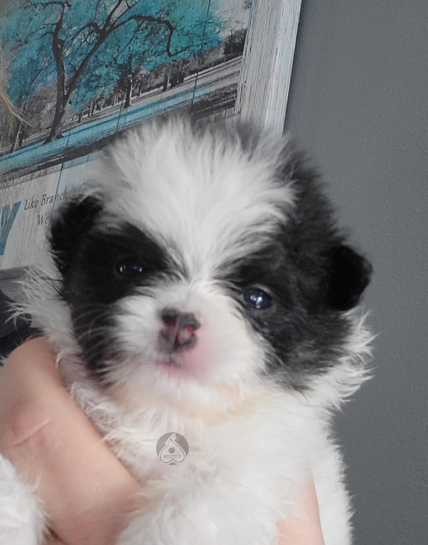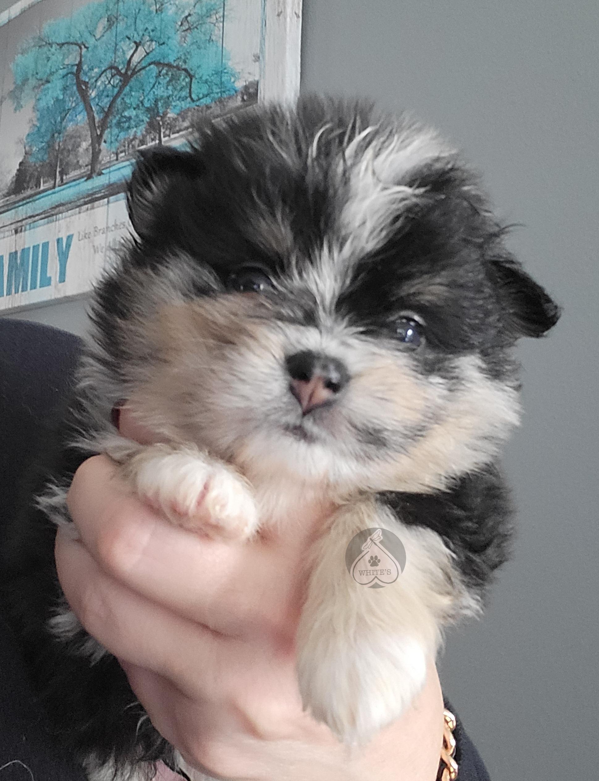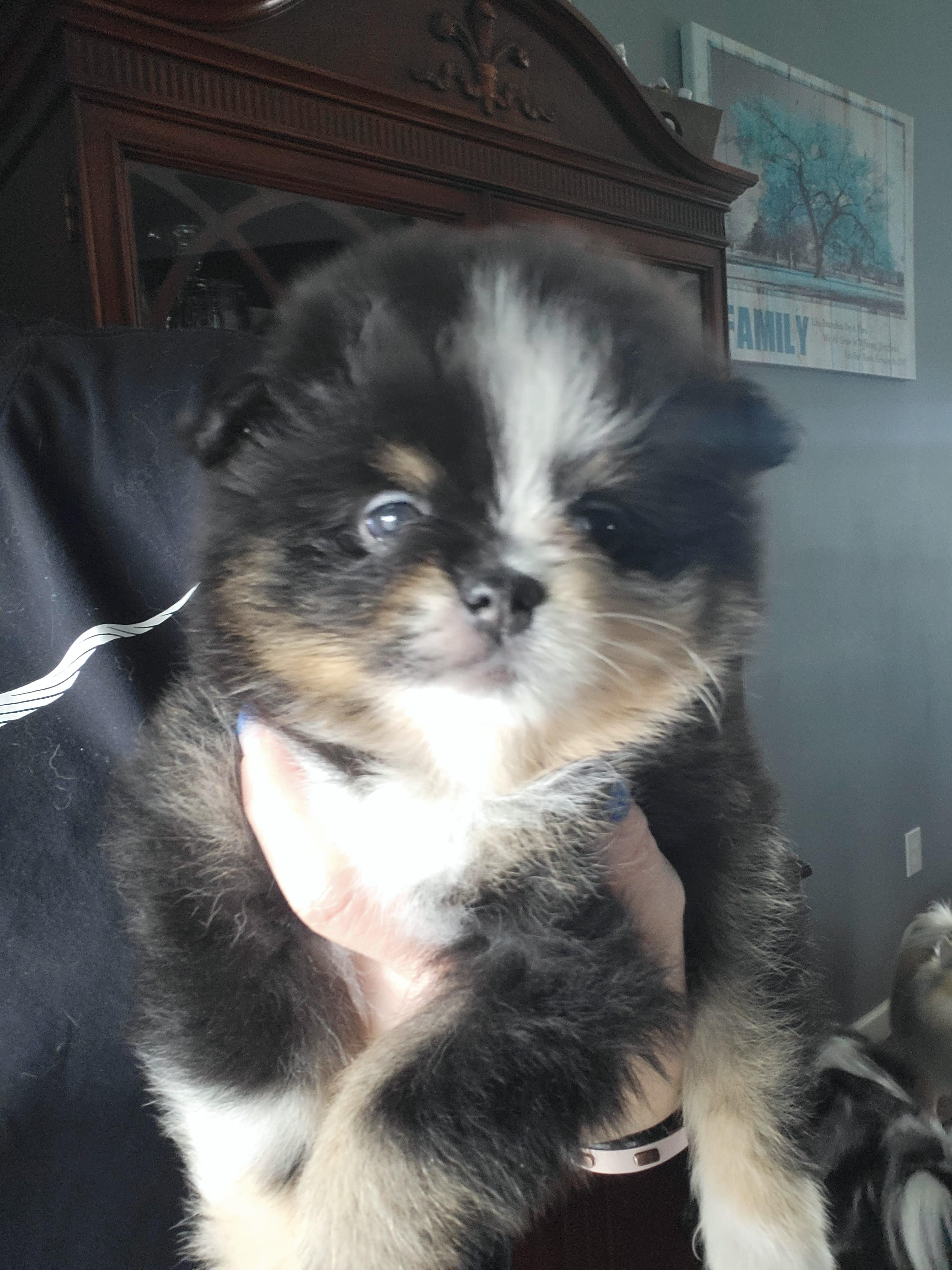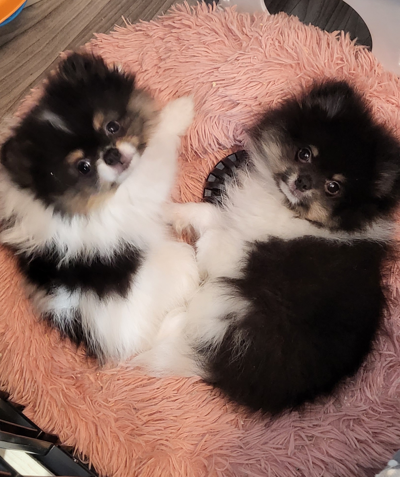 Our Pomsky puppies include black and white, chocolate, and red and white. Pomeranian puppies include black, blue, tri-colored, chocolate and tan, and black and tan. Colors will vary depending on the parent dogs.