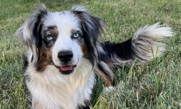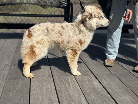 Dally has such a wonderful personality! She loves cuddles and to be right by your side. Loves to play fetch, children, horses and cattle. She is medium drive. She has pretty blue eyes.