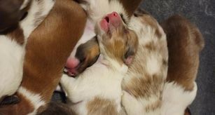 Our puppies include sable merle and white and sable and white. Colors will vary depending on the parent dogs.