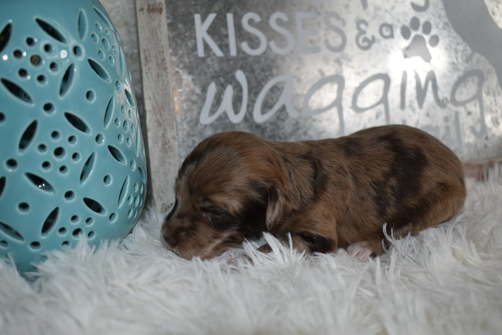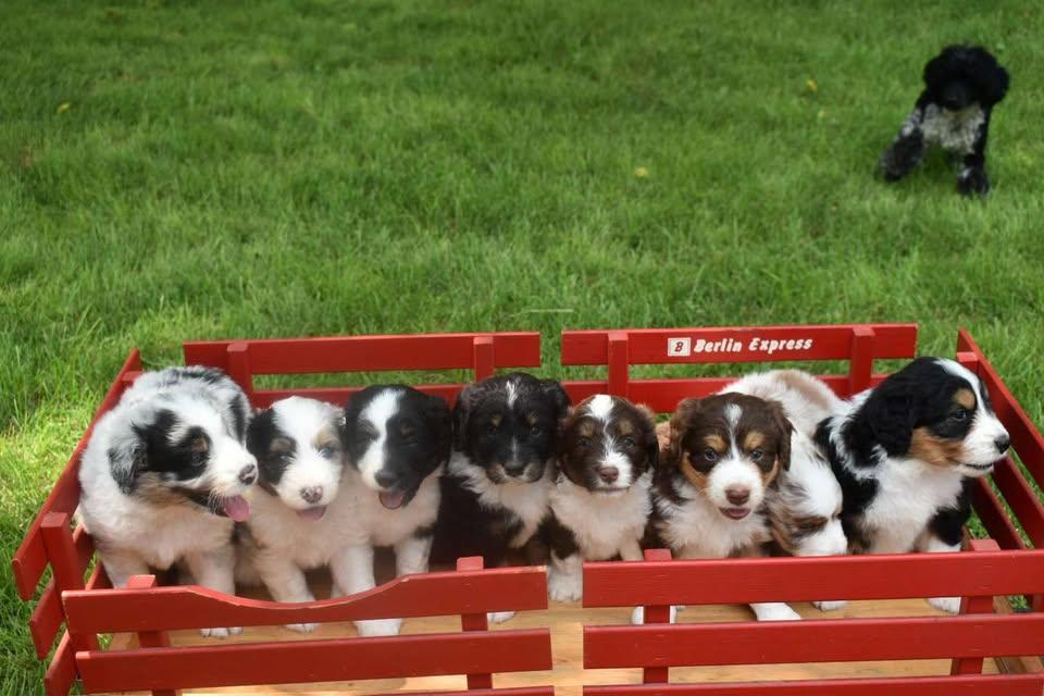Our Goldendoodle puppies include apricot, red, and parti. Aussiedoodle puppies include brown and white, blue merle, red merle, black phantom, black tri-color, red phantom, and red tri-color. Colors will vary depending on the parent dogs.