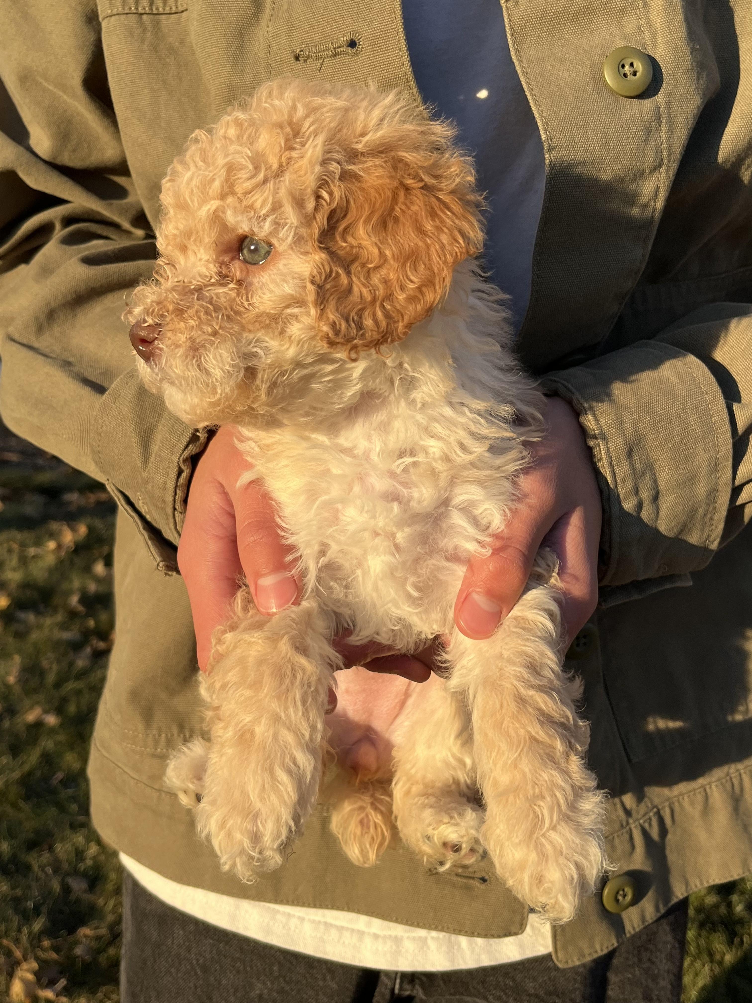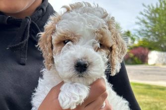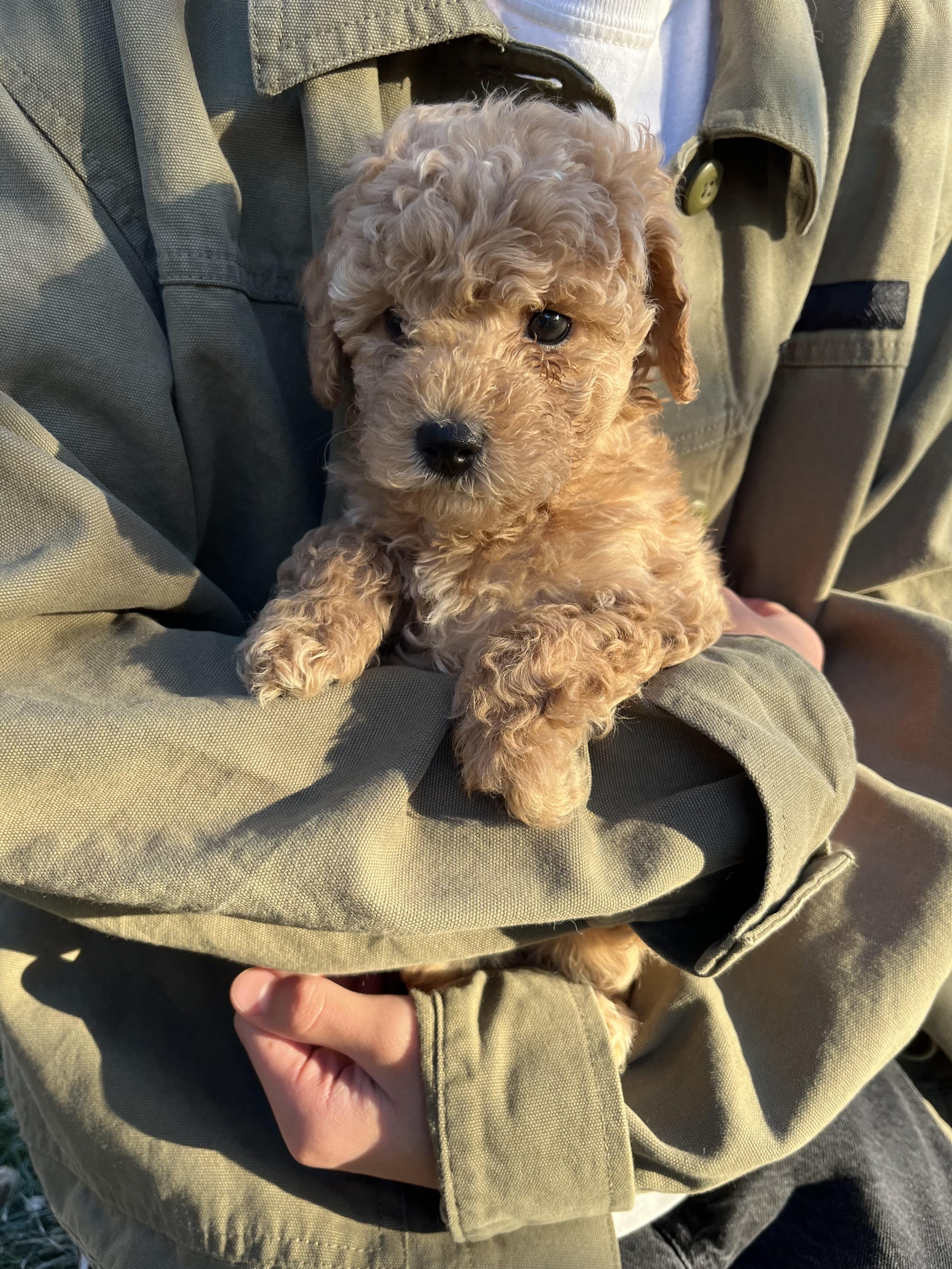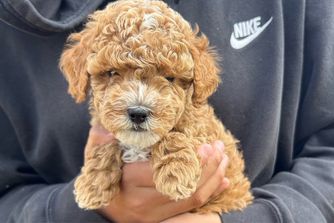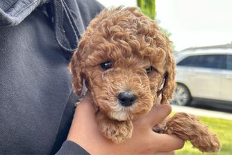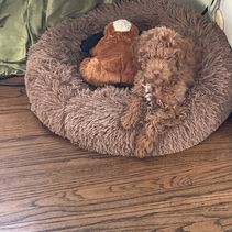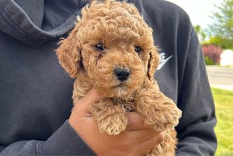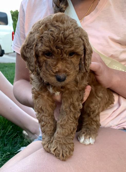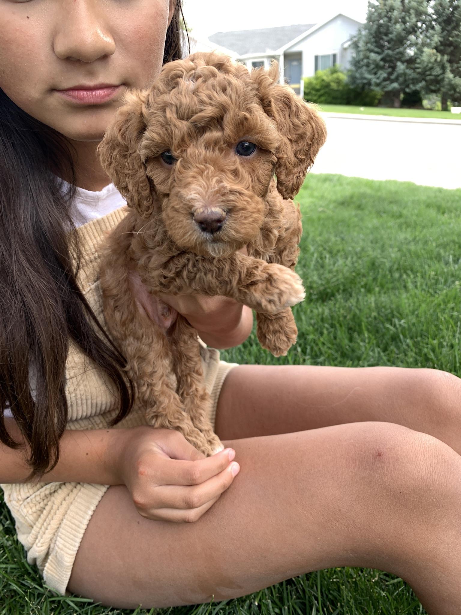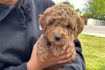 Our Maizy, their mom, is a sweet and cuddly 18 lbs apricot AKC Moyen minipoodle. She comes from a line of therapy dogs. Maizy loves to snuggle, go for walks, hiking, and playing on the beach, plays nicely with other dogs, and likes to go on car rides with the family to California. She has been health tested through Embark - 100% clear of any genetic disorders and OFA tested hips, elbows, patellas - 100% clear.