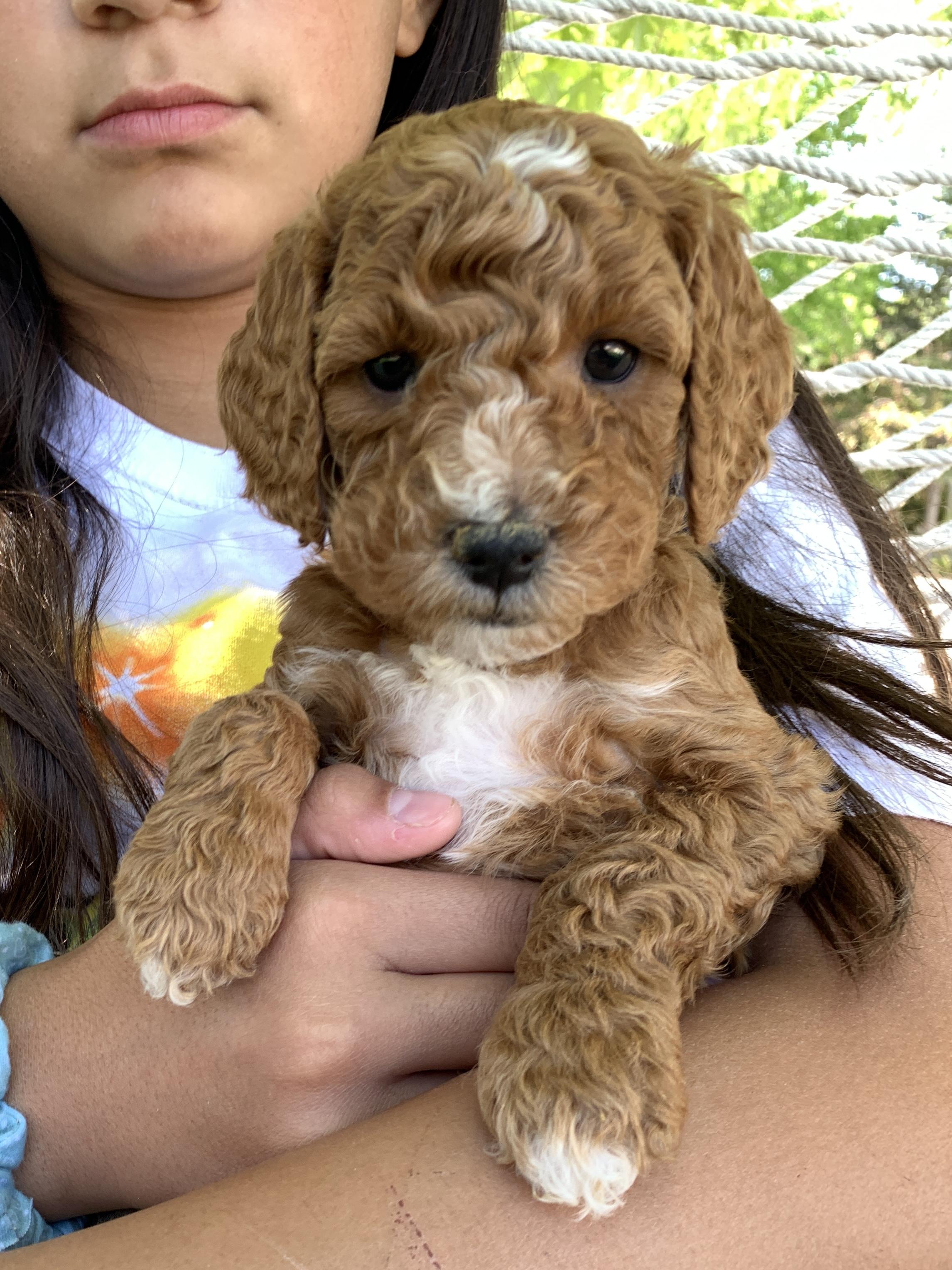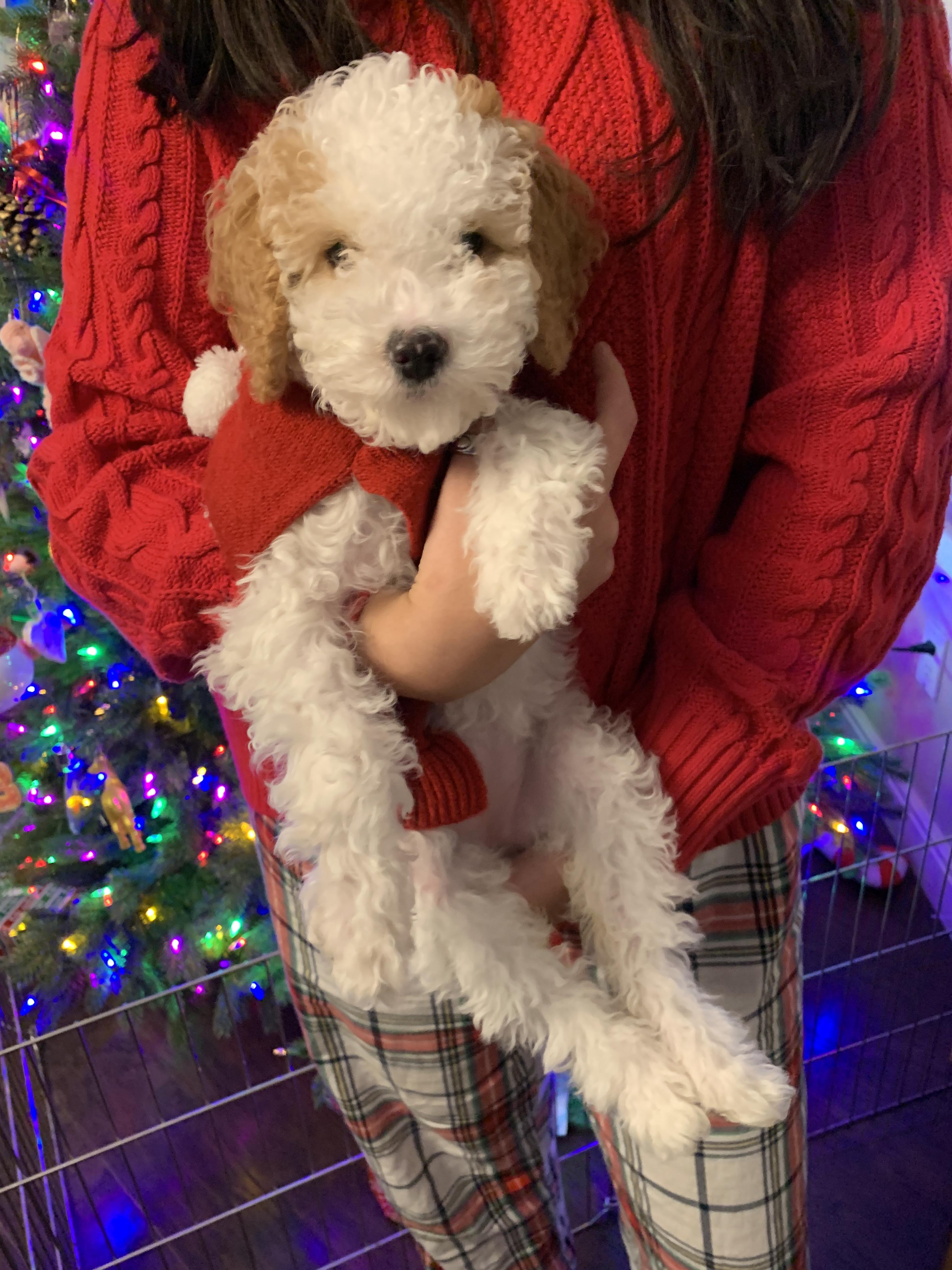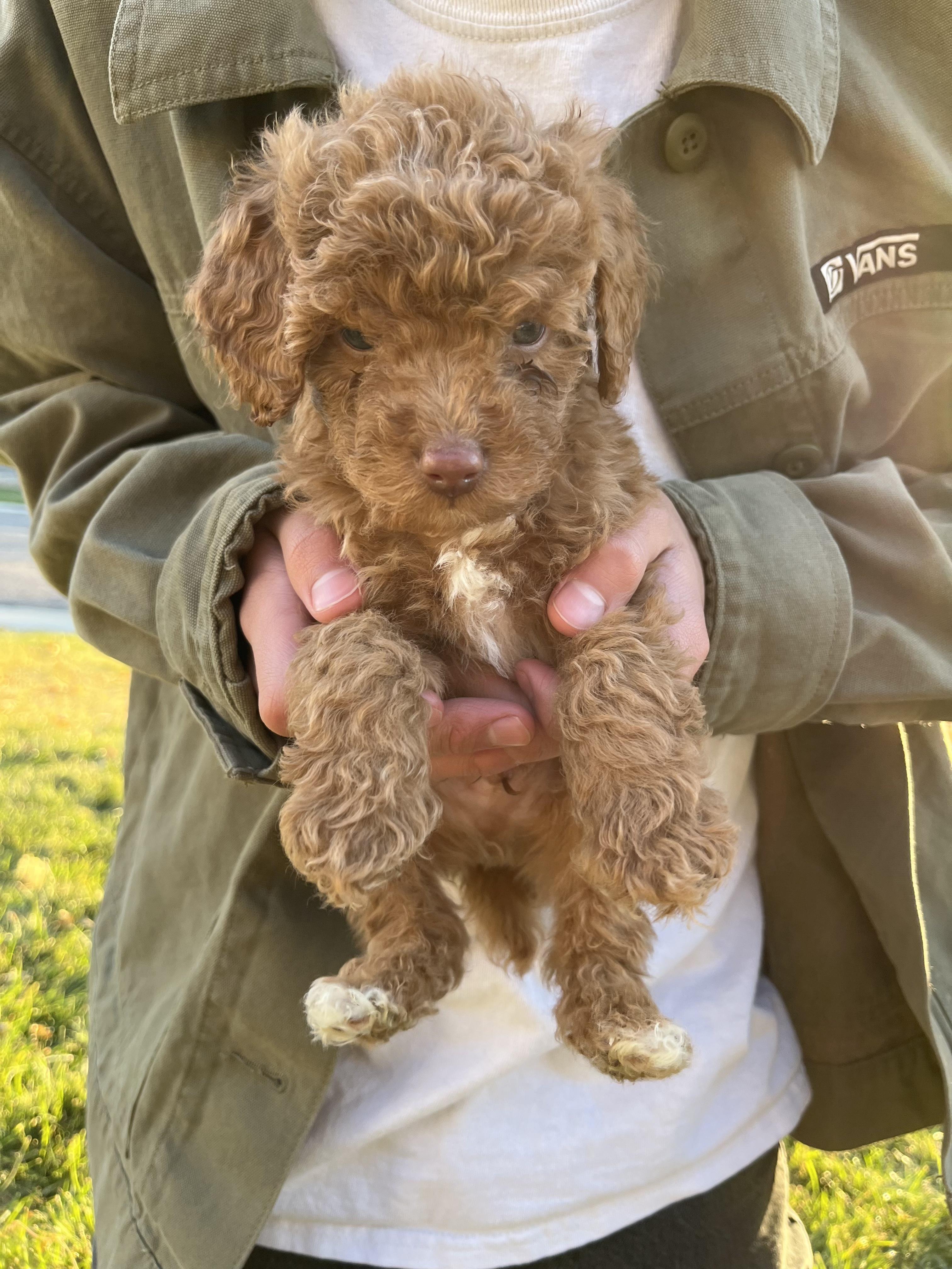 Our Maizy, their mom, is a sweet and cuddly 18 lbs apricot AKC Moyen minipoodle. She comes from a line of therapy dogs. Maizy loves to snuggle, go for walks, hiking, and playing on the beach, plays nicely with other dogs, and likes to go on car rides with the family to California. She has been health tested through Embark - 100% clear of any genetic disorders and OFA tested hips, elbows, patellas - 100% clear.