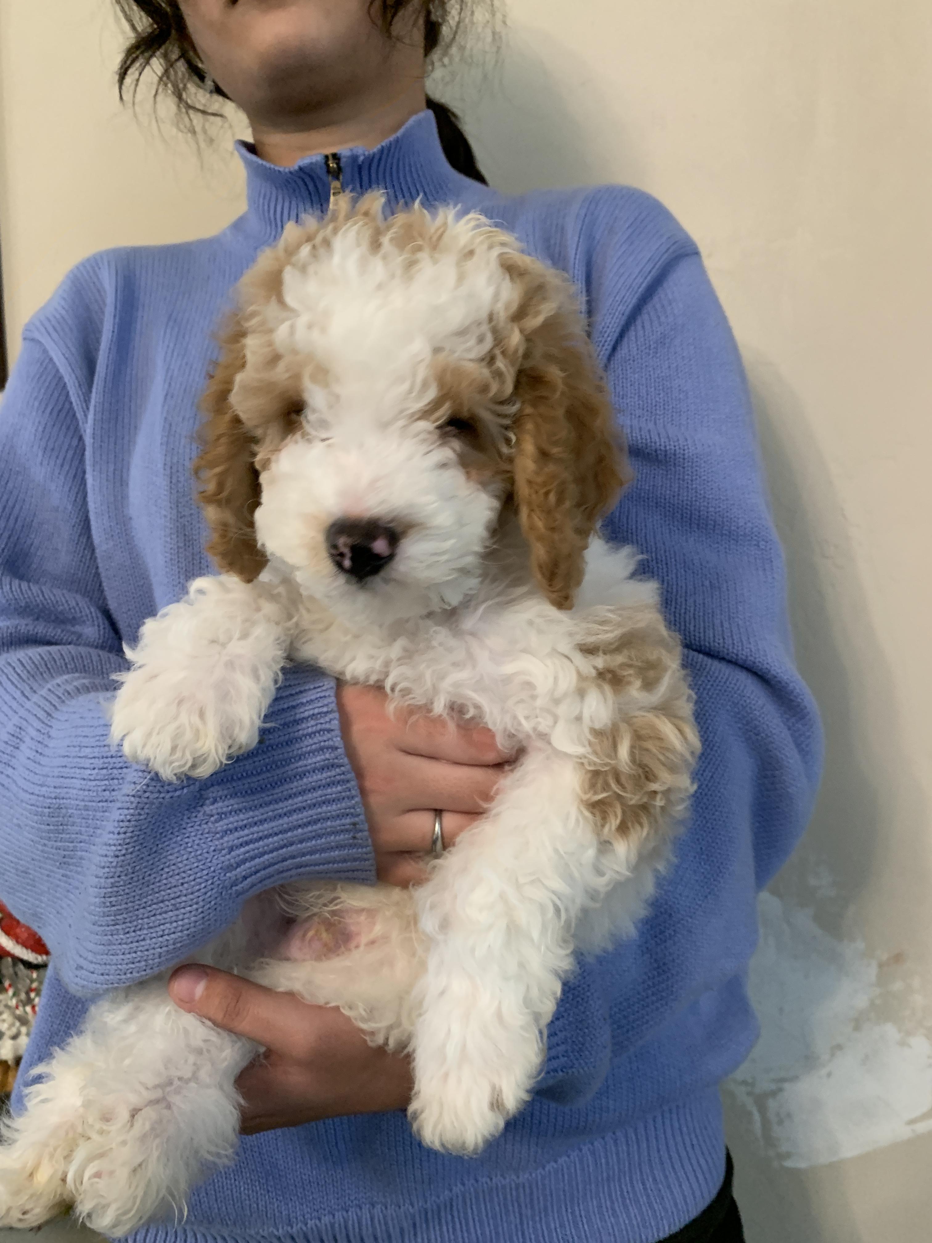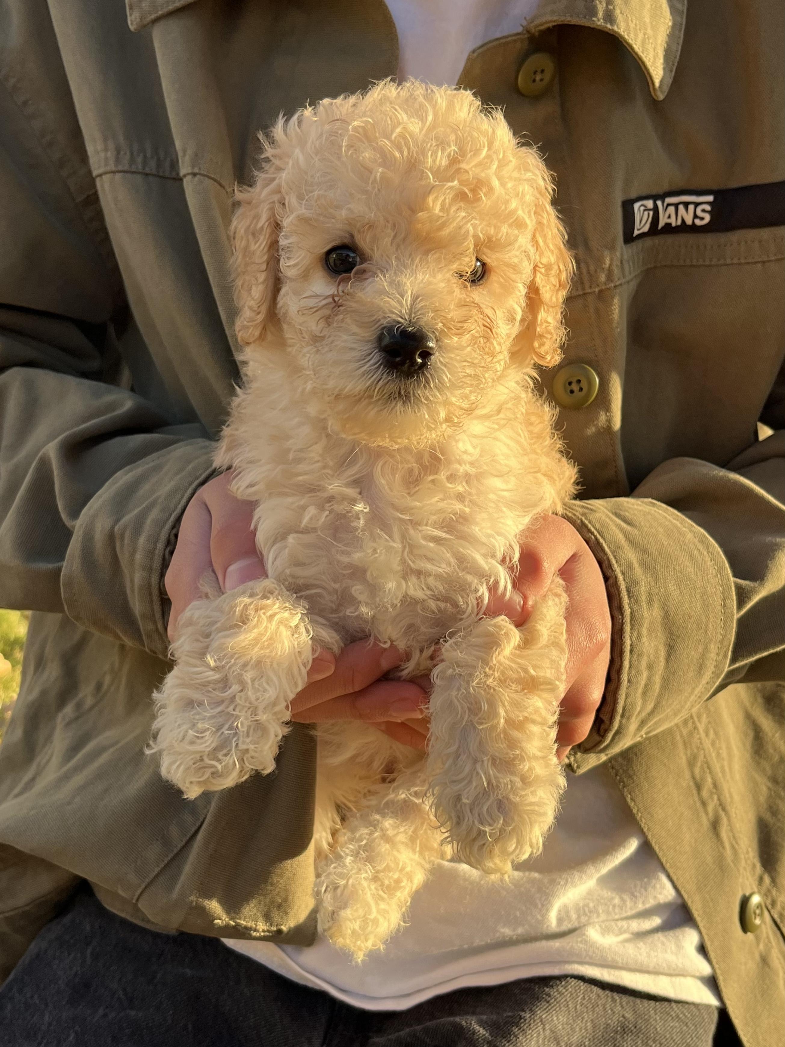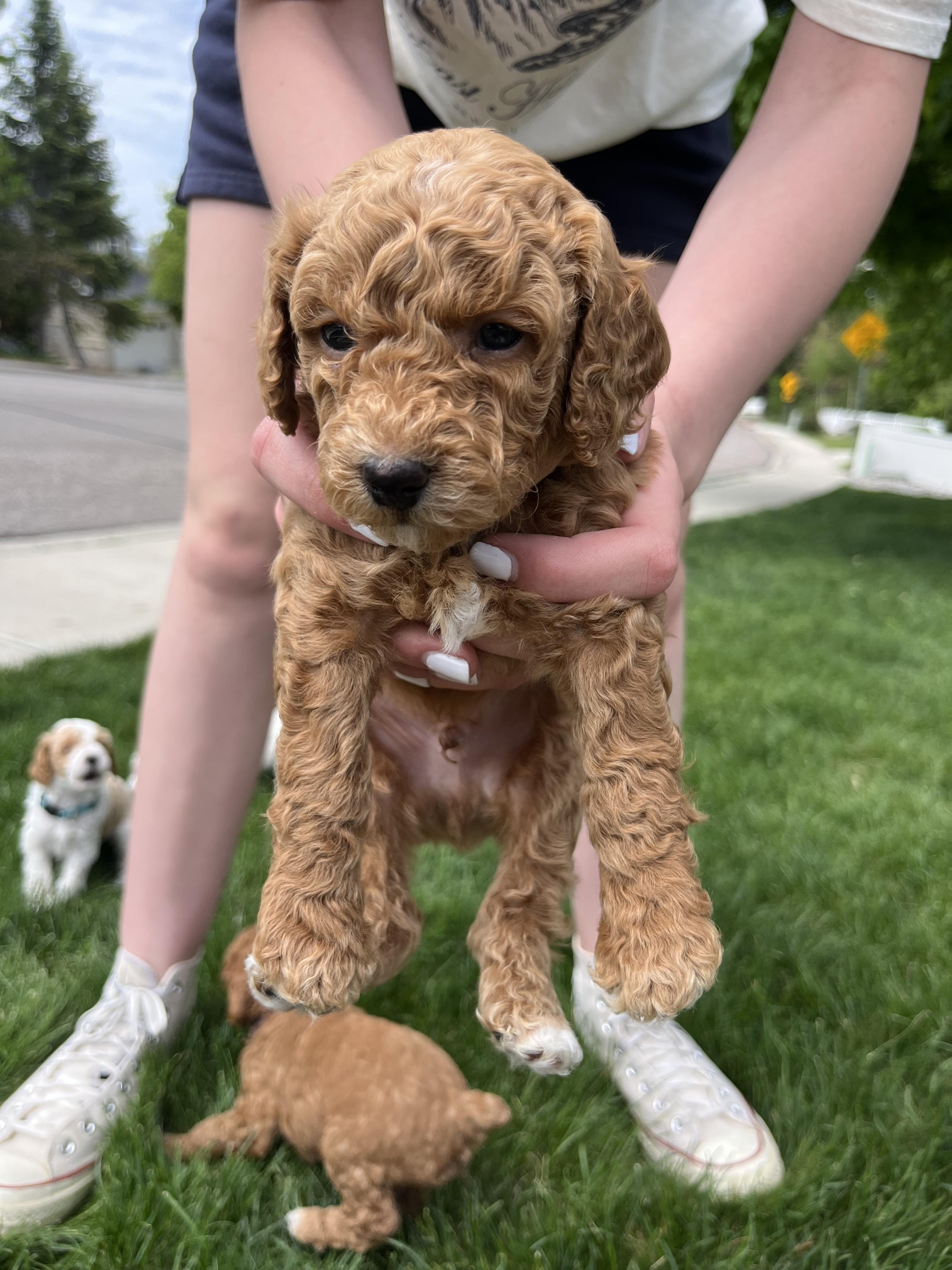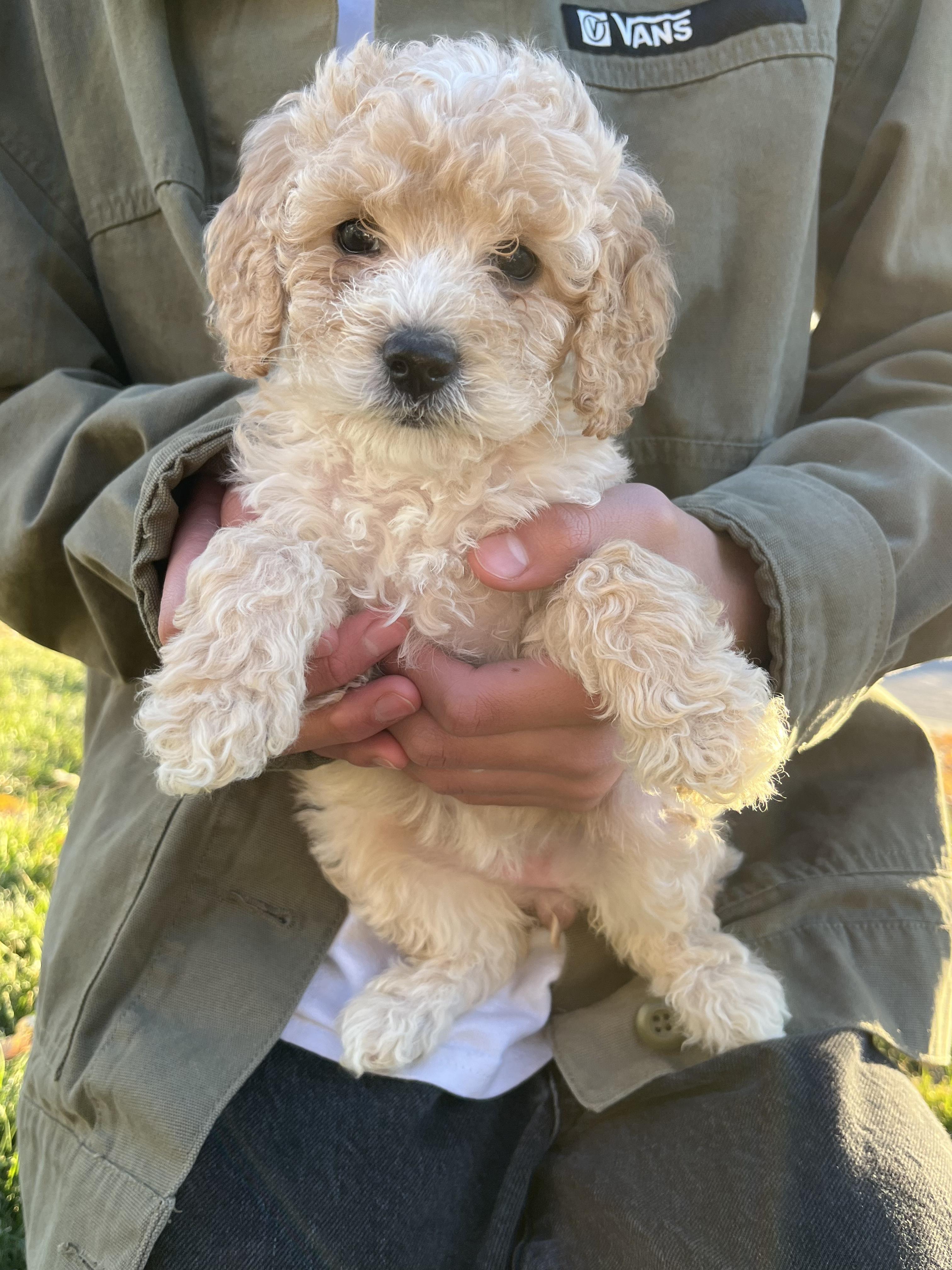 Our Maizy, their mom, is a sweet and cuddly 18 lbs apricot AKC Moyen minipoodle. She comes from a line of therapy dogs. Maizy loves to snuggle, go for walks, hiking, and playing on the beach, plays nicely with other dogs, and likes to go on car rides with the family to California. She has been health tested through Embark - 100% clear of any genetic disorders and OFA tested hips, elbows, patellas - 100% clear.