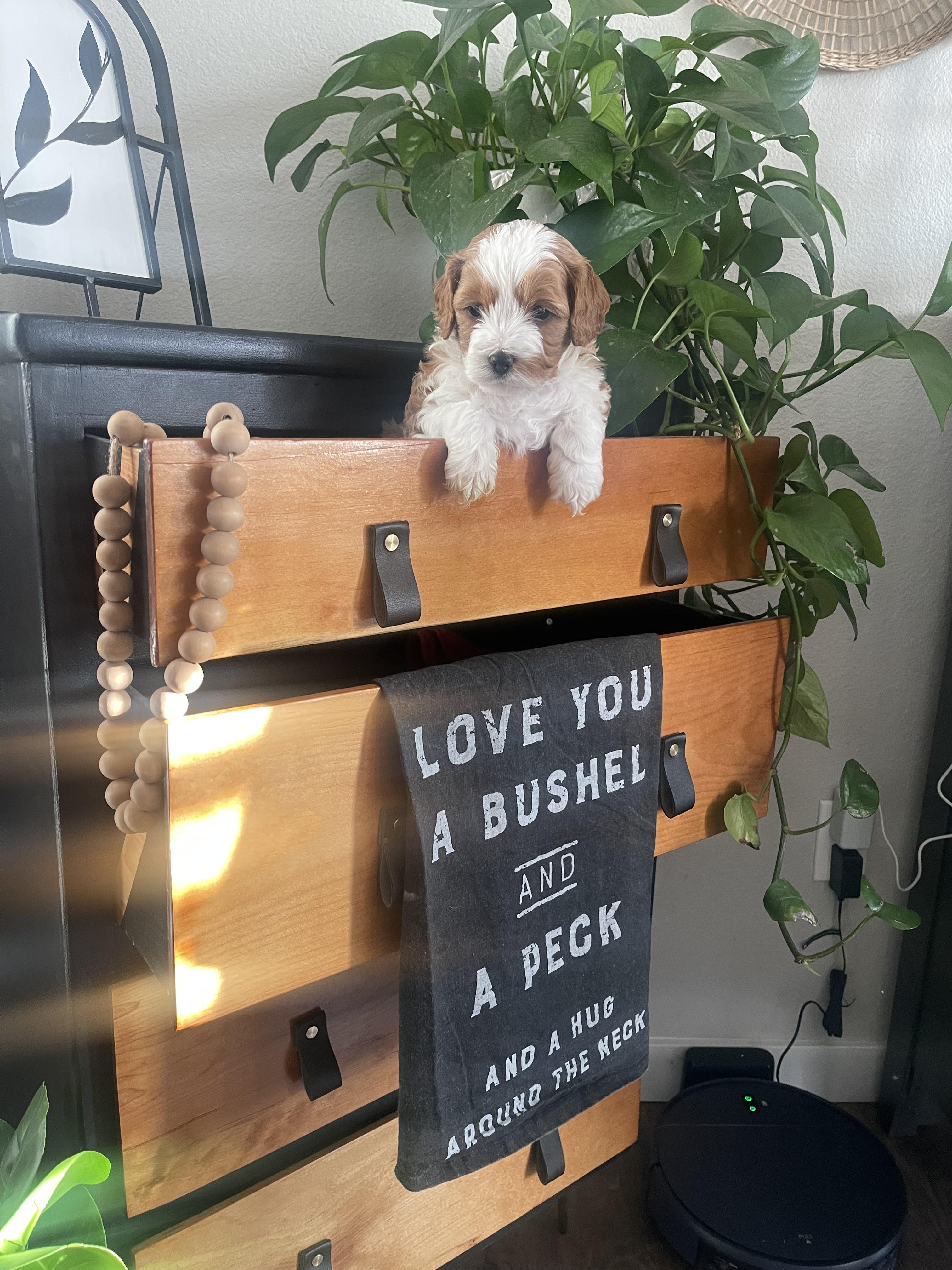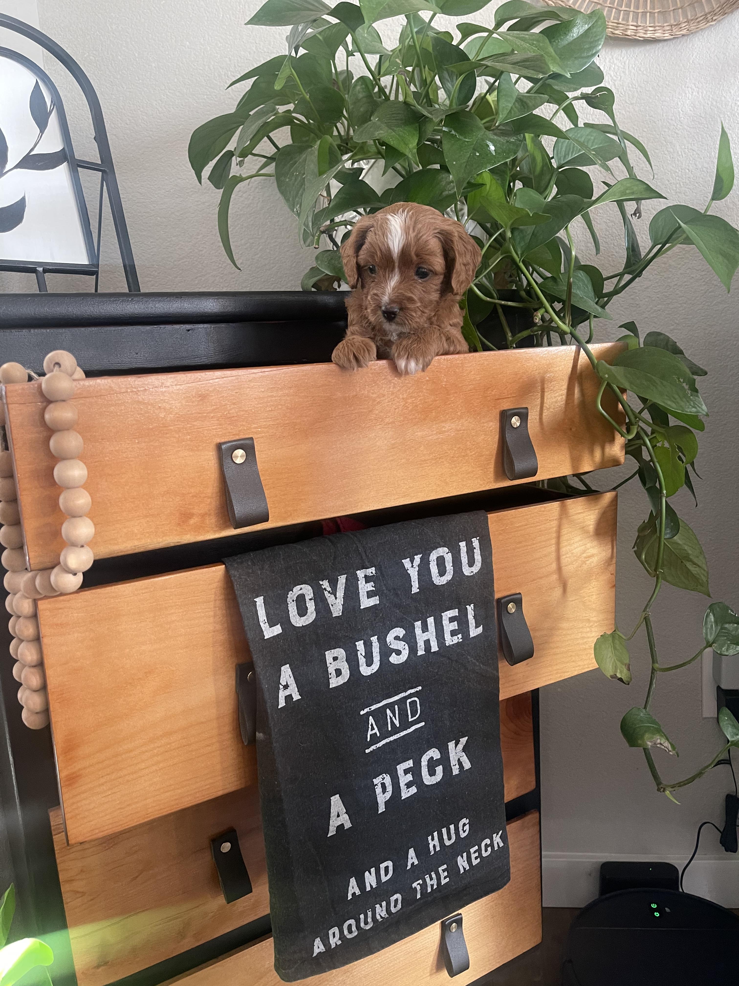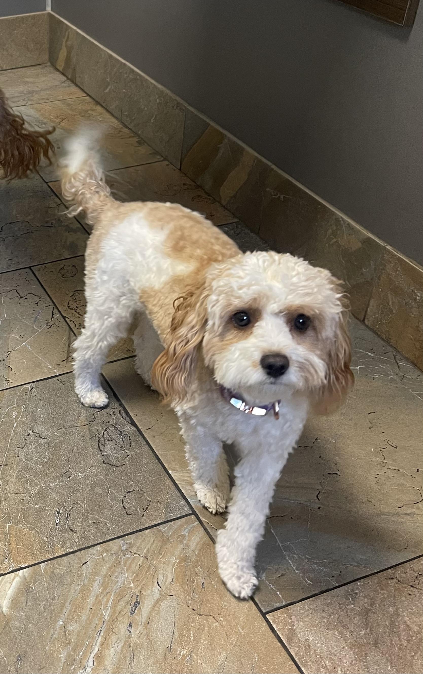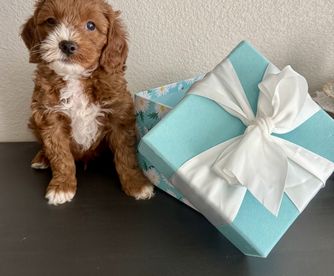 Our Cavapoo puppies include merle, red, cream, and apricot. Goldendoodle puppies include apricot, red, and parti. Colors will vary depending on the parent dogs.