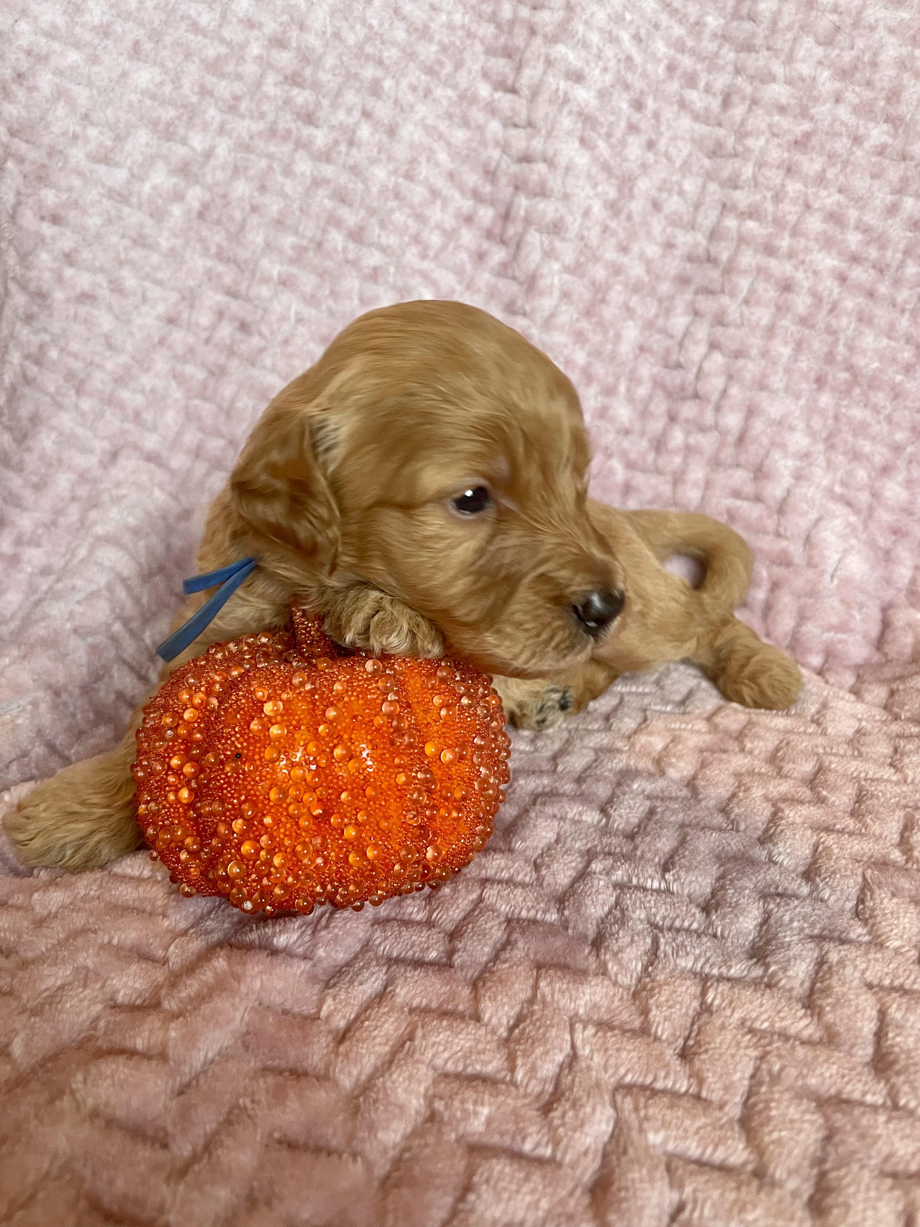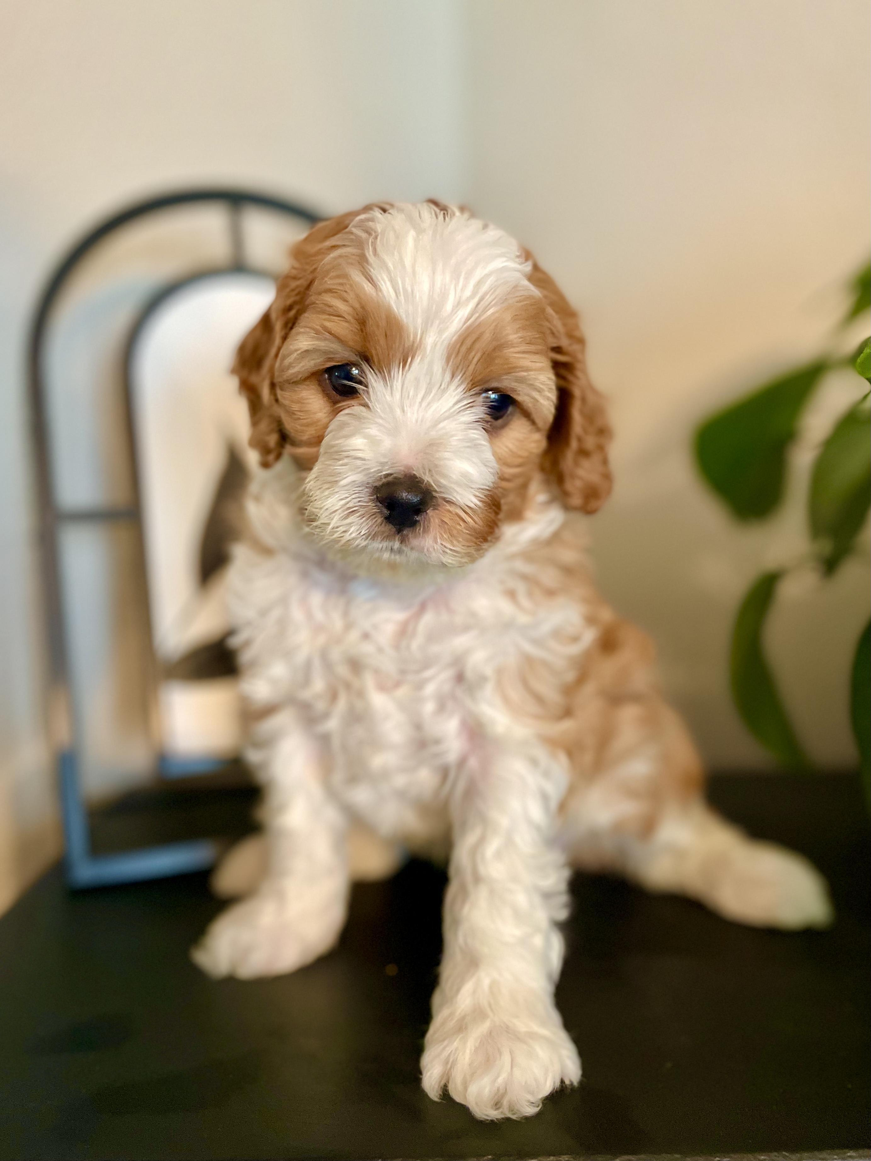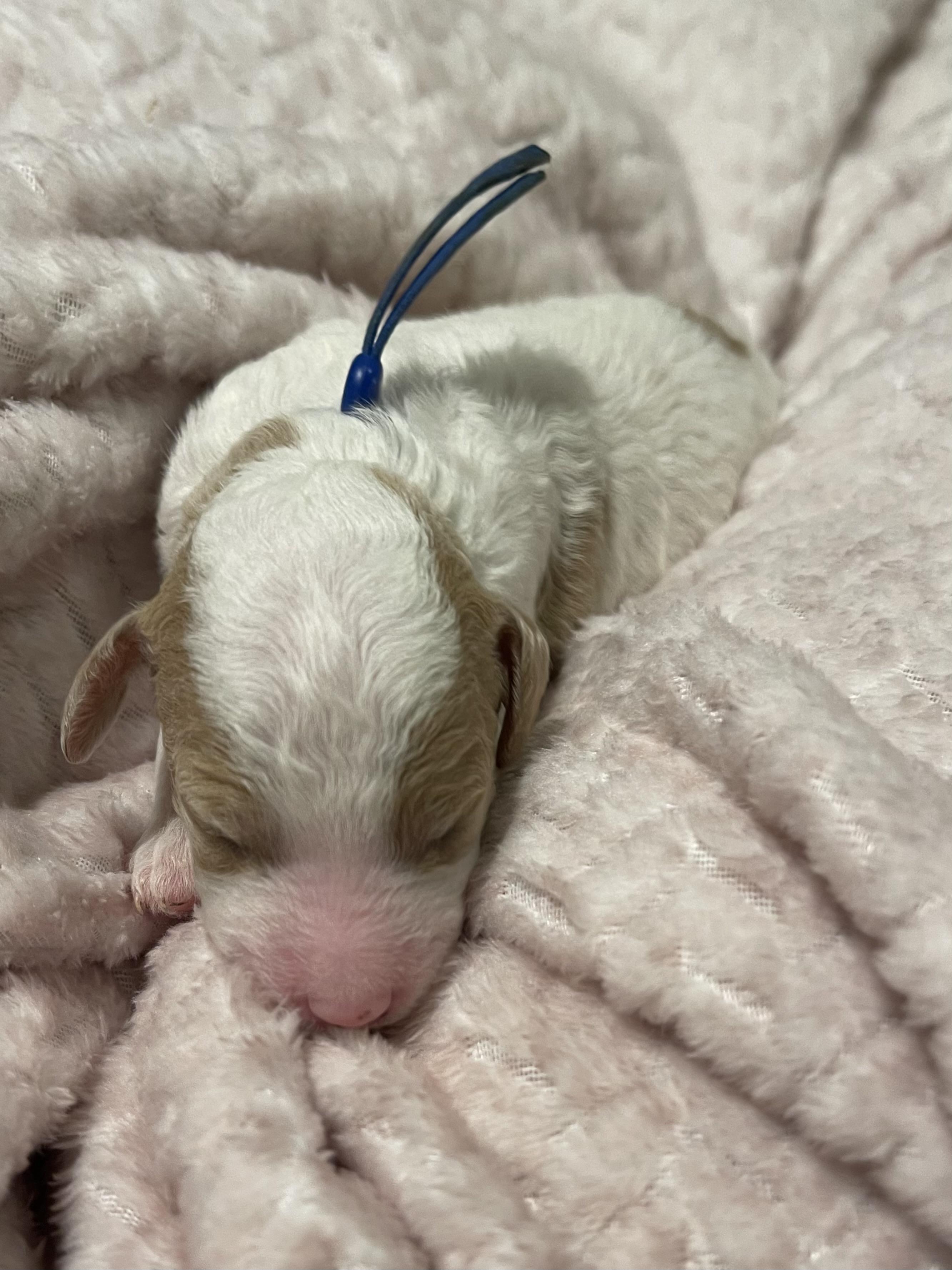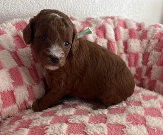 Our Cavapoo puppies include merle, red, cream, and apricot. Goldendoodle puppies include apricot, red, and parti. Colors will vary depending on the parent dogs.