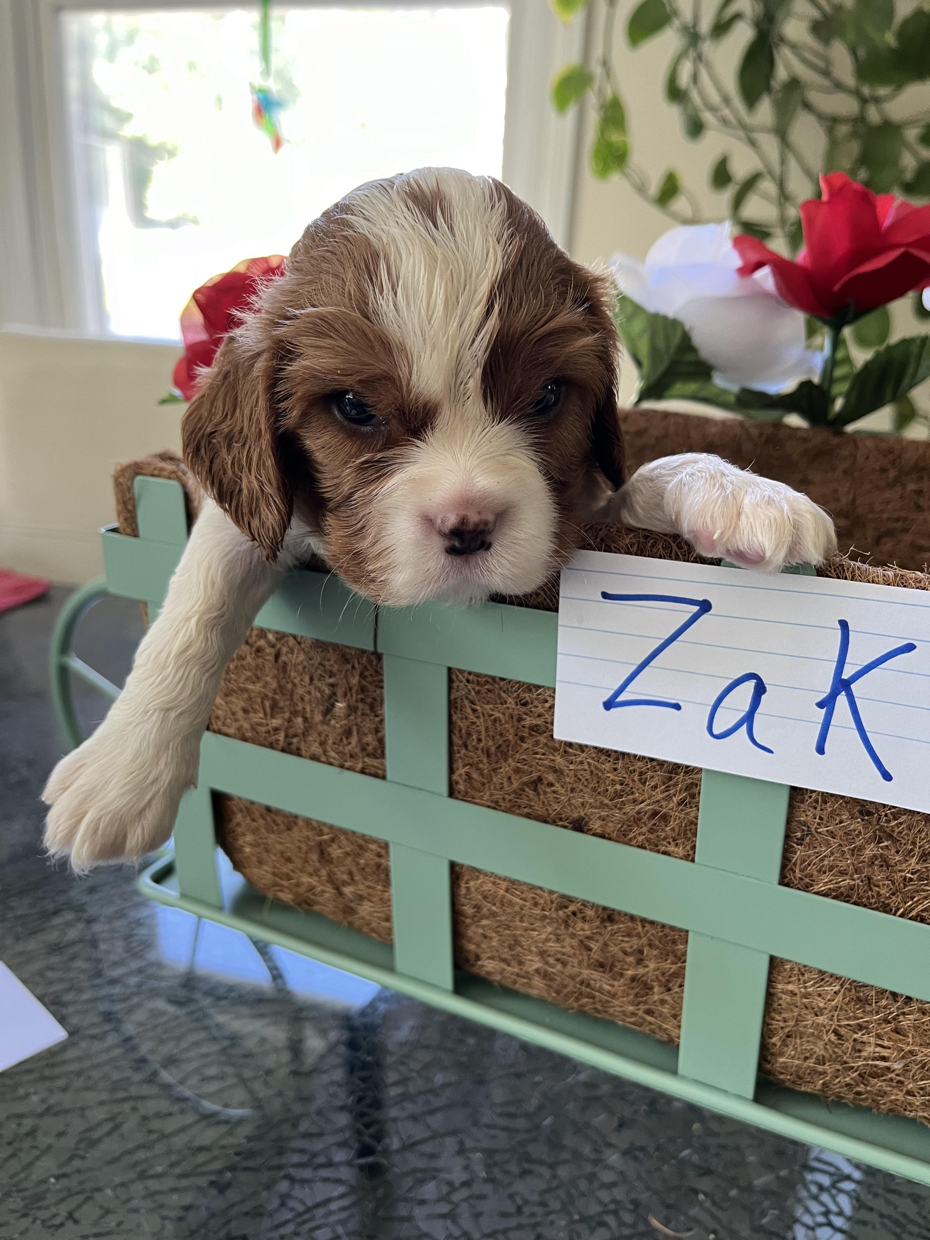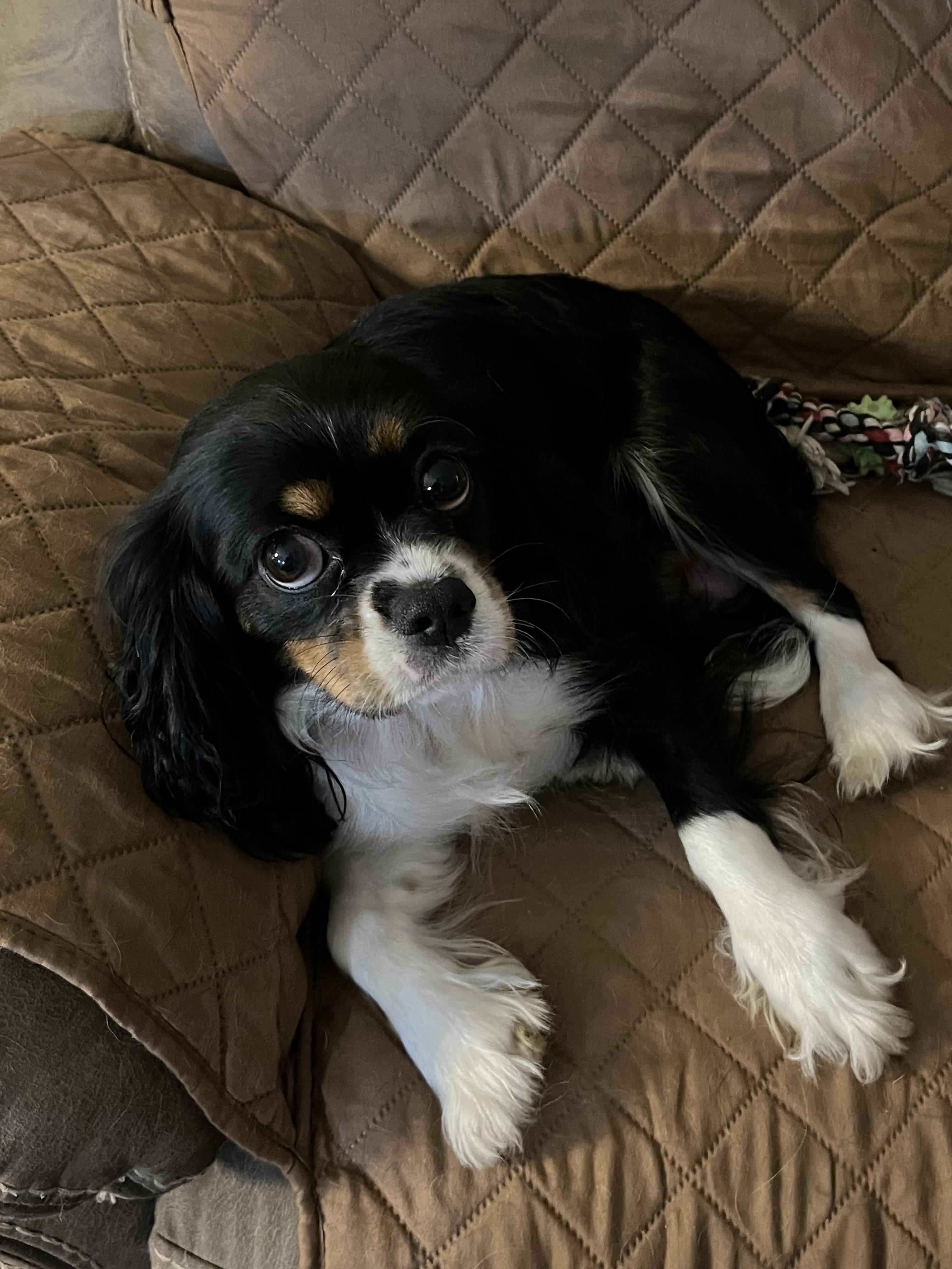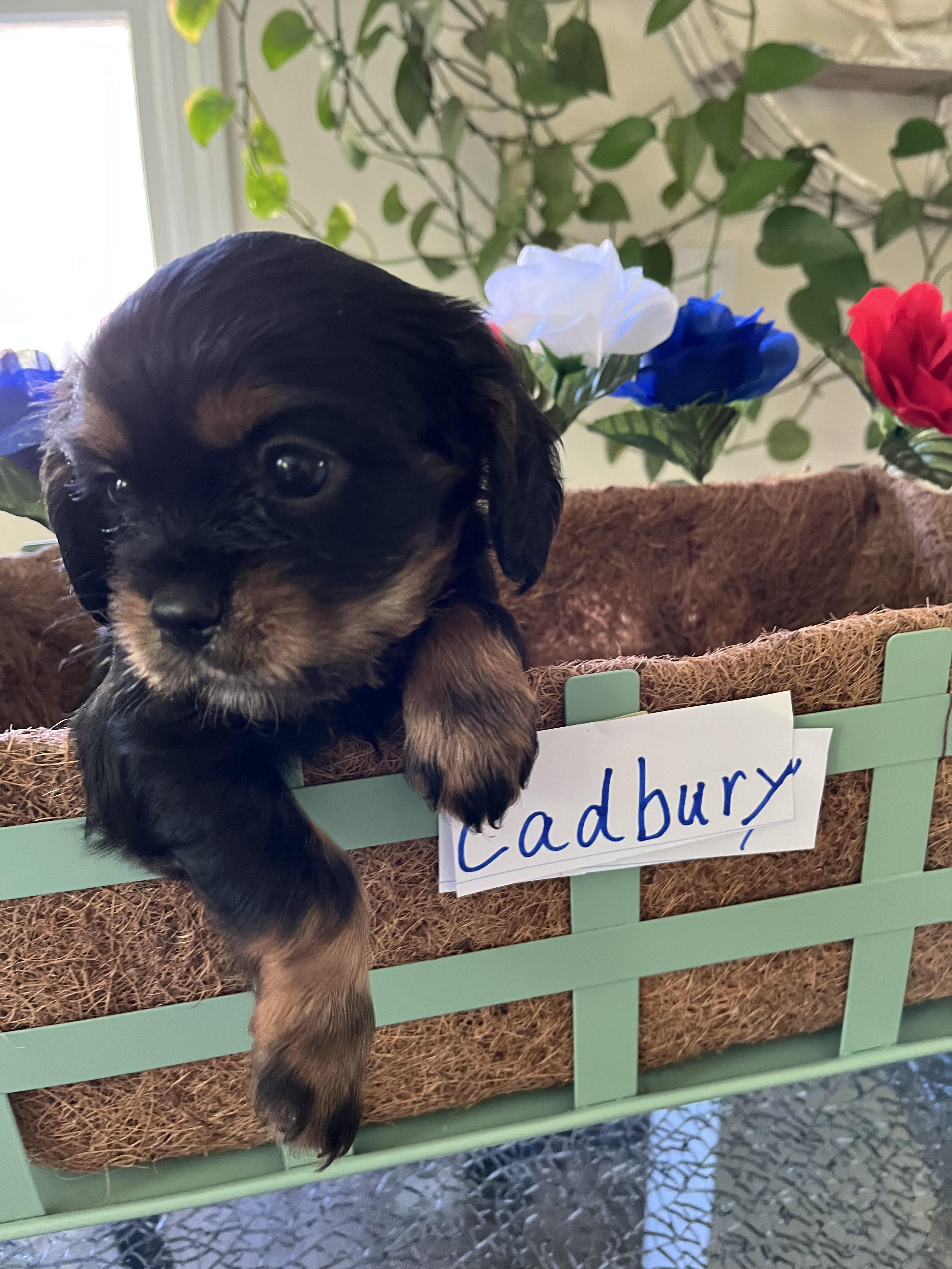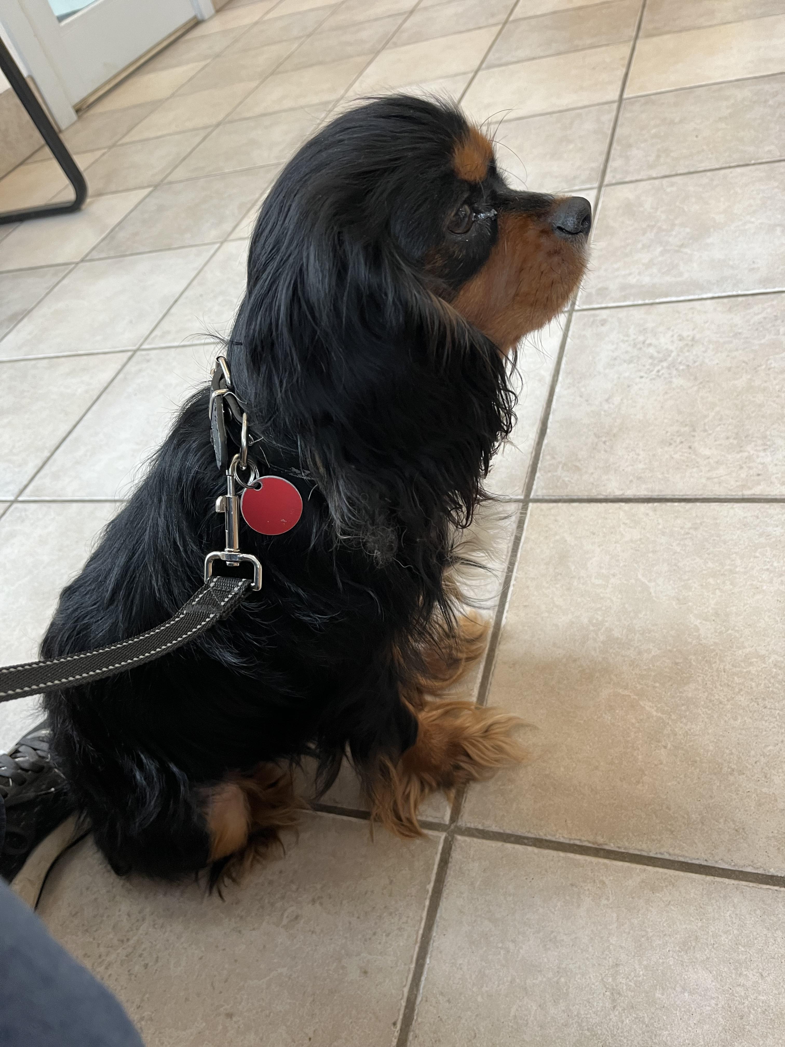 Tango is a beautiful black and tan cavalier with a gentle and friendly personality. He weighs 19 pounds ad has long wavy fur, a touch of white on his chest and he carries the chocolate gene.