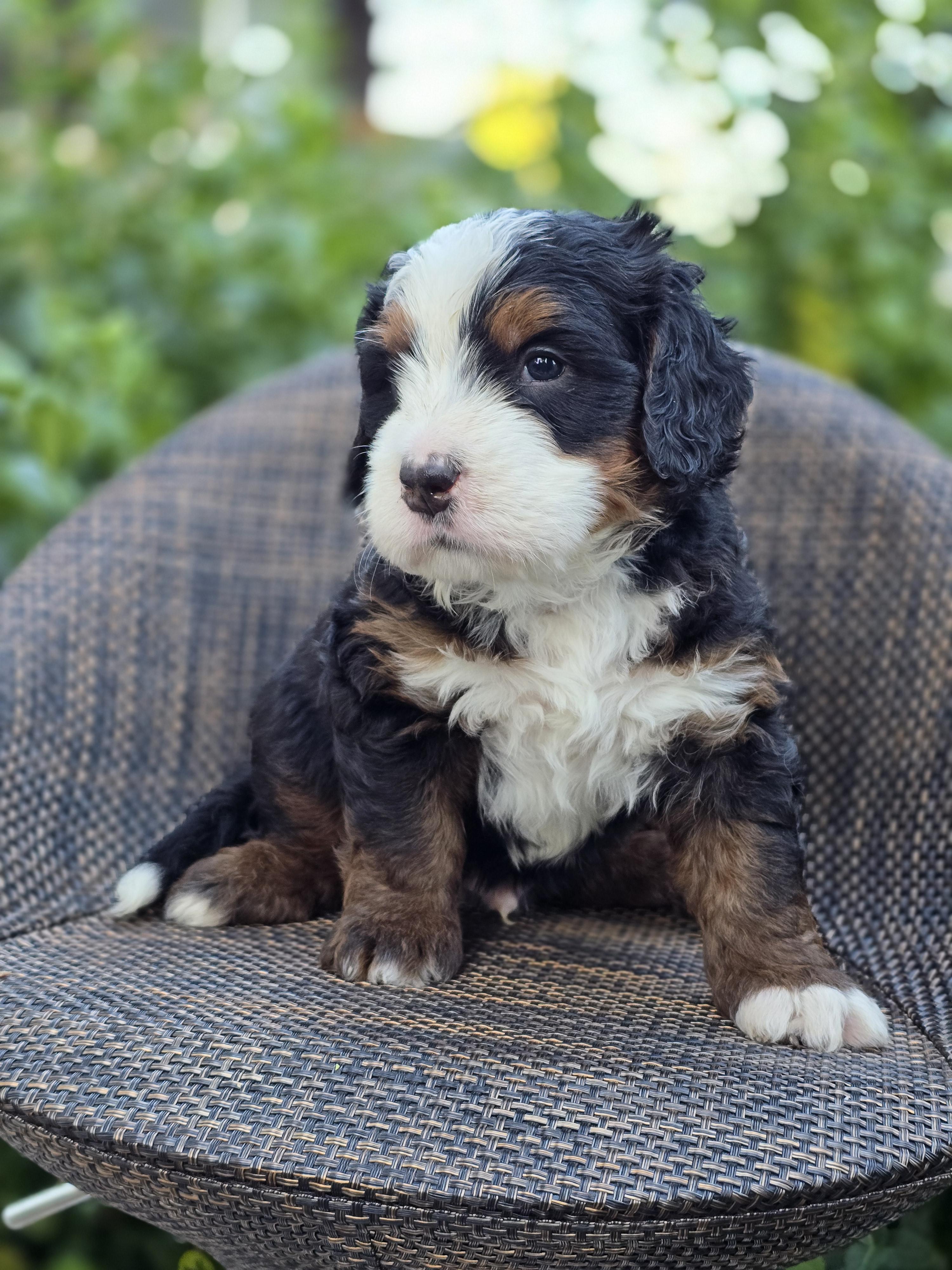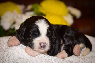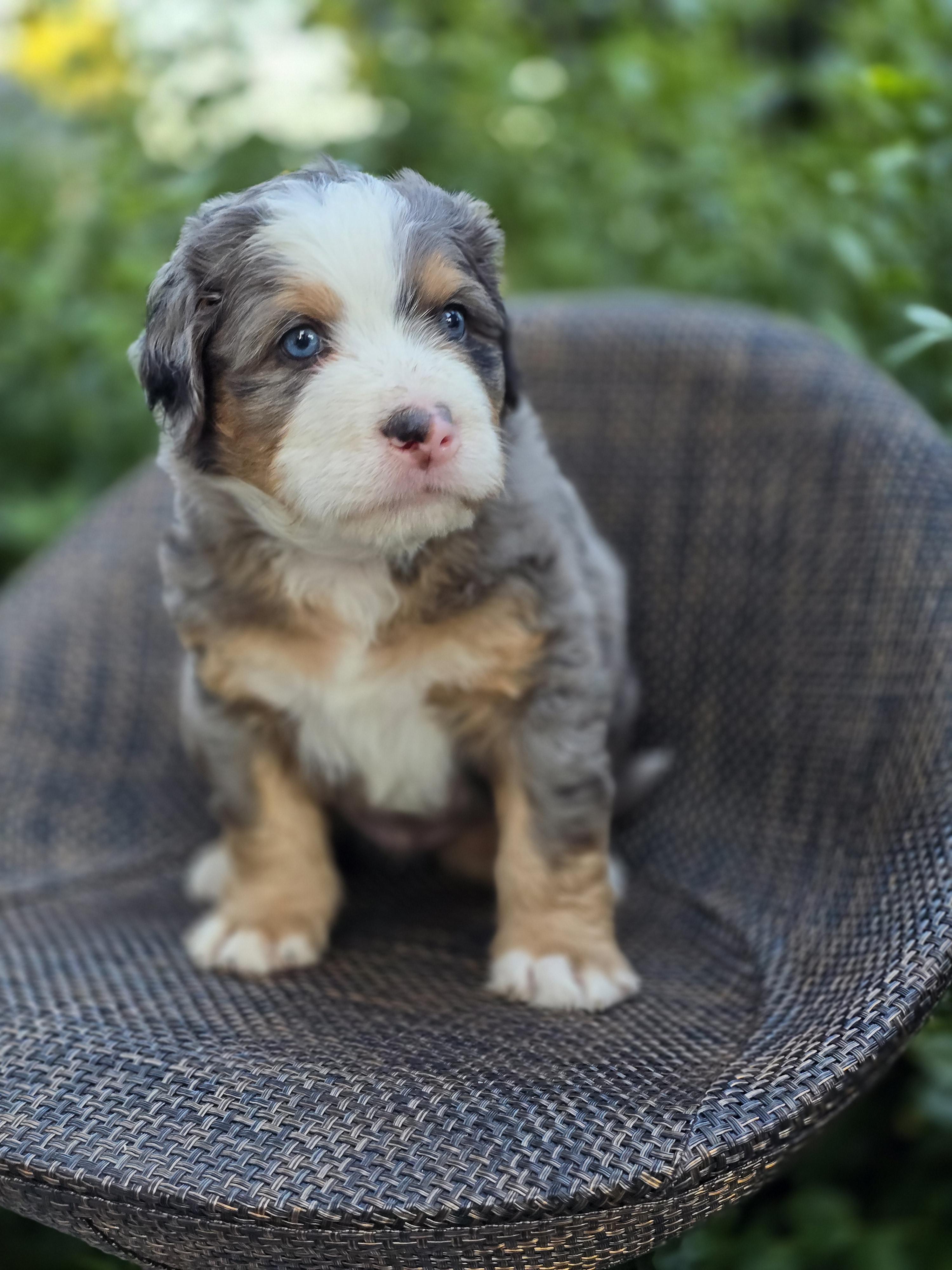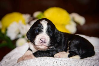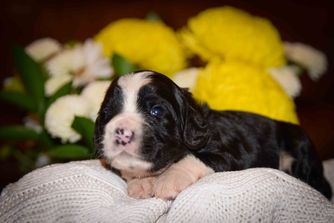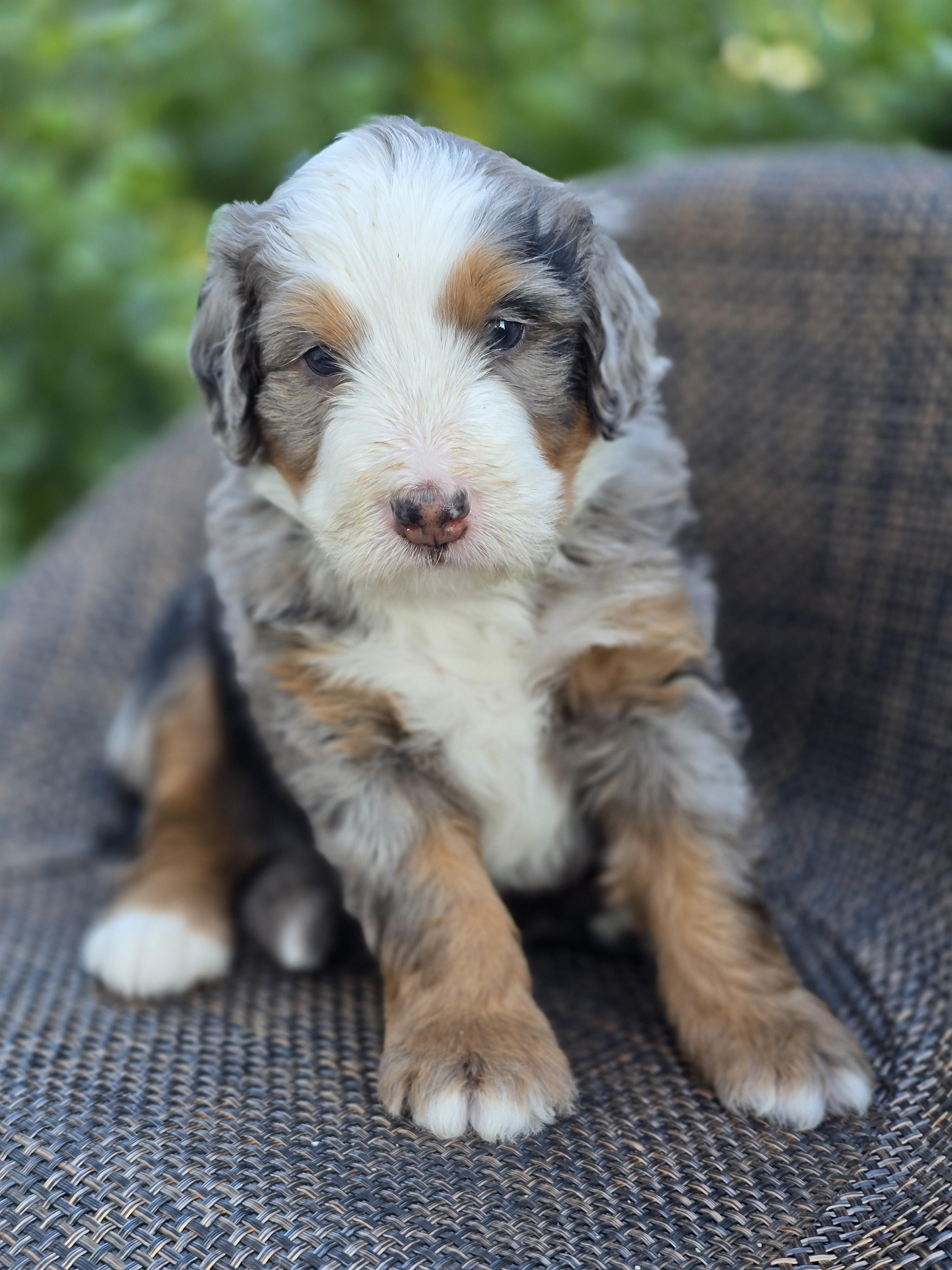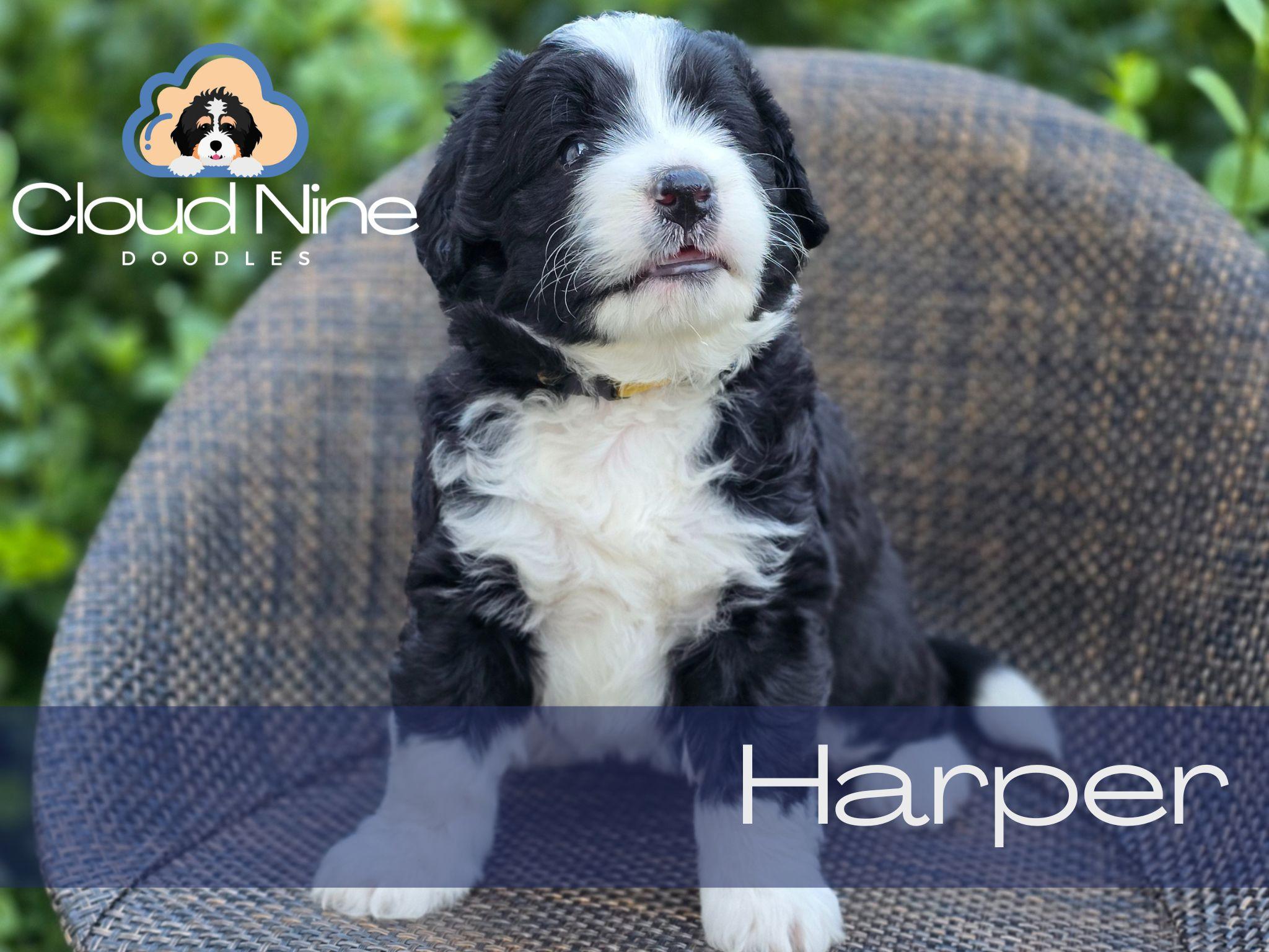 Our Double Doodle puppies include dark golden, white, black, cream, parti, golden, chocolate, and apricot. Bernedoodle puppies include black and white, tri-color, phantom, and blue merle. Colors will vary depending on the parent dogs.