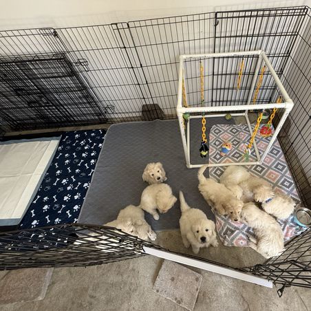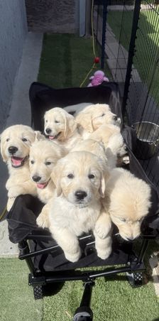 Our Australian Shepherd puppies include red merle, blue merle, black tri-color, and red tri-color. Golden Retriever puppies are light golden. Colors will vary depending on the parent dogs.