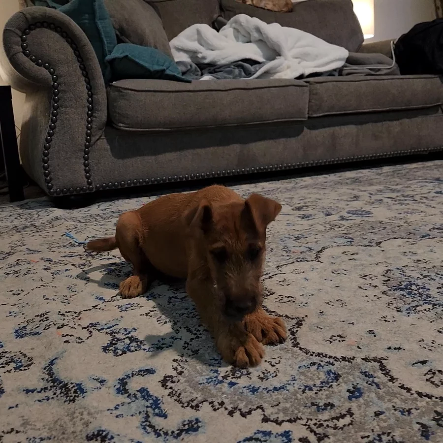We found Cloverdell Irish and Fitz, formerly known as Chip, on the Good Dog app. Millie was very friendly and easy to work with. She answered all of our questions and loaded us up with all the info we needed. Cloverdell Irish has a very homey atmosphere that made us 100% sure we selected the right breeder. We couldn’t be more happy with Fitz. He is so friendly and eager to please. Our vet even said she had never seen a more affectionate male puppy. He already has a fan club at Lowe’s and Pet Smart. His intelligence level amazes us every day. He loves feeding puzzles and I’ve got a scent training kit coming in this week. Looking forward to some agility training when he’s a little older. So a big thank you to Millie. Fitz is the best! Cheers! Rance & Mad Cleary
