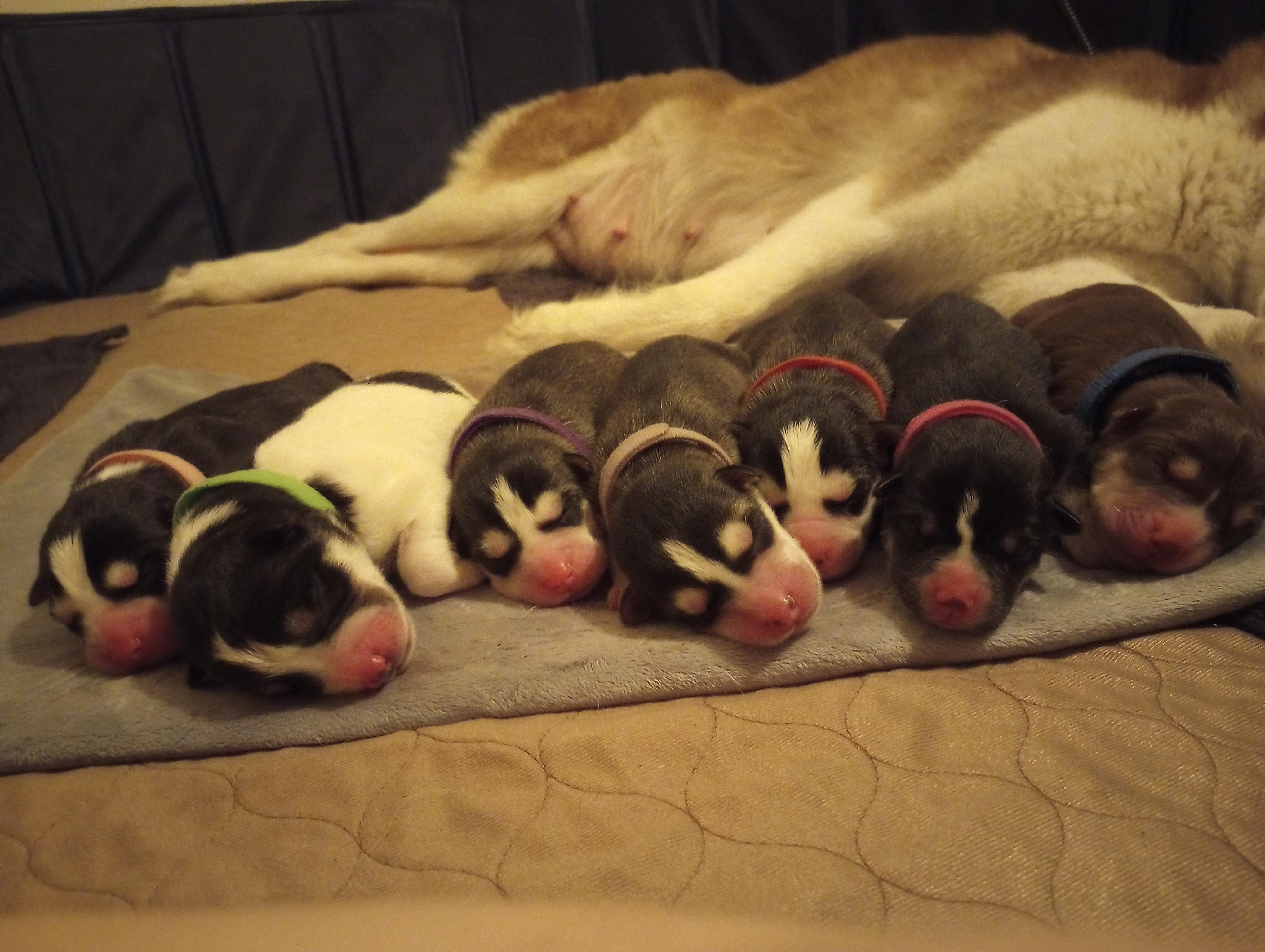 Our puppies include red and white, brown and white, gray and white, black tan and white, black and white, white, and black. Colors will vary depending on the parent dogs.