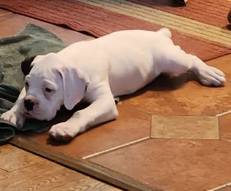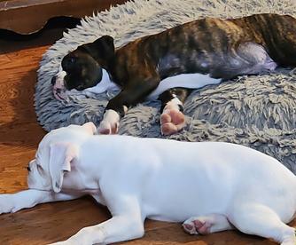 Our puppies include fawn, brindle, and white. Colors will vary depending on the parent dogs.