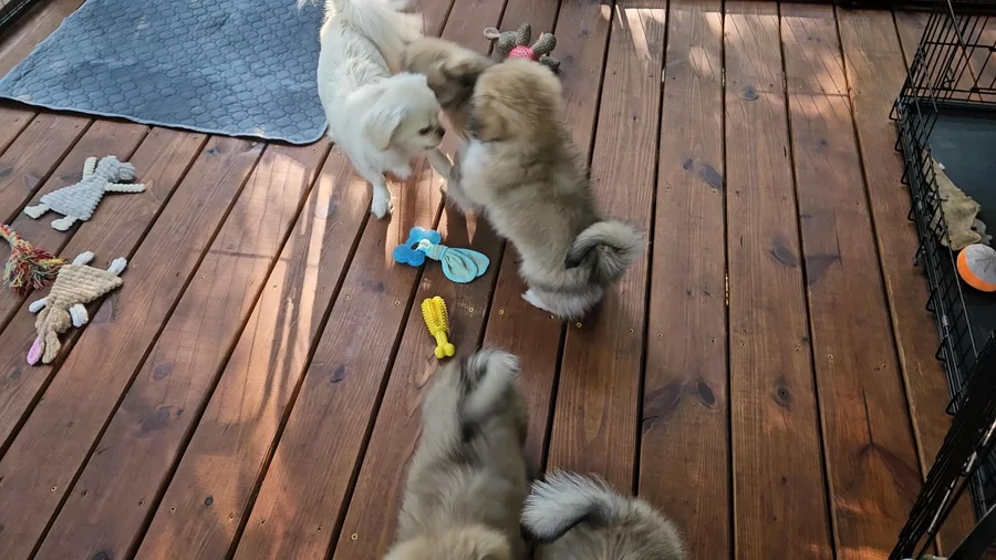 Mom Bijou playing with her pups. 2 will be leaving soon.