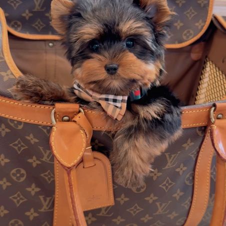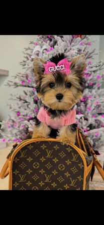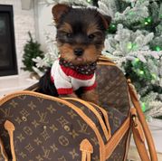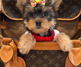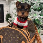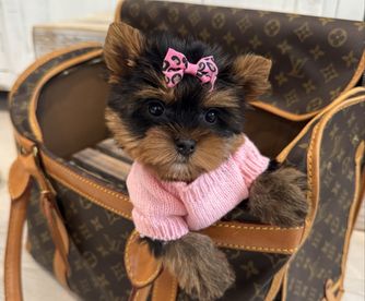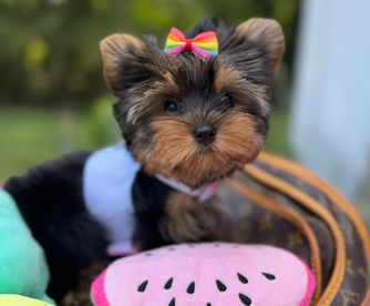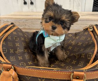 “The puppies come home microchipped along with a puppy pack including bed, folder, food, harness, Vet exam, shot record, health guarantee, bill of sale the Royal Canin Yorkshire Terrier starter food kit. ”
