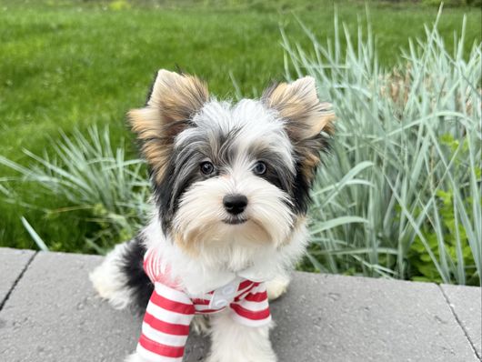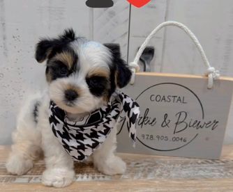 Our Biewer Terrier puppies include blue tan and white and black tan and white. Yorkshire Terrier puppies include parti, blue and gold, black and gold, and black and tan. Colors will vary depending on the parent dogs.