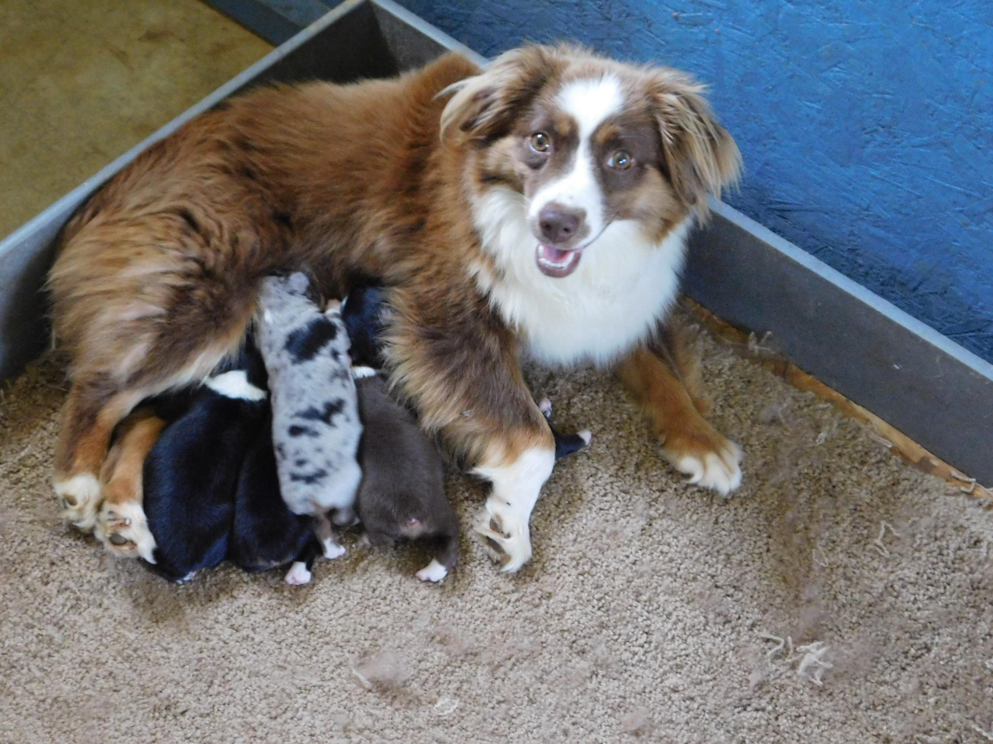 Our Miniature American Shepherd puppies include black, red merle, blue merle, and red. Goldendoodle puppies include cream, apricot, chocolate, black, and parti. Colors will vary depending on the parent dogs.