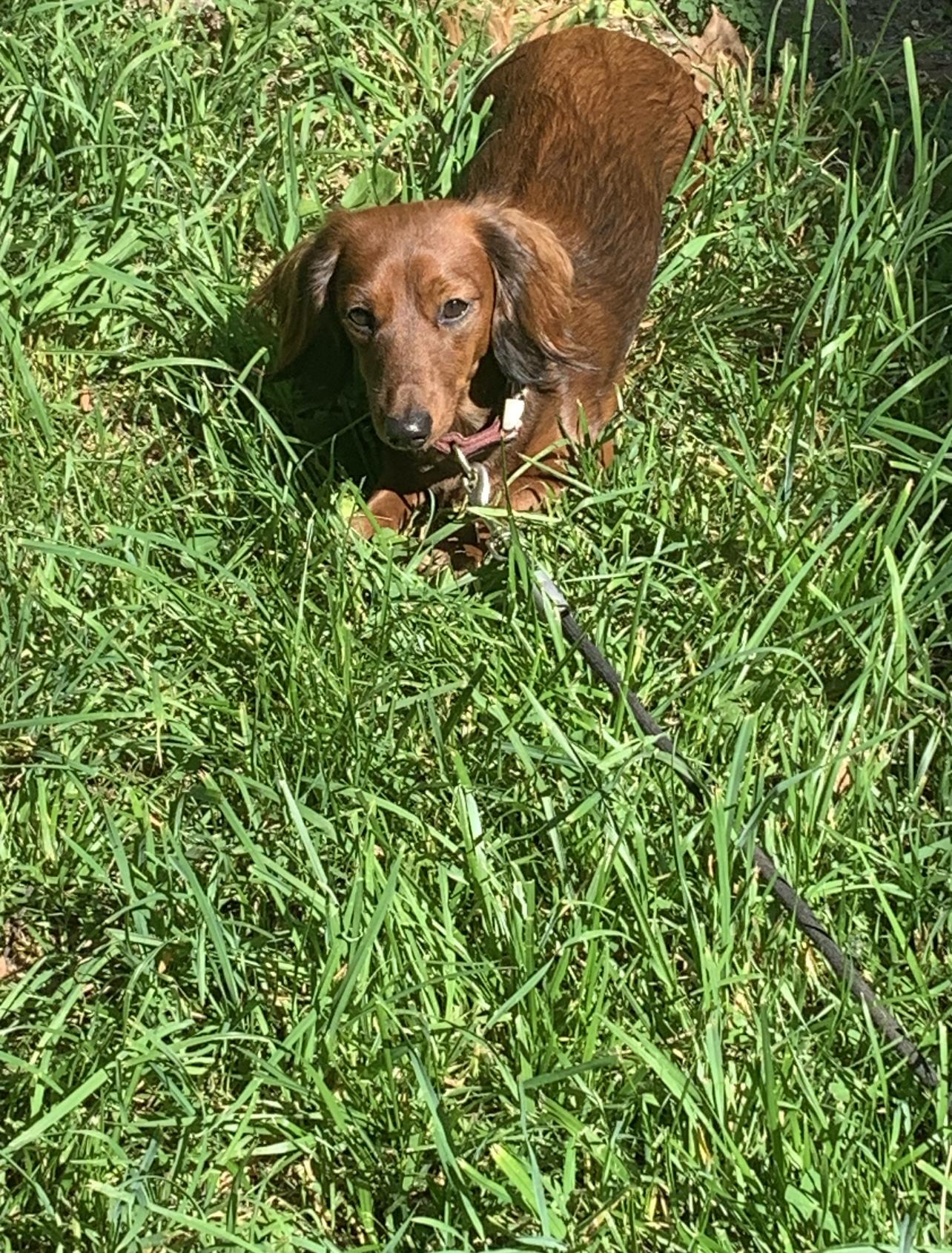 Luna is the daughter of Millie and Oscar. Luna is a miniature long coat shaded red. However Luna does not come from both parents of a long coat Oscar Cogsworth Cromwell is a smooth black and tan Millie is a longer chocolate piebald. So her coat is much shorter. Luna has a beautiful, friendly, loving people pleasing personality. Luna loves attention and gives tons of love and affection back. Luna loves to cuddle and give kisses all the time a true sweetheart who can sometimes got into trouble and look totally so innocent. Love her beautiful silky coat. Luna is registered exclusively thru AKC❤️🐾 Luna has had her Embark dna 🧬 and genetic completed. At one year of age they have there their patella luxation formal clearances are done at 1 year of age. We always work closely with our veterinarians and staff before, during pregnancy and post. We carefully evaluate each breeding. Luna was chosen carefully to reproduce exclusively the AKC dachshund bloodline.