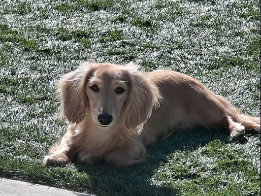 The grand dame, as I refer to Dutches. She’s is only of AKC registration, Dutches is long haired ee cream, carries hidden dapple. Dutches loves everyone, of all ages. She makes sure, you know, her demands as well. Just like Millie does. Dutches was very, carefully selected as a great representative of her breed to breed. As with all of our Dachshunds we constantly work closely with our team of veterinarians. Dutchess works with her AKC Trainor has a full Embark DNA 🧬 screening. At one year of age she’s had her patella luxation formal clearances. They are done at 1 year of age for full maturity. We always work closely with our veterinarians well before, during pregnancy and post. Dutches receives top quality veterinary care and their staff exams and vaccinations. While this queen is equally gorgeous for show and presentation she shows the hound in her as much as she loves the outdoors getting dirty her scent to track our yard of chipmunks 🐿️ and squirrels 🐿️ has caught a few and proud to show us her catch she always cleans up beautifully.
