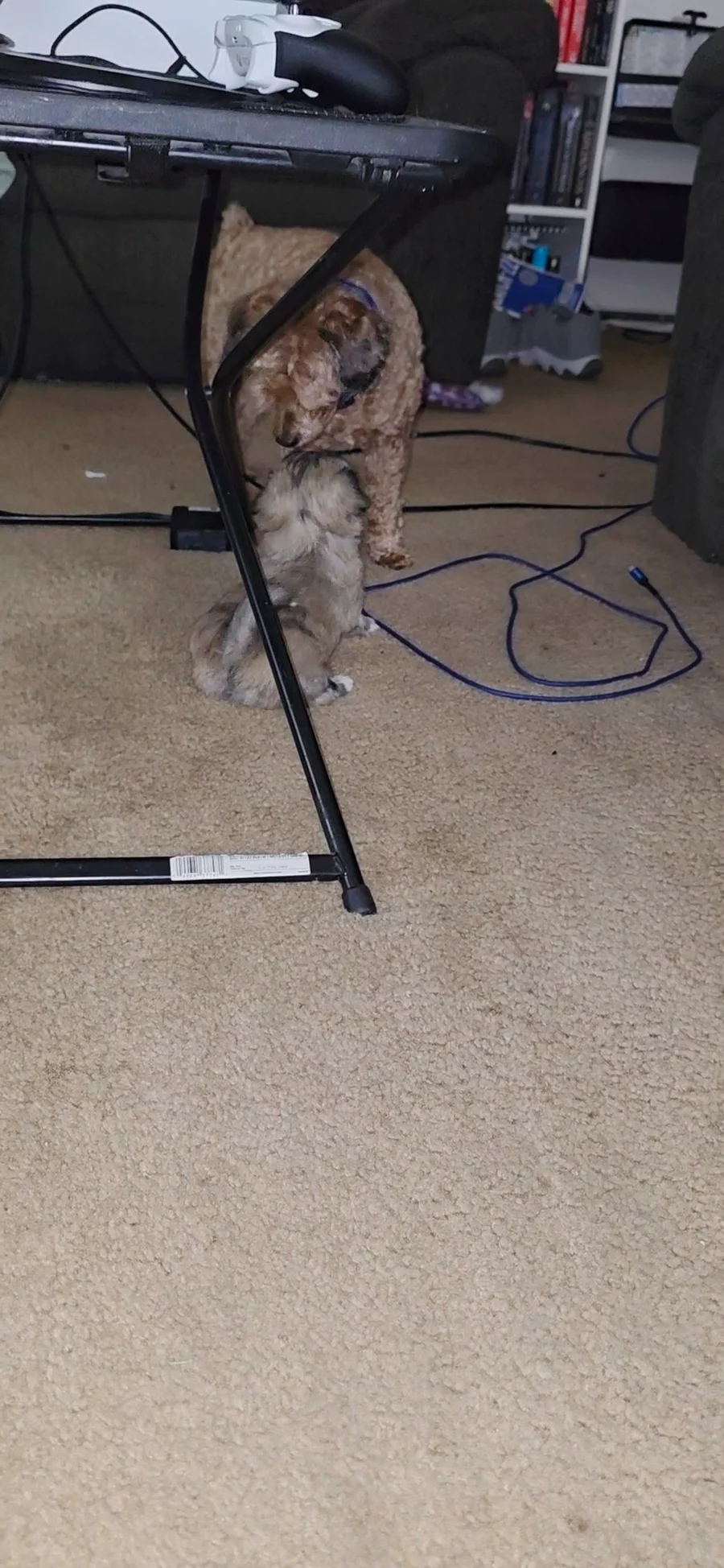 Scarlett meets Lena the poodle. Please excuse the TV in the background