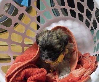Our Mal-Shi puppies include brown, brindle and white, brindle, white and tan, and white. Poodle puppies include apricot, black, brown, red, and white. Maltipoo puppies include apricot, cream, red, phantom, black & tan tri-color, and black & tan. Colors will vary depending on the parent dogs.