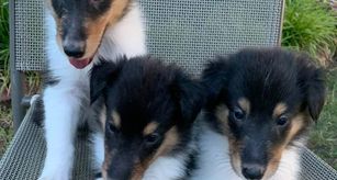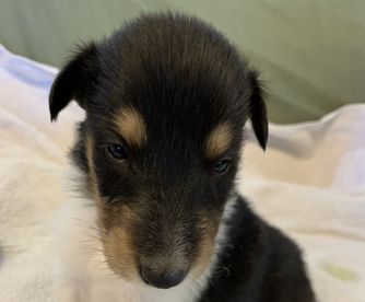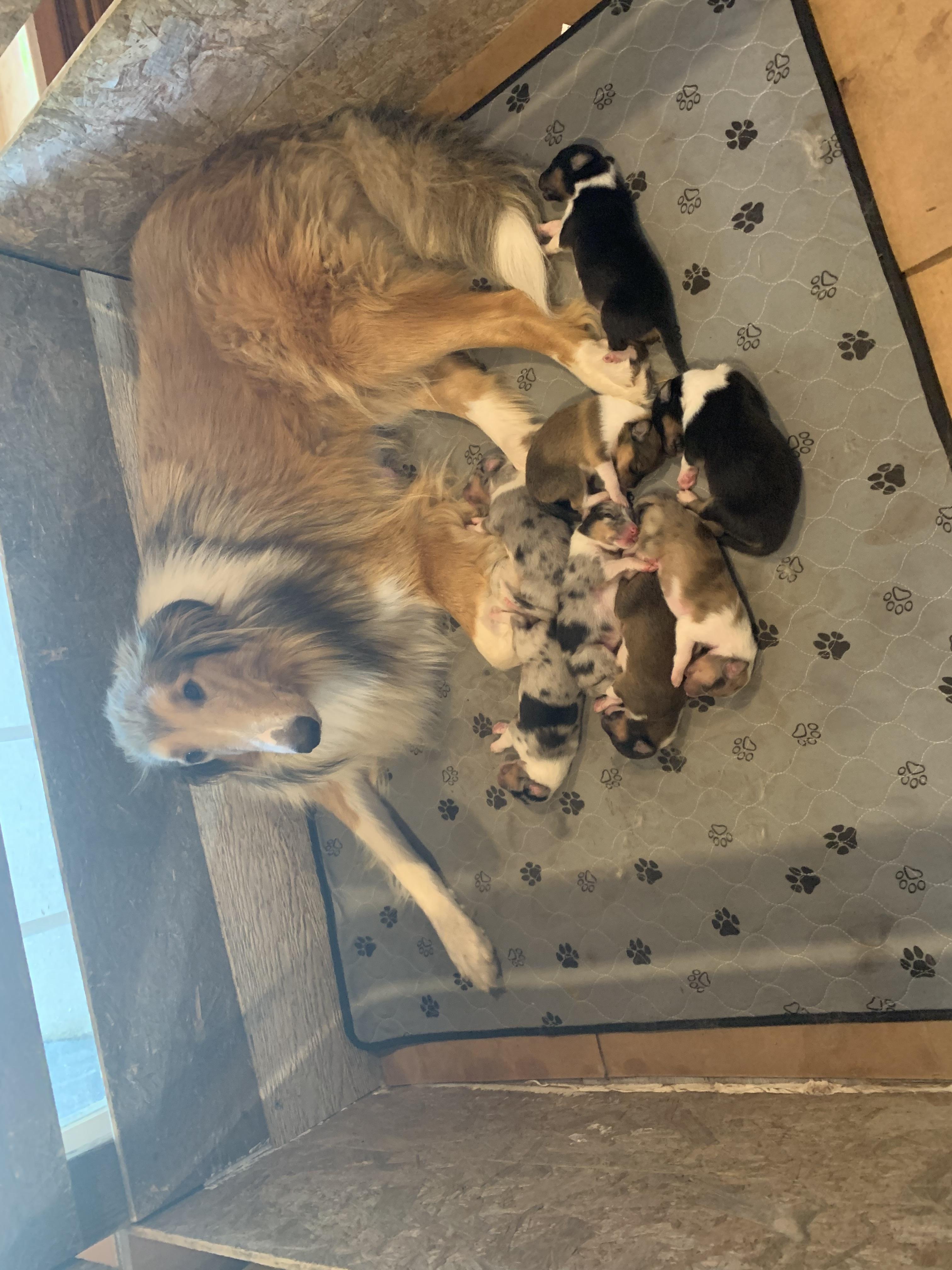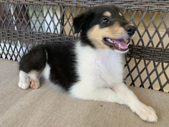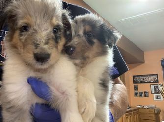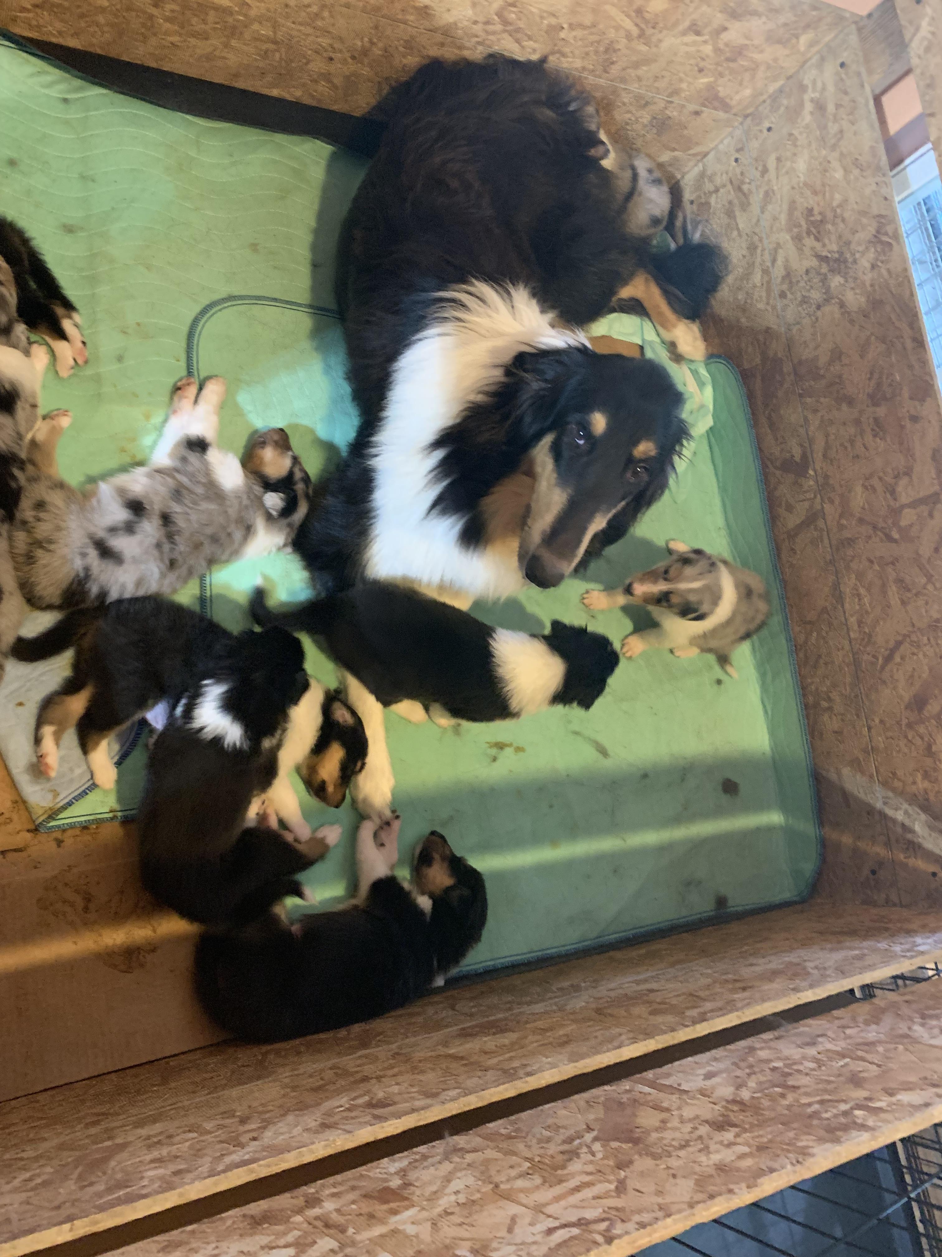Our puppies include sable and white, black white and tan, and blue merle. Colors will vary depending on the parent dogs.