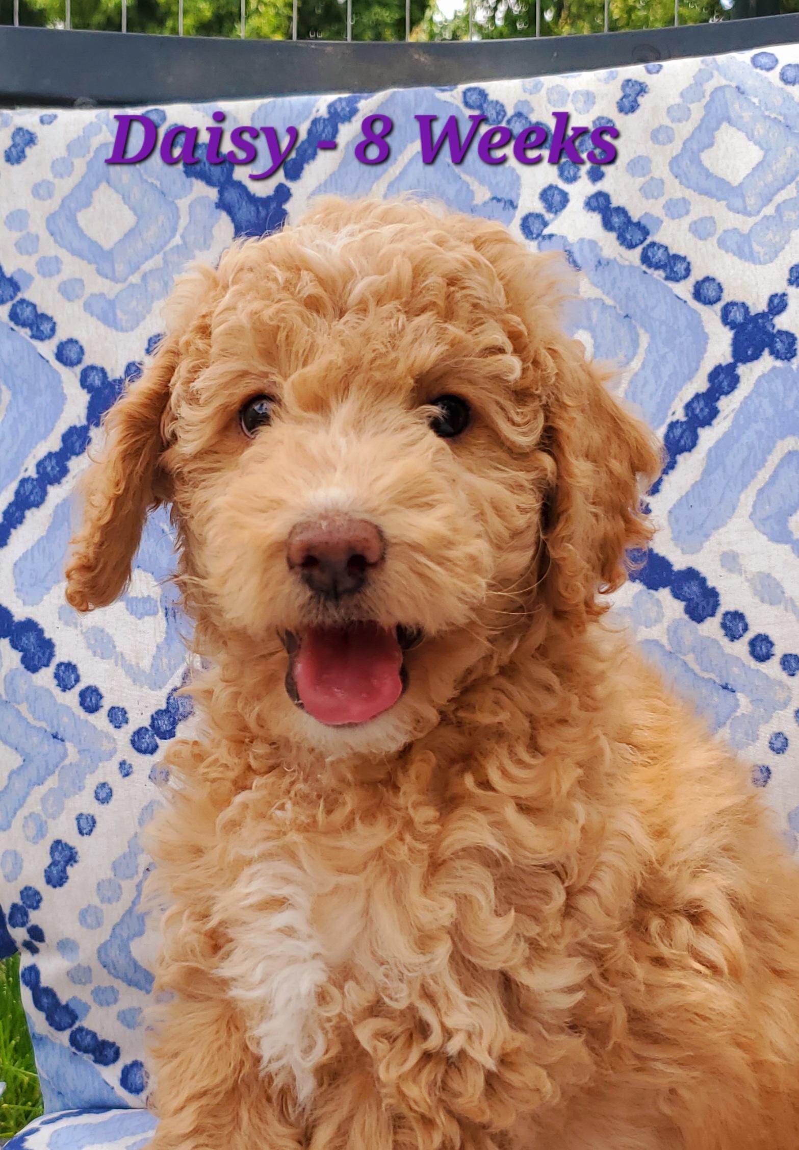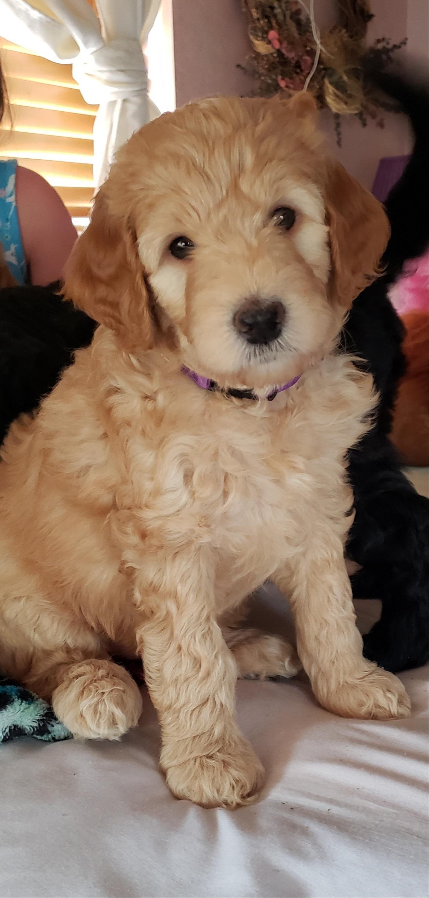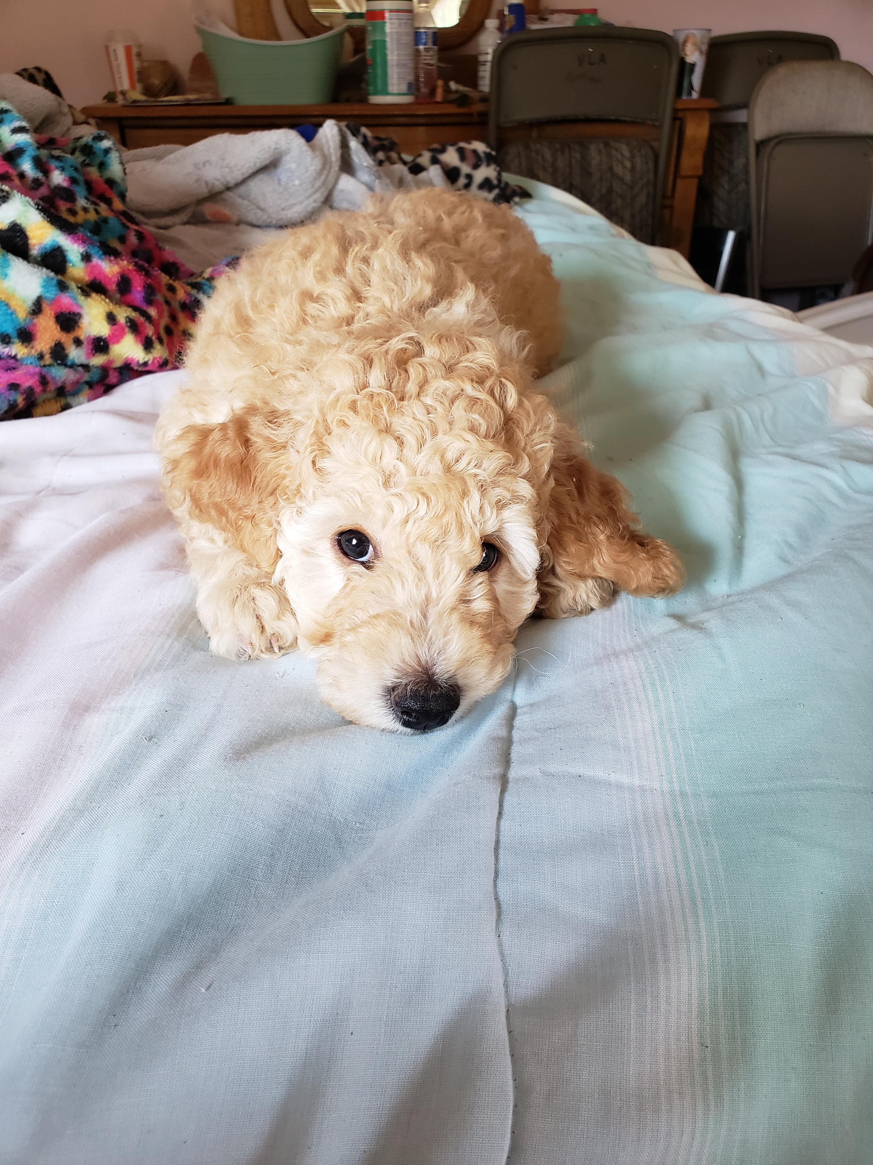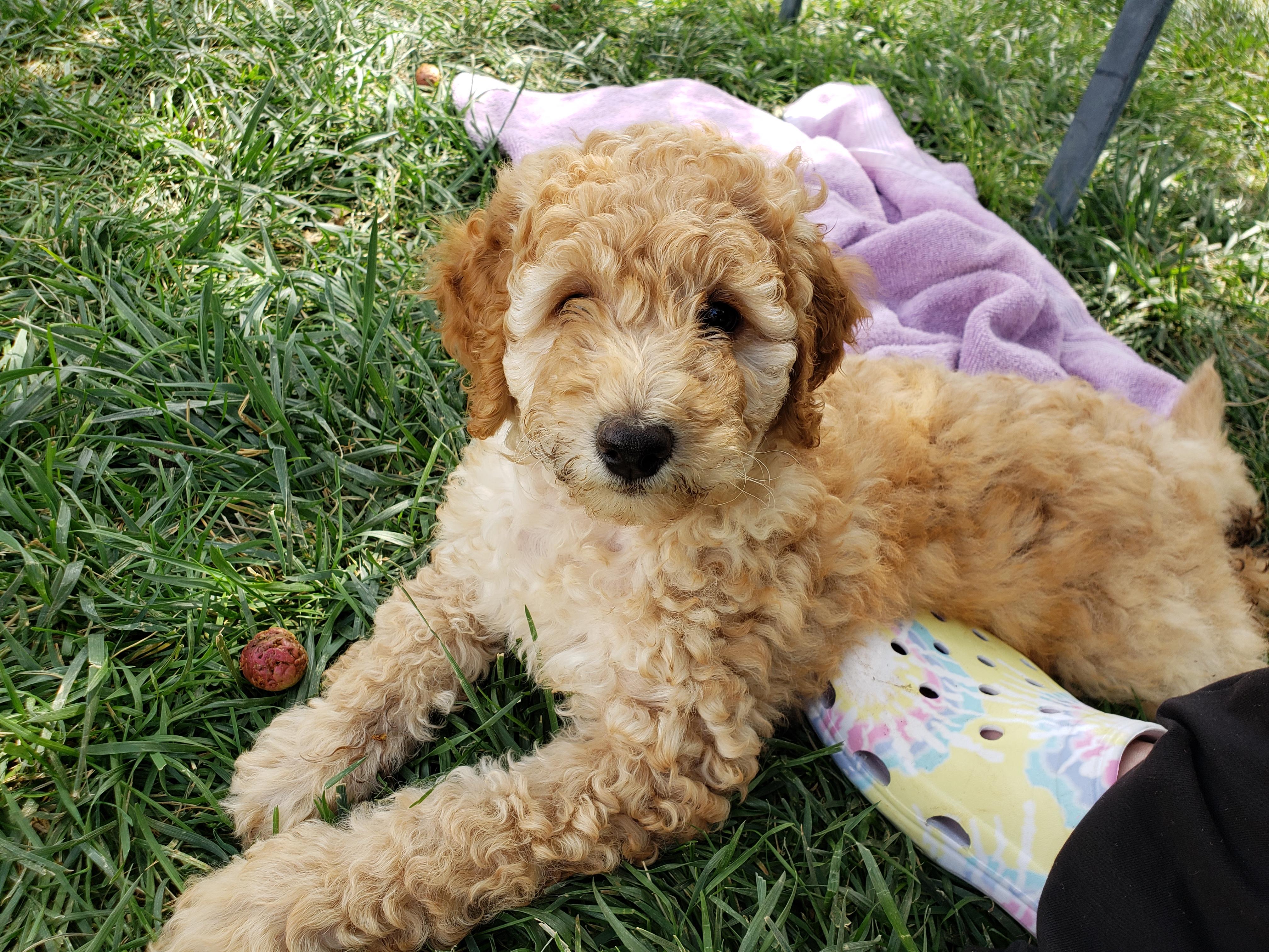 Wanda is a beautiful, light apricot F1bb aussiedoodle. Standing at 21" tall and weighing in at 30 pounds, she is truly a special girl. She is my little shadow. Whether I'm at the lake, playing in the water, out for a hike, or lounging around in the house all day, she wants to be by my side, living and loving life with me! She has a clear genetic panel, and is a fantastic mama!
