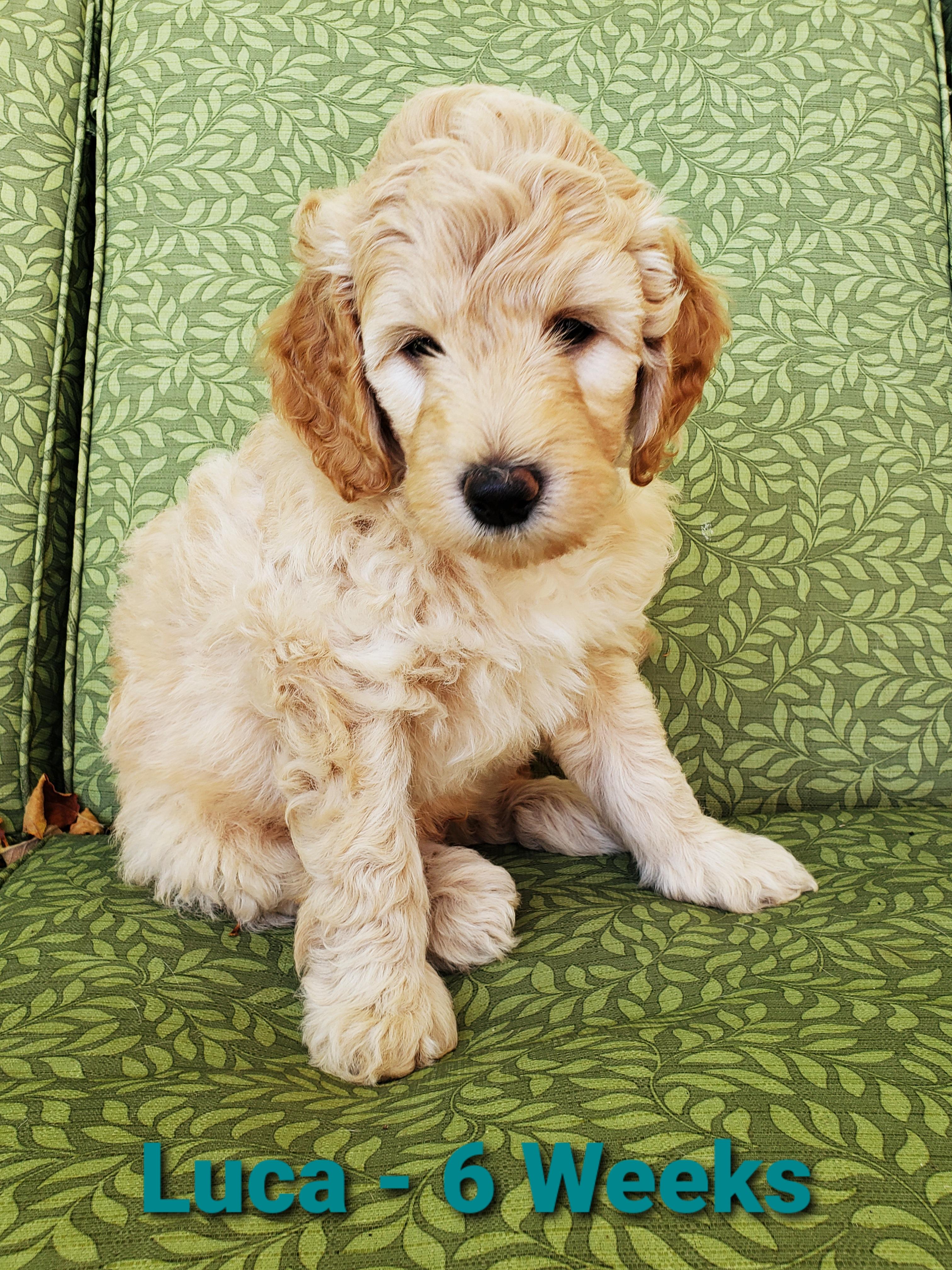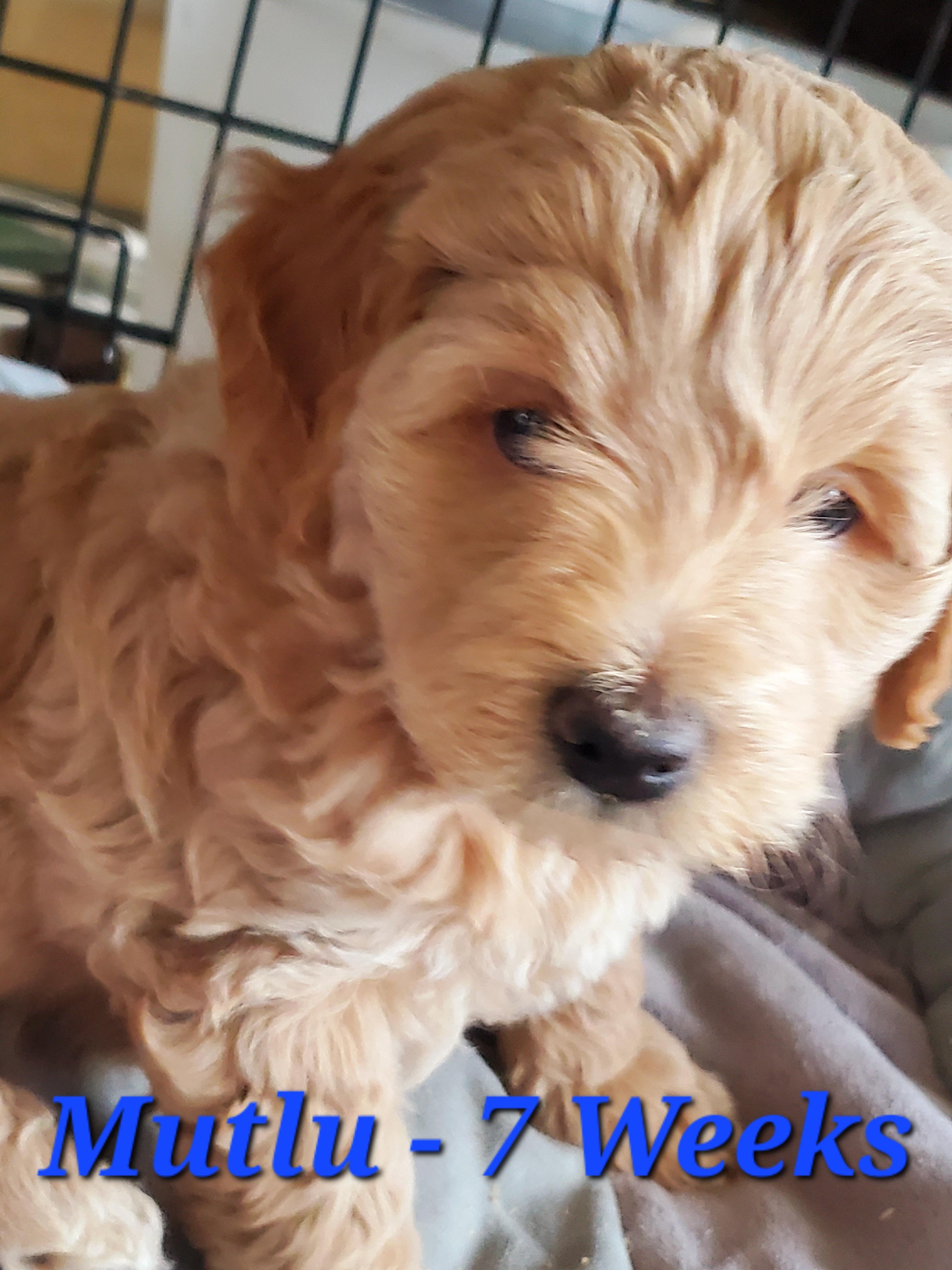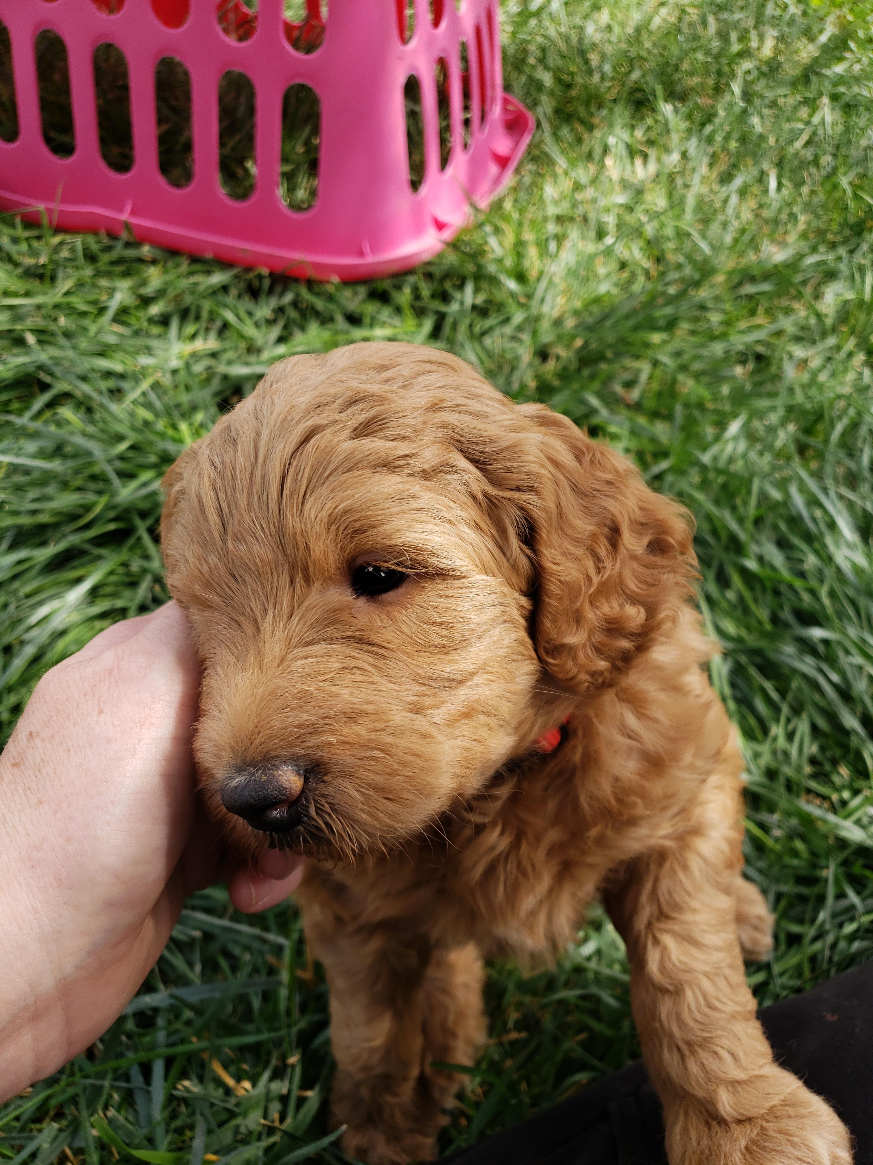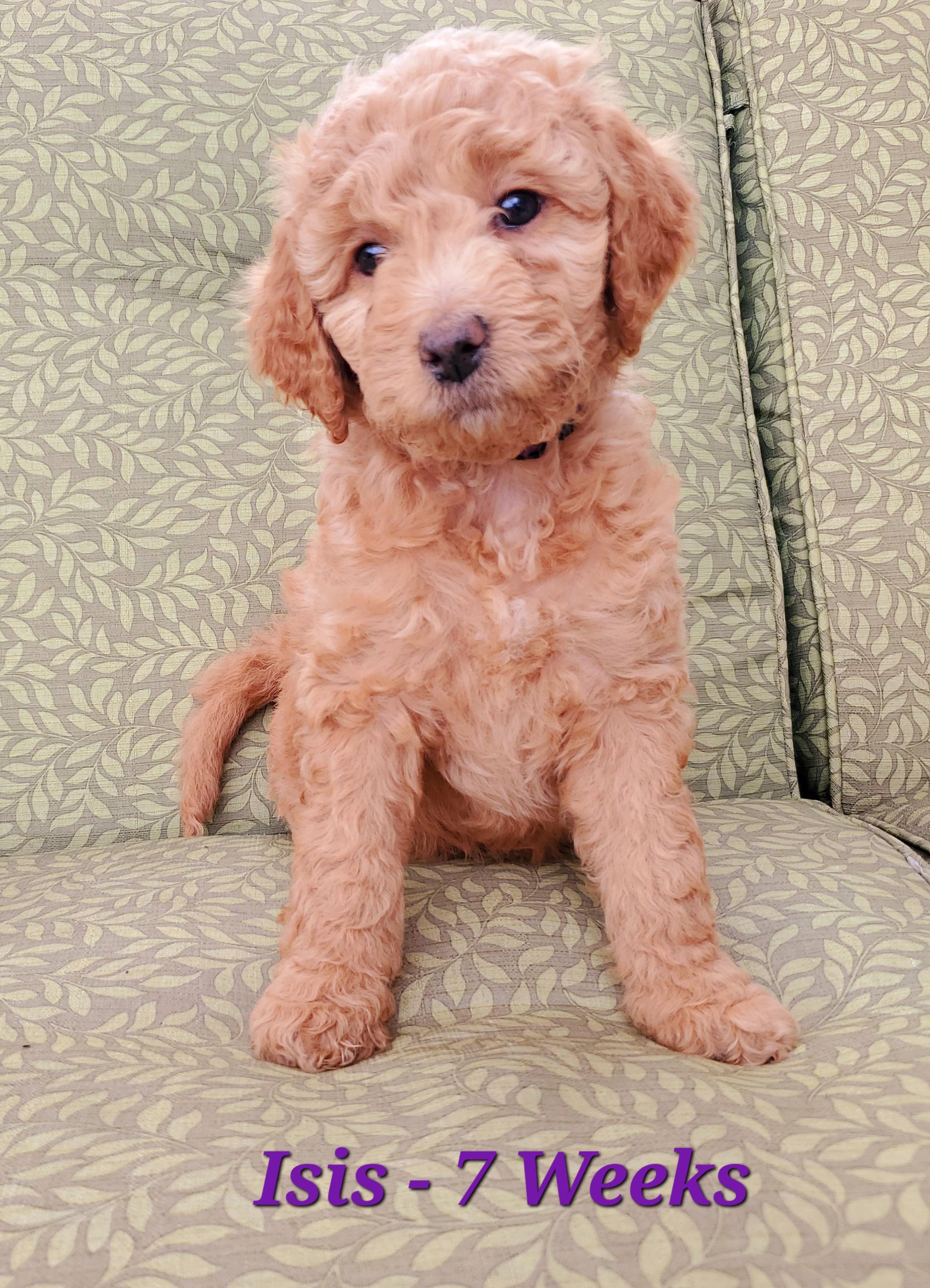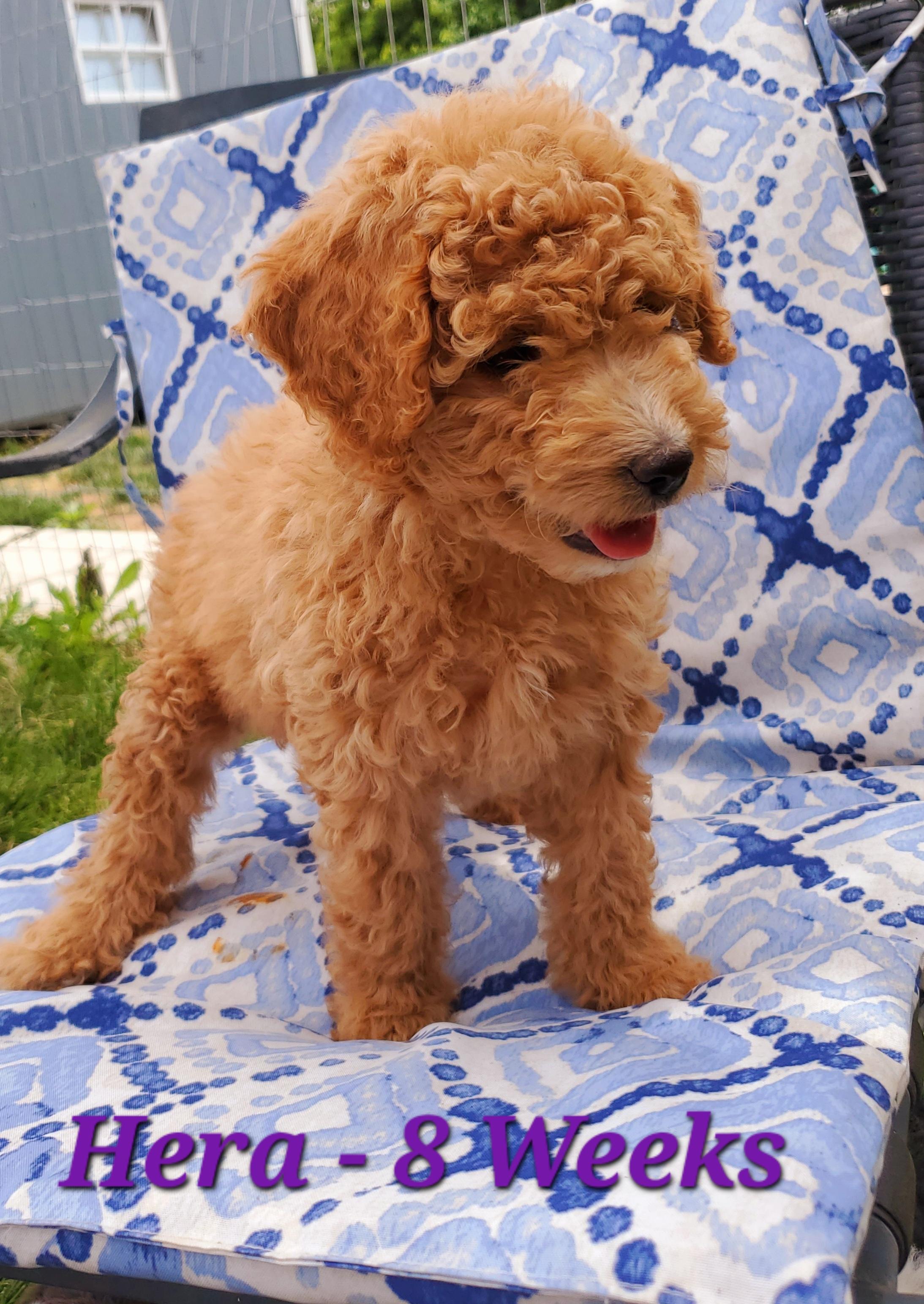 Wanda is a beautiful, light apricot F1bb aussiedoodle. Standing at 21" tall and weighing in at 30 pounds, she is truly a special girl. She is my little shadow. Whether I'm at the lake, playing in the water, out for a hike, or lounging around in the house all day, she wants to be by my side, living and loving life with me! She has a clear genetic panel, and is a fantastic mama!