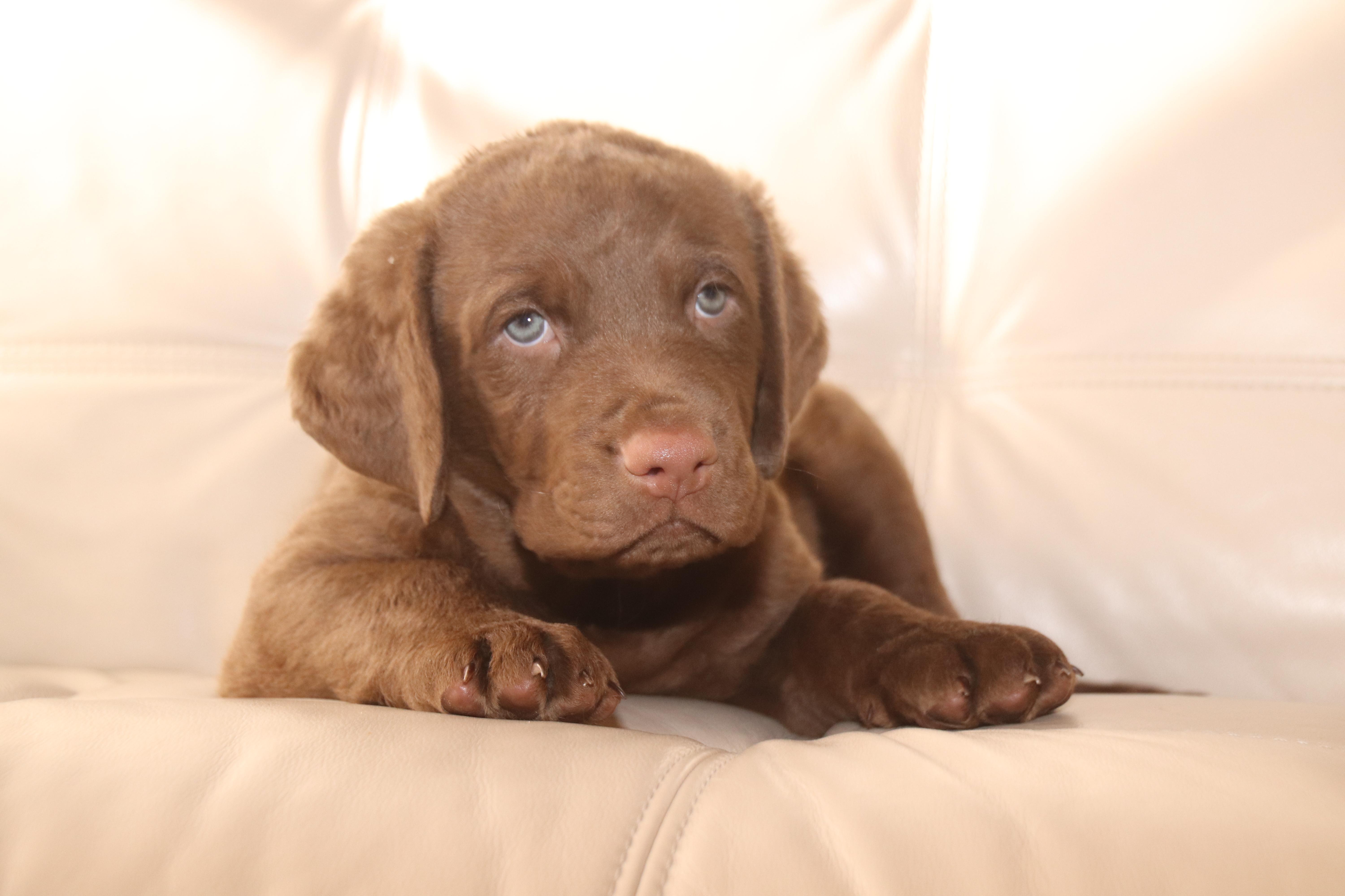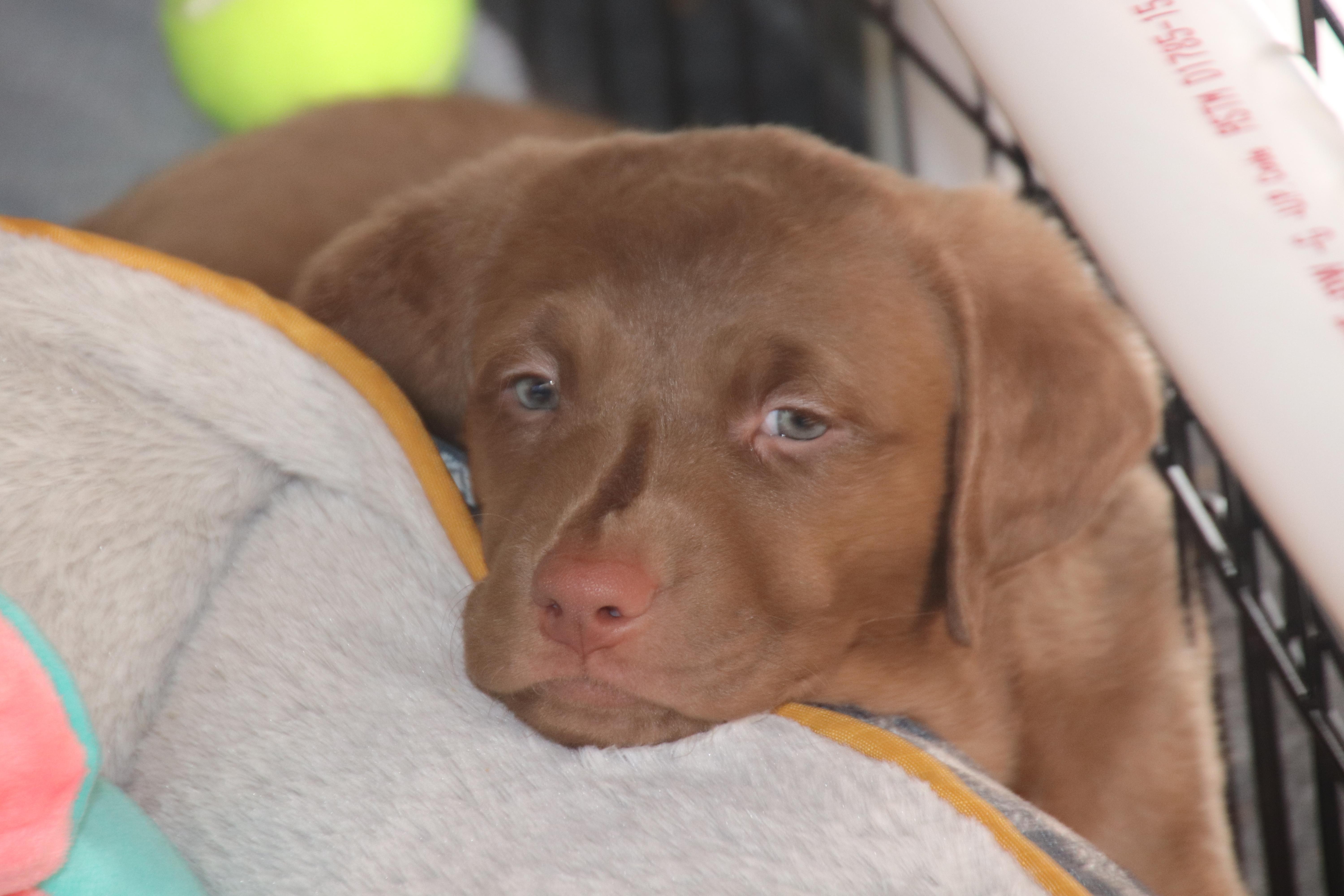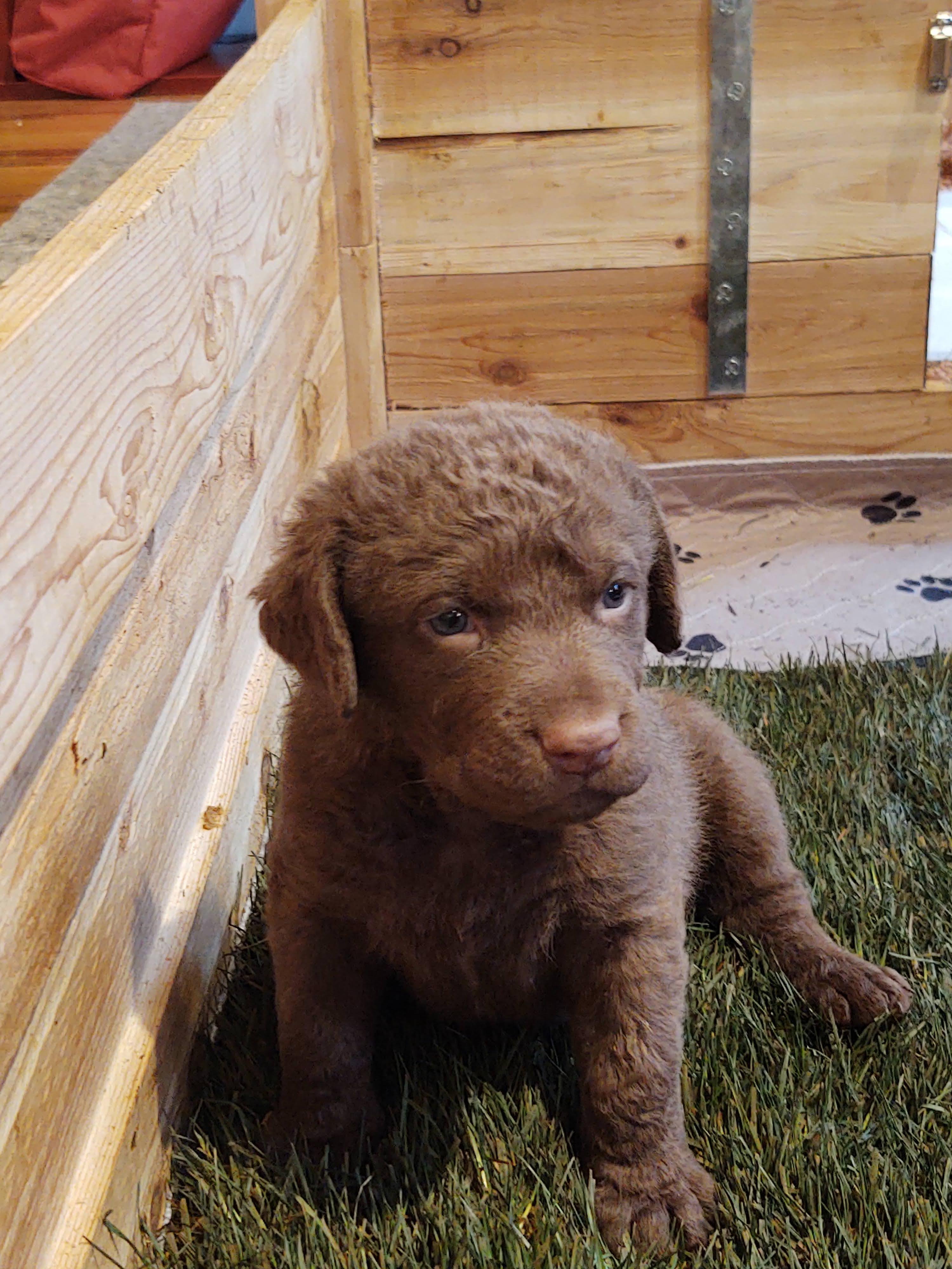 Pearl is a female Chesapeake Bay Retriever. Carefully selected as a great representative of her breed, Carmen decided to make her part of their program. Carmen has passed Good Dog’s screening process, which involved a review of their breeding practices, environment, and the mental and physical health of their dogs.