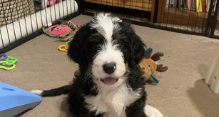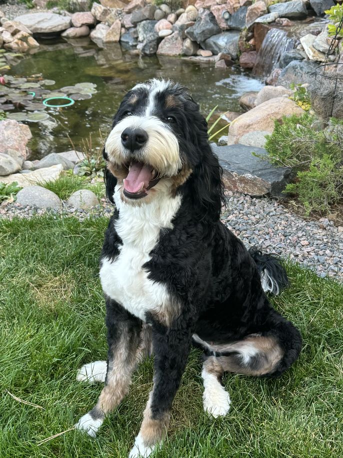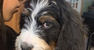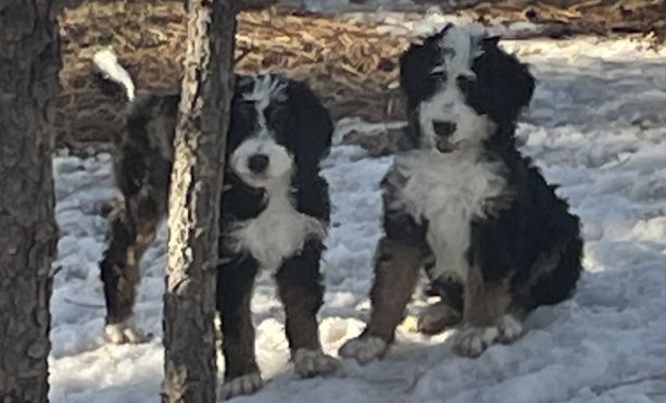 Our Bernedoodle puppies are tri-color. Goldendoodle puppies include cream, apricot, and parti. Colors will vary depending on the parent dogs.