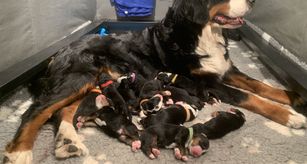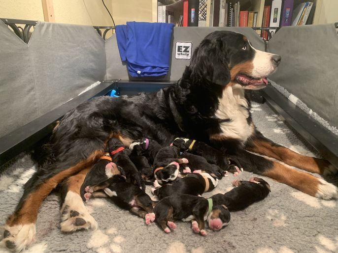 Our dogs are thoroughly tested before being added to our program. Our pups are raised alongside our family, in our home and not in outside kennels. They are handled from the moment of birth. We gradually add age-appropriate stimulation/sensory. They are dewormed/immunized. They begin potty training and learn the doggy door. We delight in raising puppies and the puppies reflect that love.