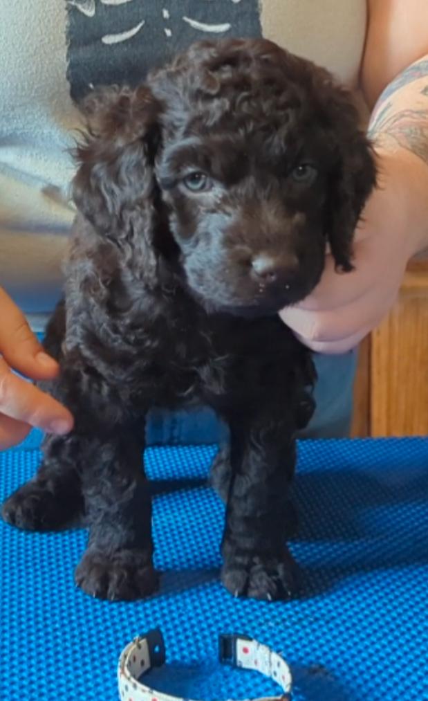 Our Irish Water Spaniel puppies are liver. Manchester Terrier puppies are black and tan. Colors will vary depending on the parent dogs.