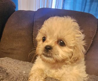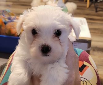 Our Bichon Frise puppies are white. Shih Tzu puppies include cream and white, sable and white, black, gold and white, liver and white, brindle and white, blue and white, black gold and white, and black and white. Maltese puppies include white, white and tan, and white and lemon. Miniature Schnauzer puppies include wheaten, liver, salt and pepper, and black and silver. Maltipoo puppies include apricot, cream, and white. Colors will vary depending on the parent dogs.