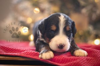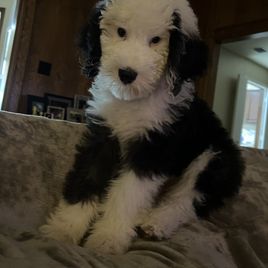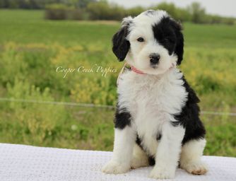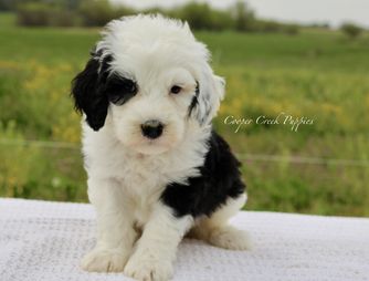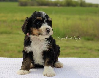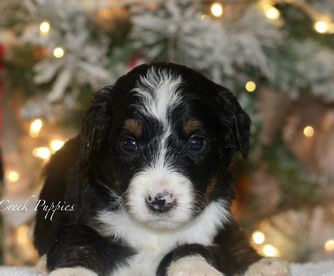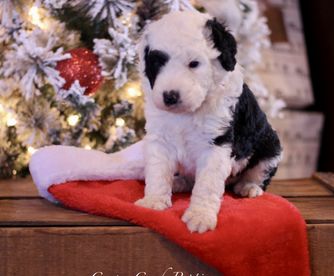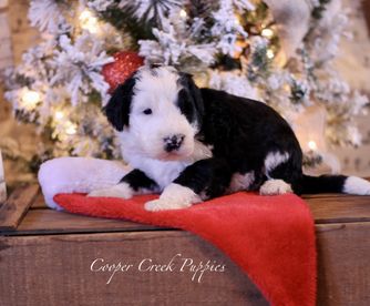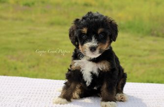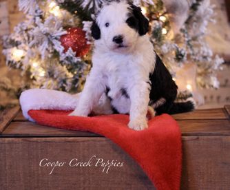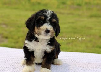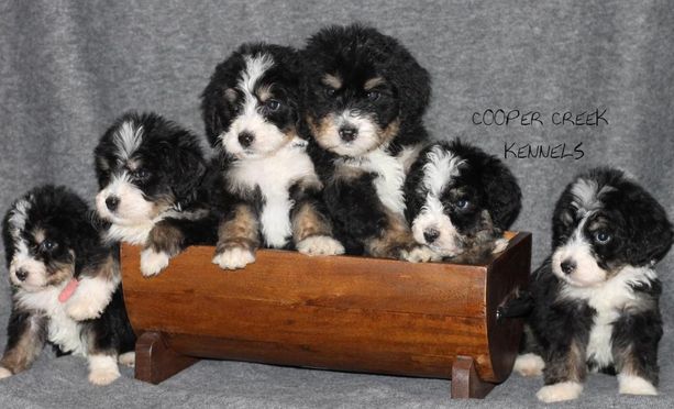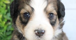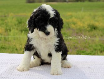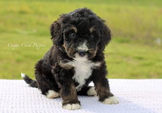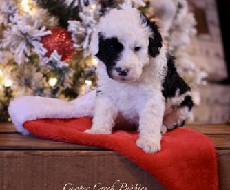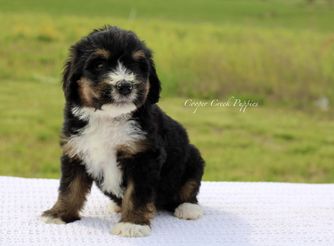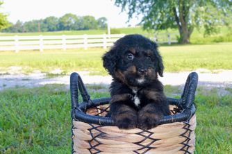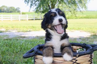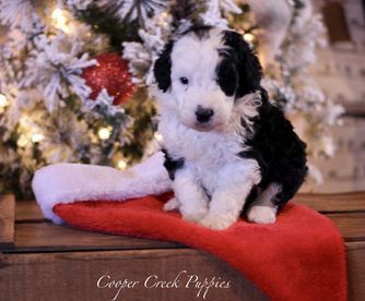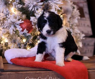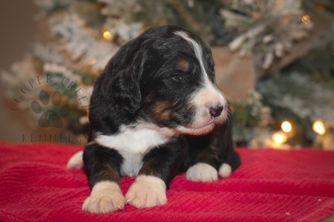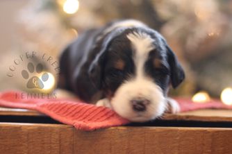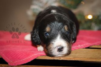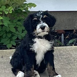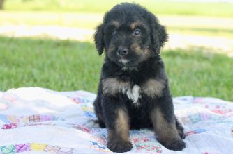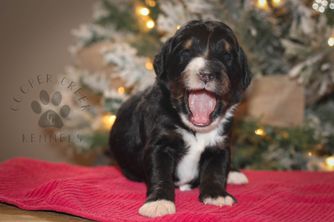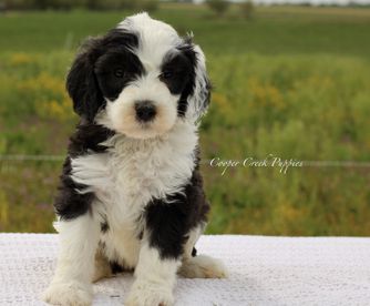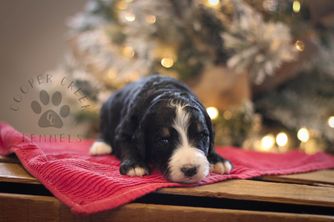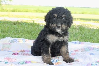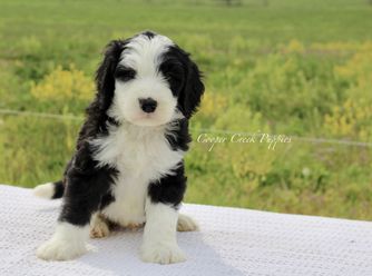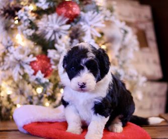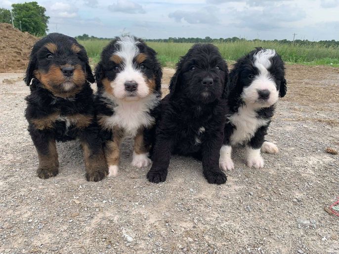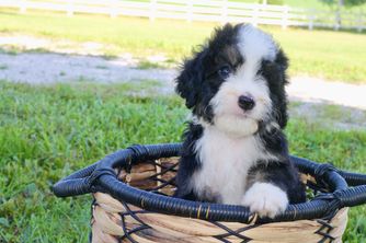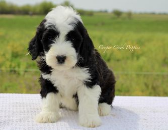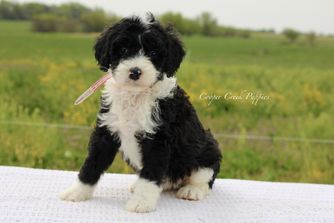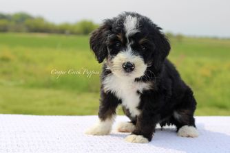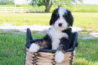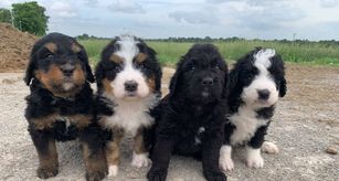 Our Bernedoodle puppies are tri-color. Sheepadoodle puppies are black and white. Colors will vary depending on the parent dogs.