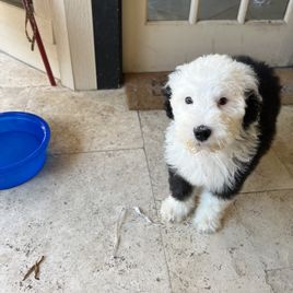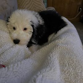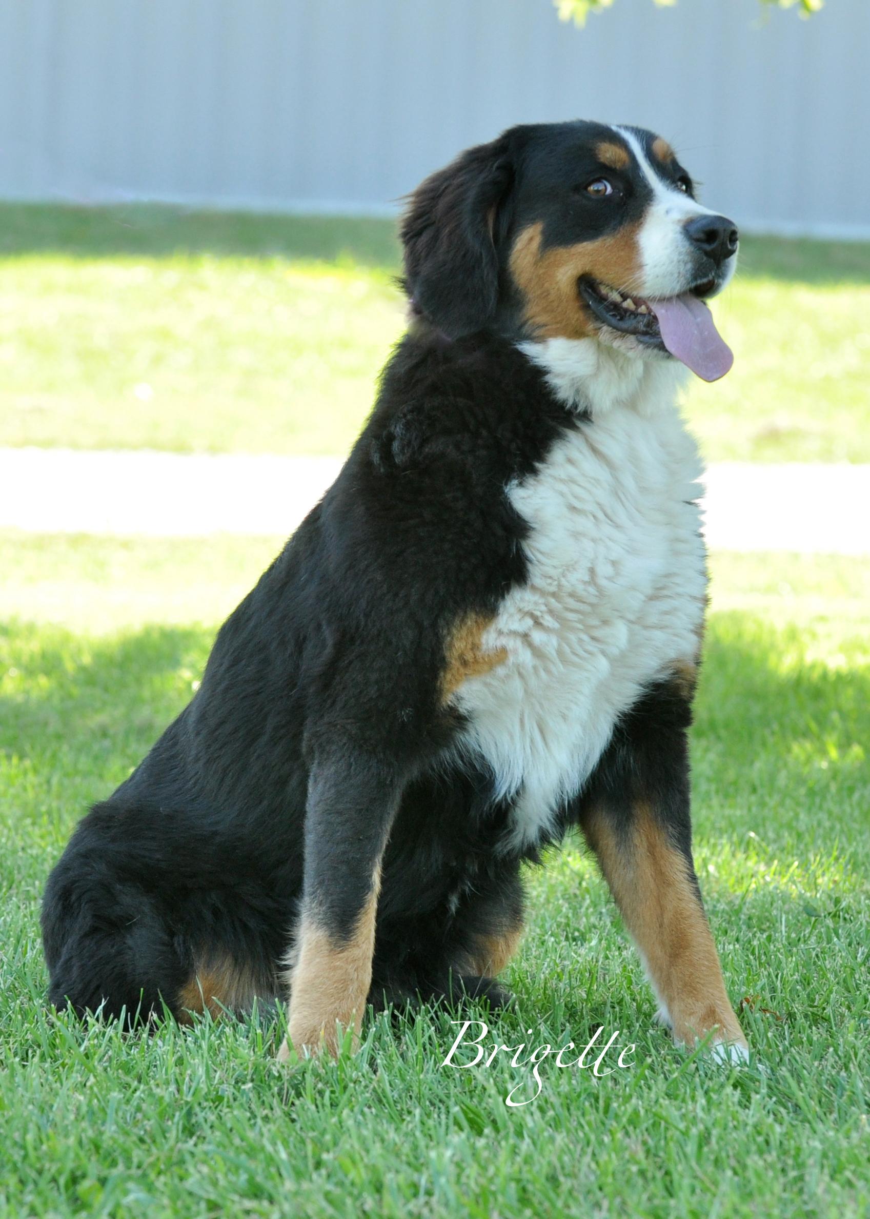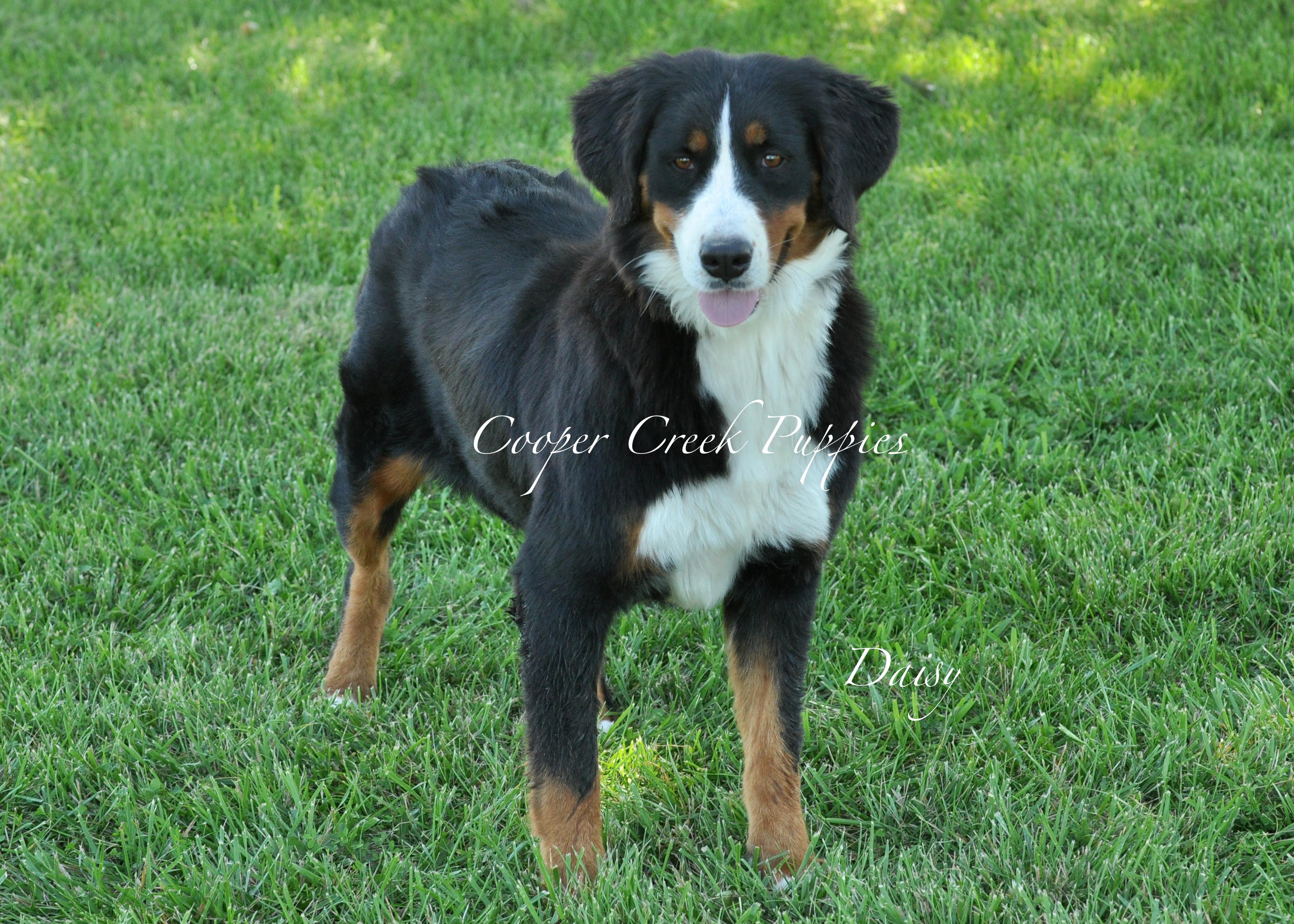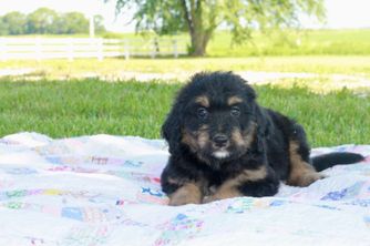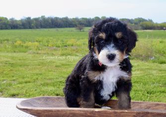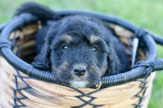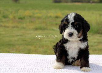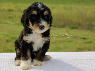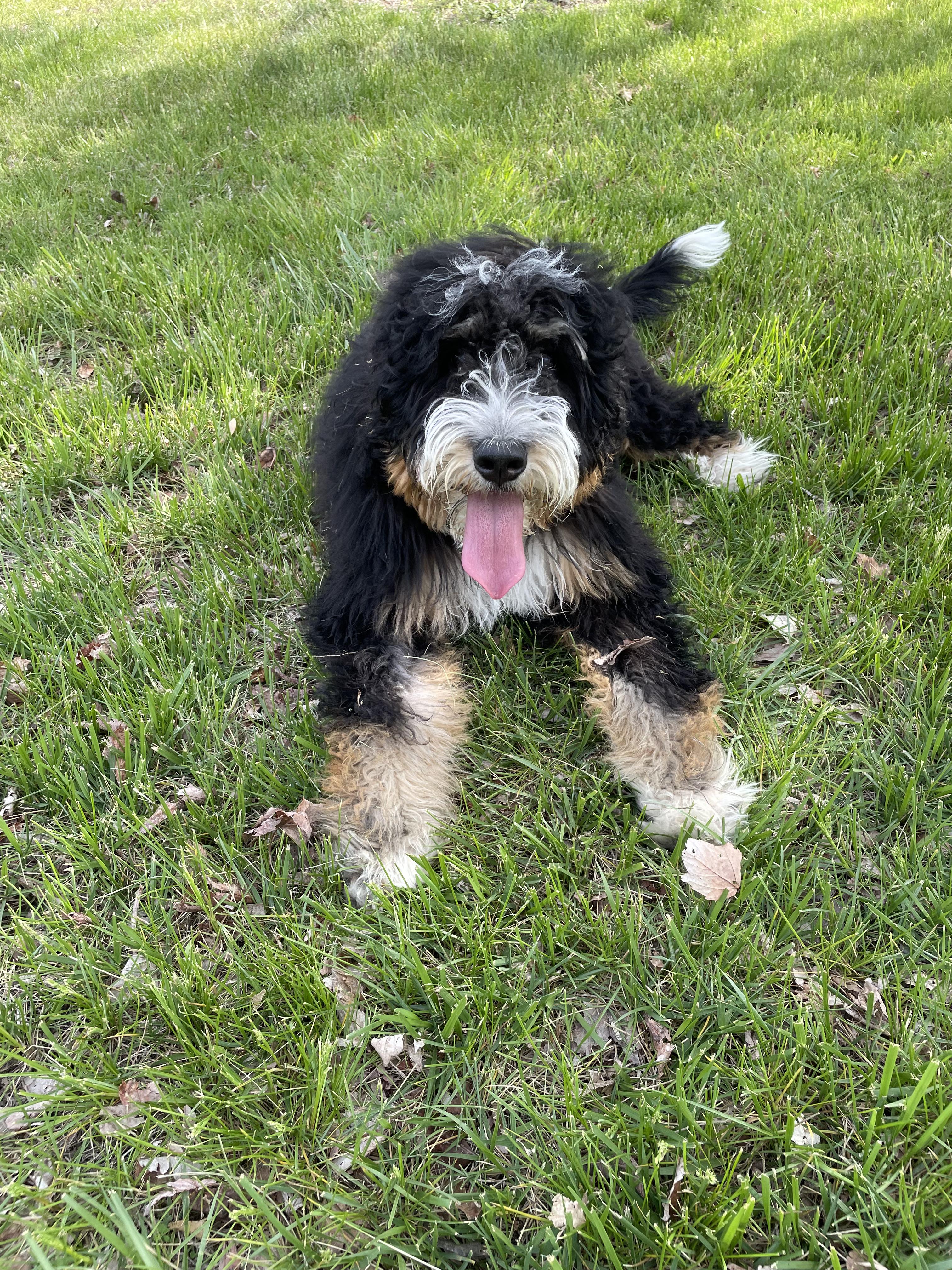 Our Bernedoodle puppies are tri-color. Sheepadoodle puppies are black and white. Colors will vary depending on the parent dogs.