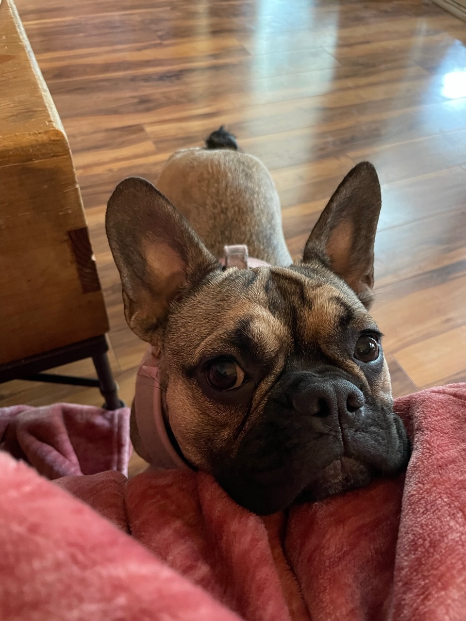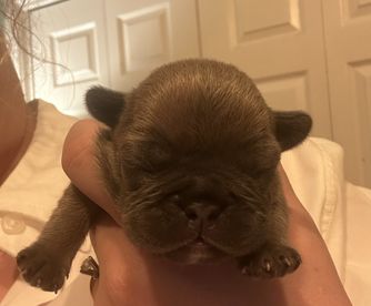 Nugget is a spunky, well-tempered pup. She is our first Frenchie, so she’s had the best of both worlds- being a solo pup and now with siblings, who she loves to wrestle with. She loves her time with her humans and is a snuggle bug. This is her first litter and she has been a fantastic mom to these little potatoes.