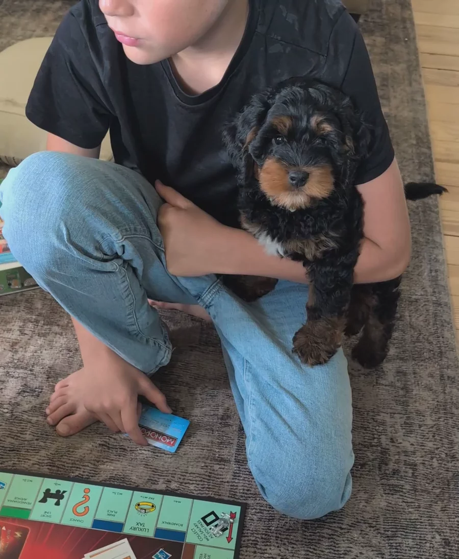 All the girls from our current litter have joined their families. This is a picture of Josie before she left with one of my boys. Our boys are a huge part of our program. They give our pups so much love and the attention they deserve. An older couple who adopted one of our dogs remarks that their dog still adores boys. It's been a number of years since she lived with us but the love and attention they gave made an impact.