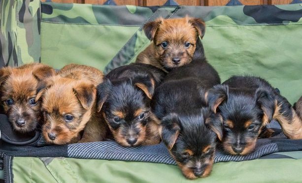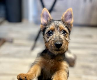 Our Australian Terrier puppies include red and blue and tan. Standard Schnauzer puppies include black and pepper and salt. Colors will vary depending on the parent dogs.