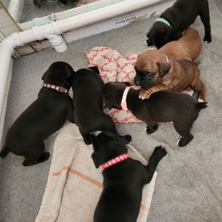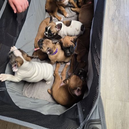 Our Boxer puppies include fawn and brindle. French Bulldog puppies are fawn and white. Colors will vary depending on the parent dogs.