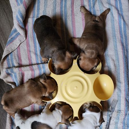 Frenches have started eating puppy mush they are doing a good job of not making too much of a mess