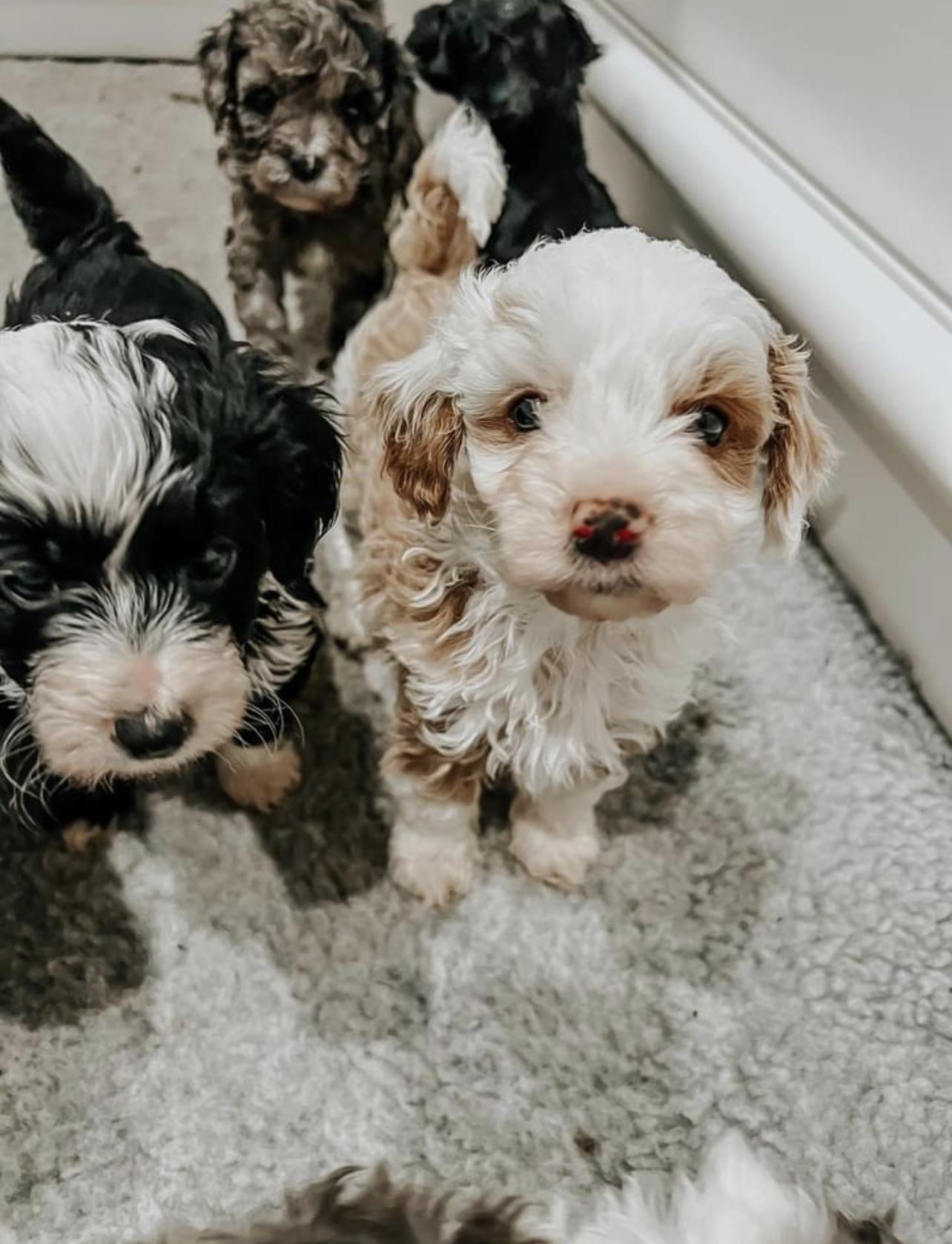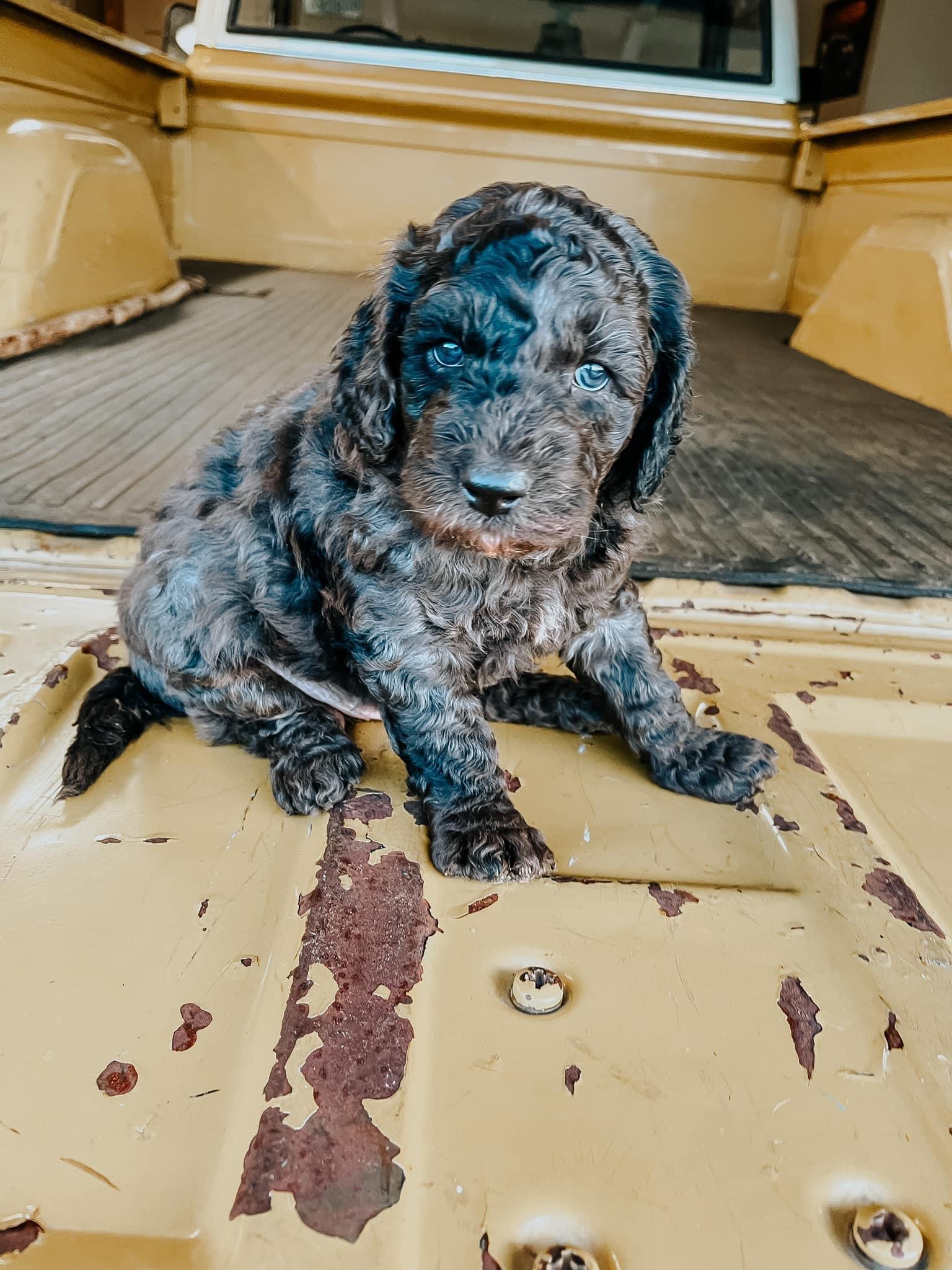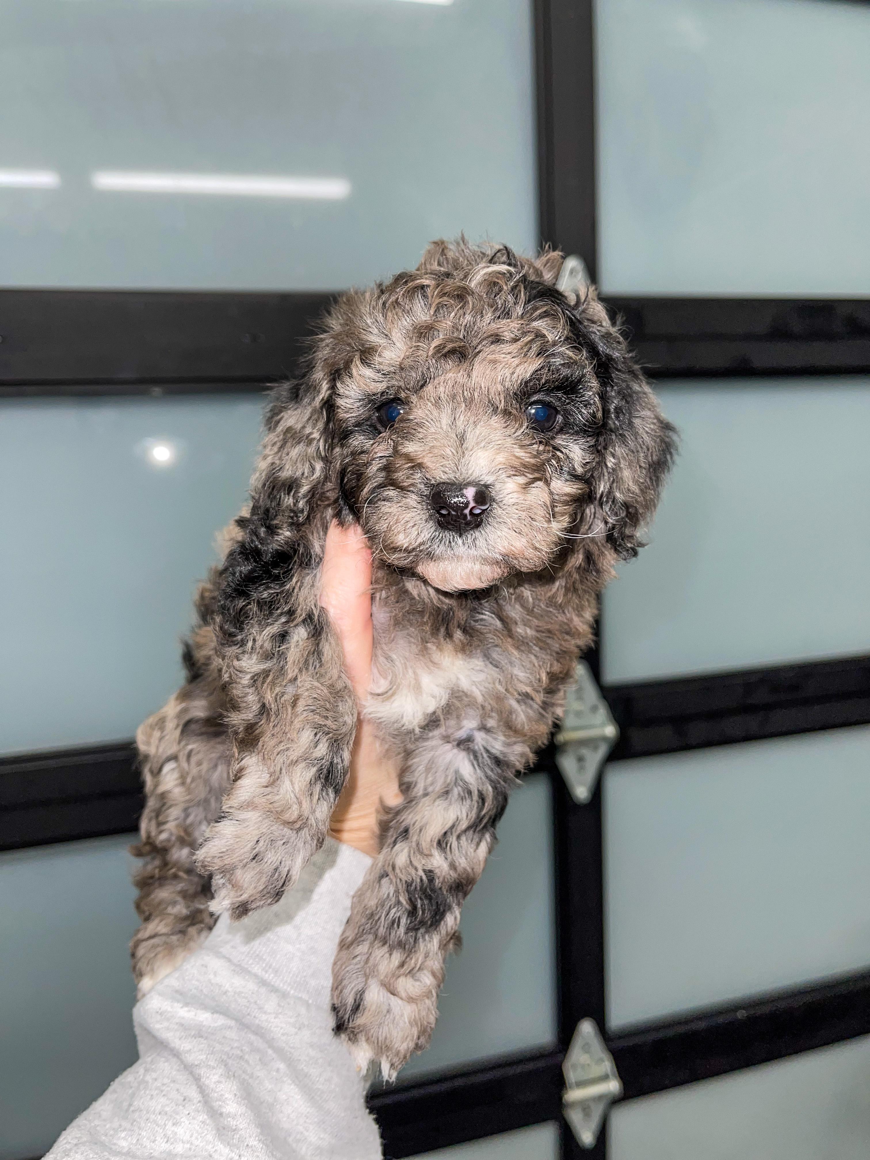 Aussiedoodle puppies include blue merle, black phantom, black and white, black tri-color, and red phantom. Colors will vary depending on the parent dogs.
