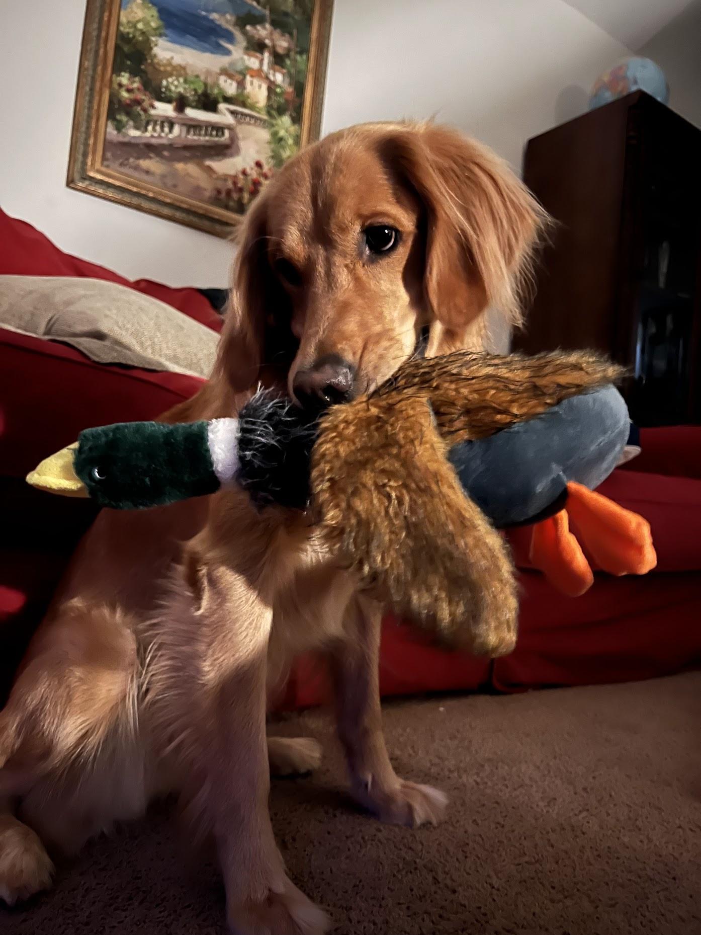 Pandora is on the darker side of a medium gold. She has her trick dog novice title, rally novice title, canine good citizen title and she always loves the challenge of learning a new trick. She is smart, sweet and eager to please! She has had her OFA hips, elbows, eyes & heart certifications completed, as well as a DNA panel done (complete with ICTH Type 2) so we can guarantee the puppies will be free of any inherited diseases