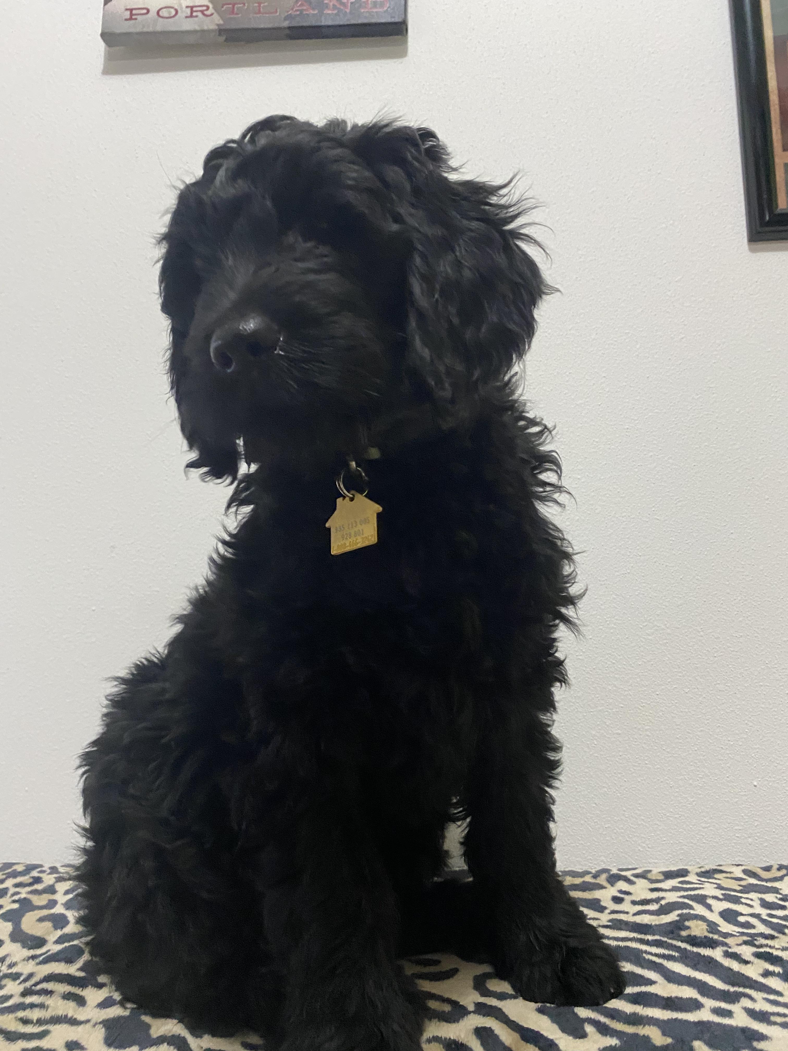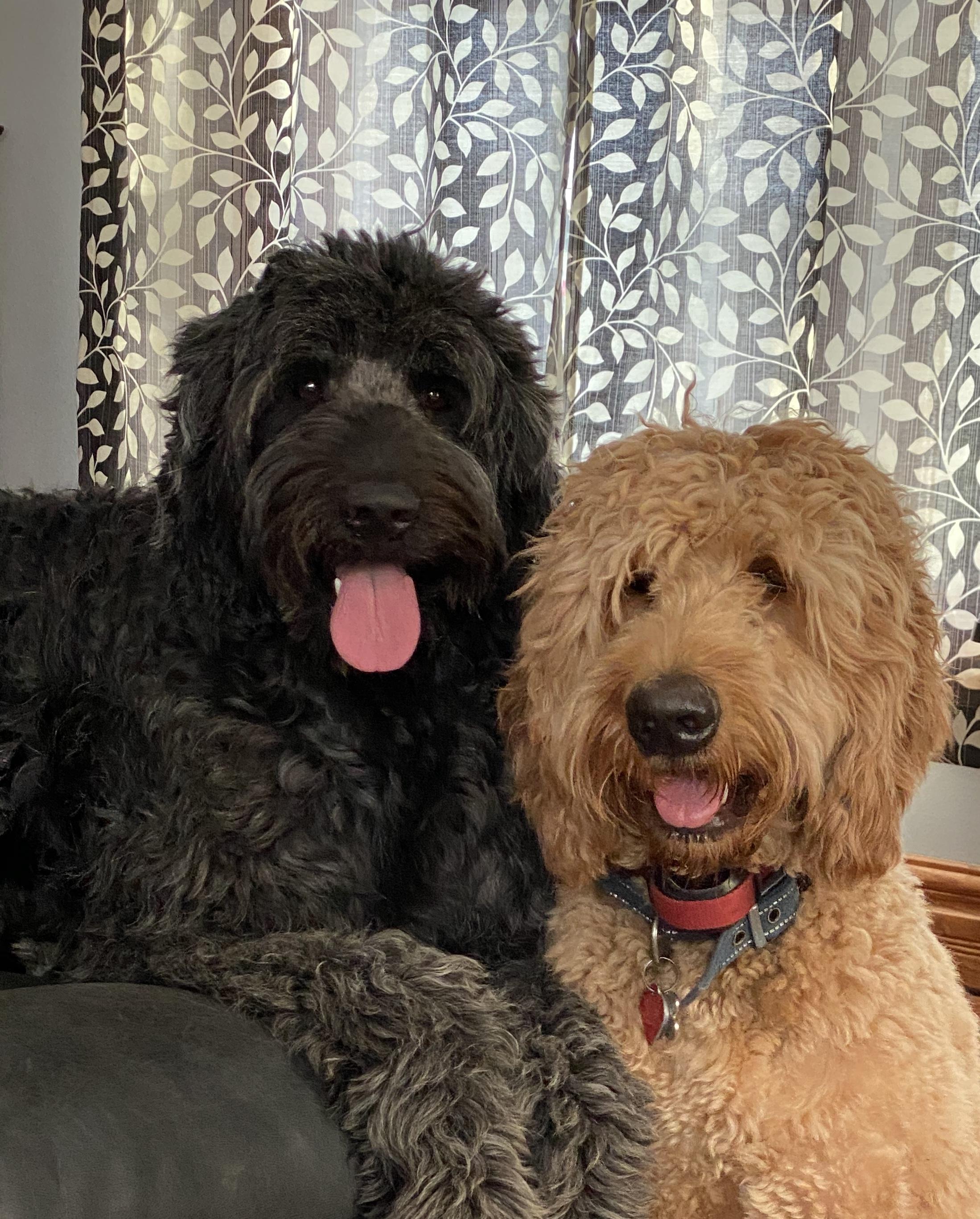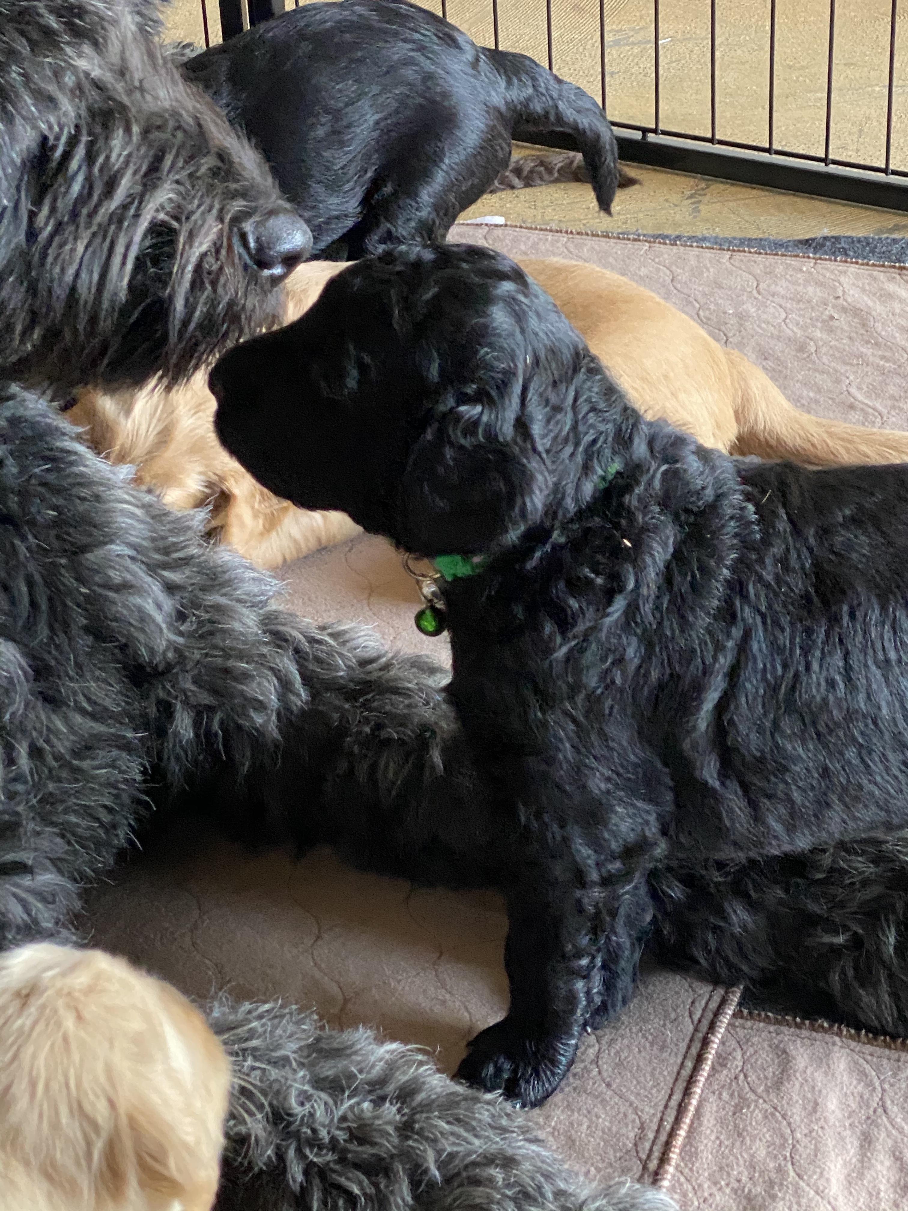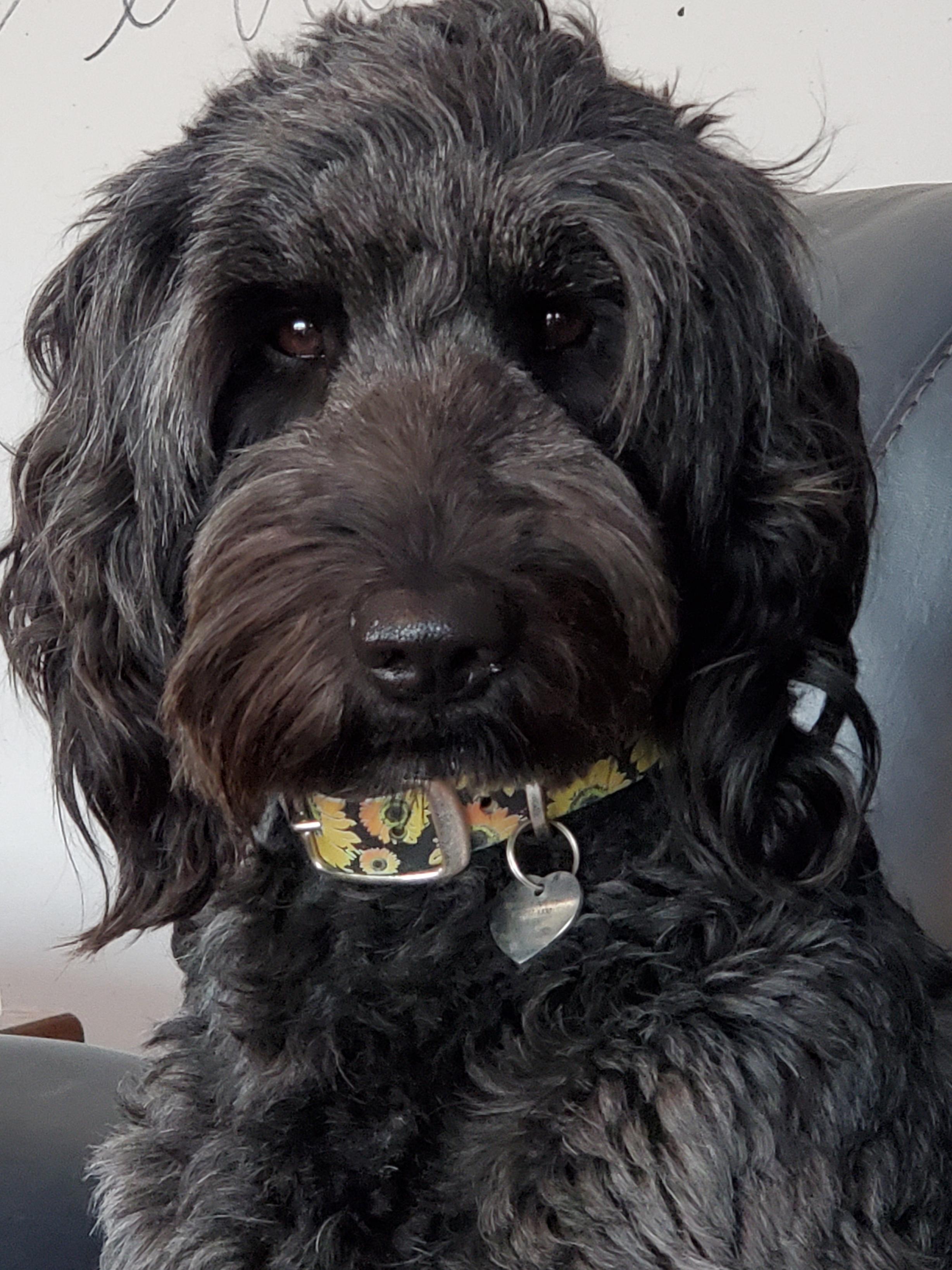 Frankie is a gray, standard Goldendoodle. The is dominate in her pack. She has black, silver-tipped coat. Frankie is a very calm companion, leader and mother.