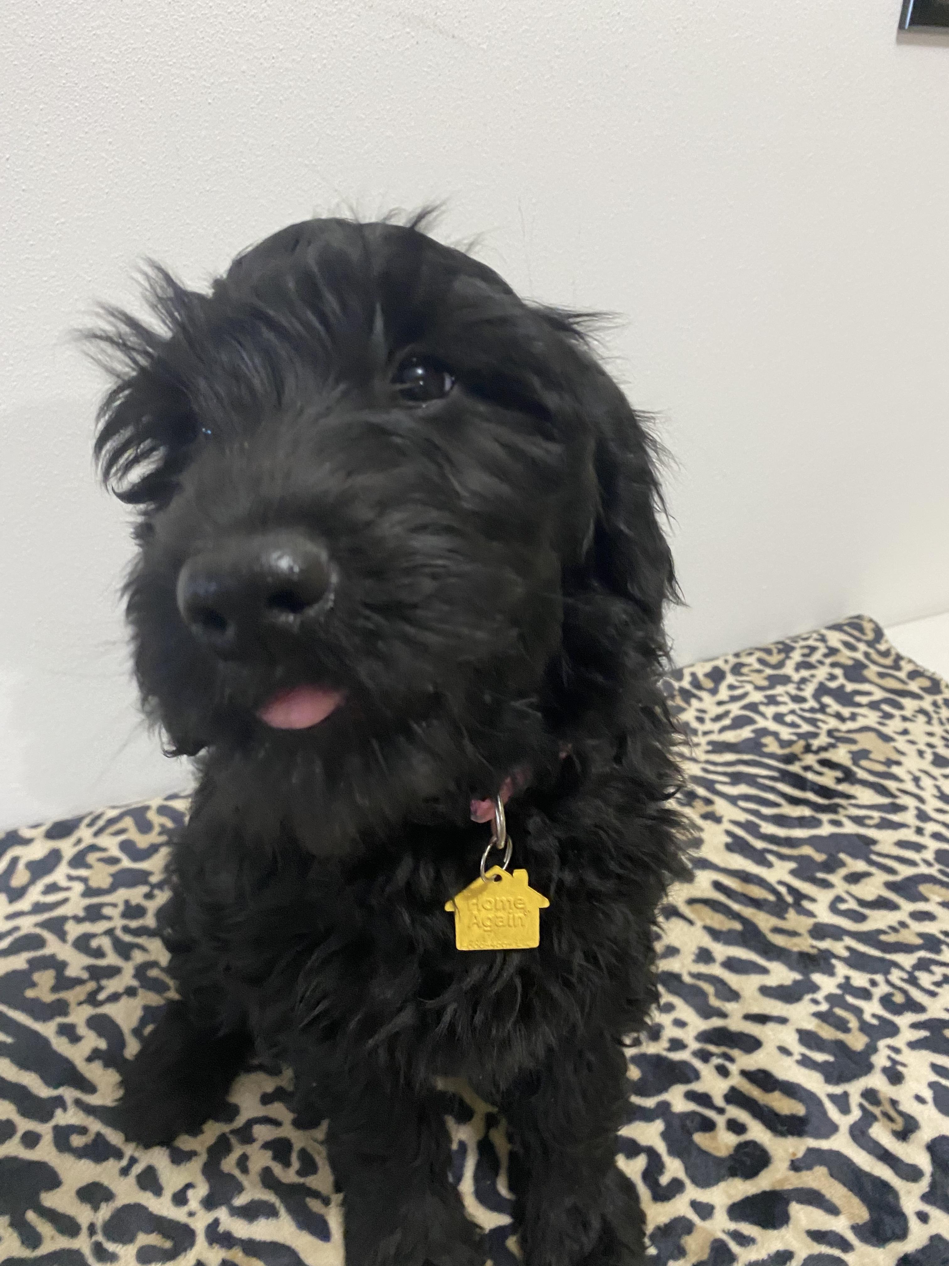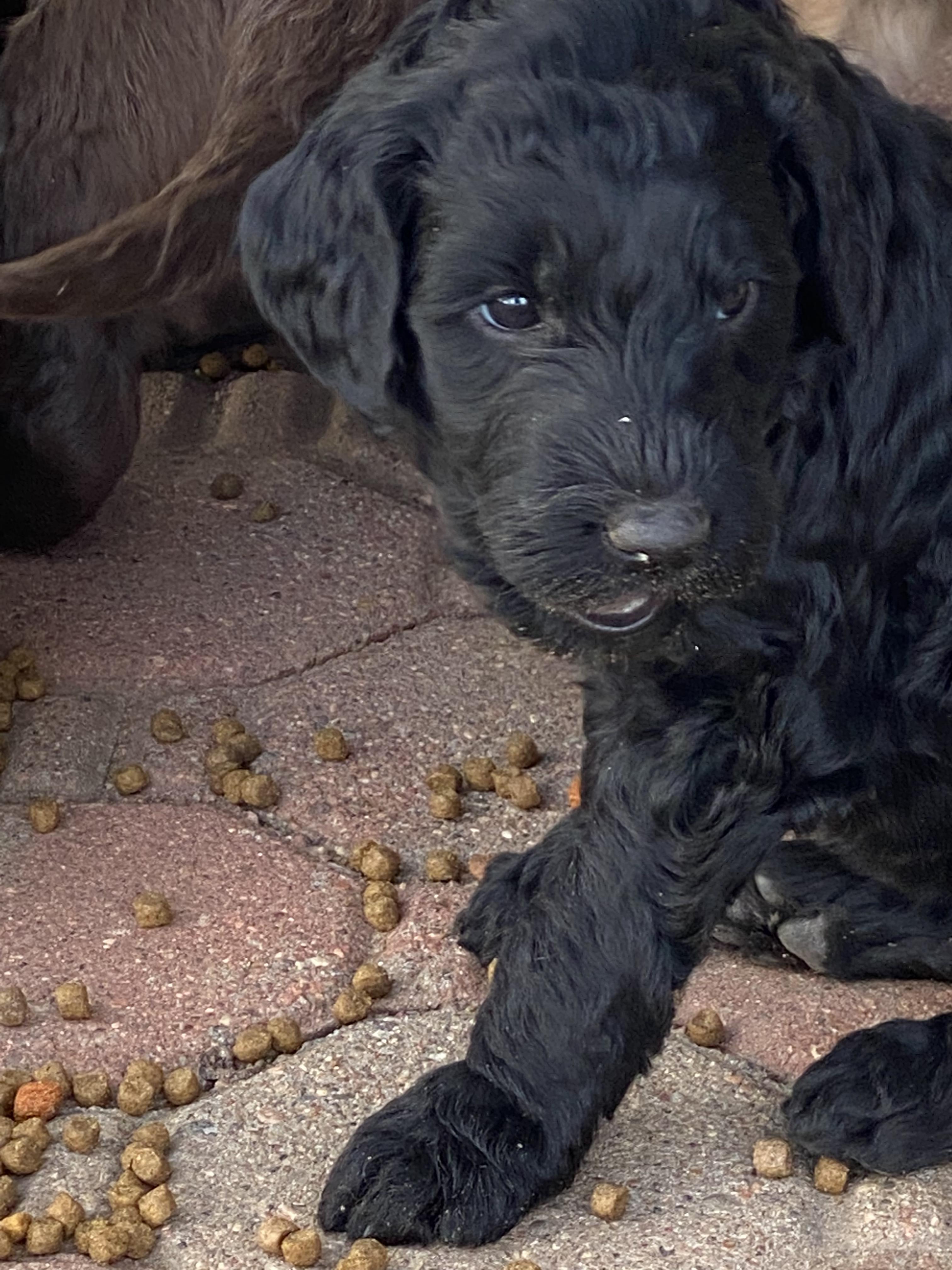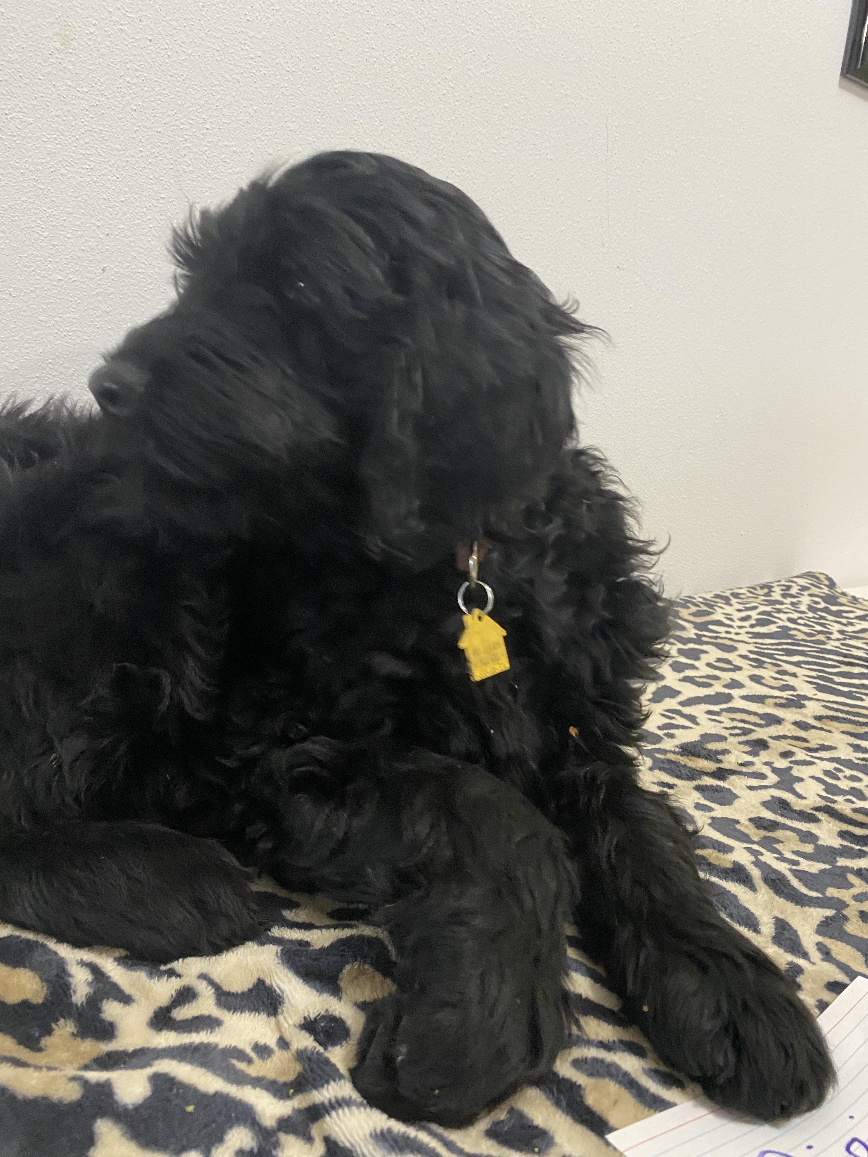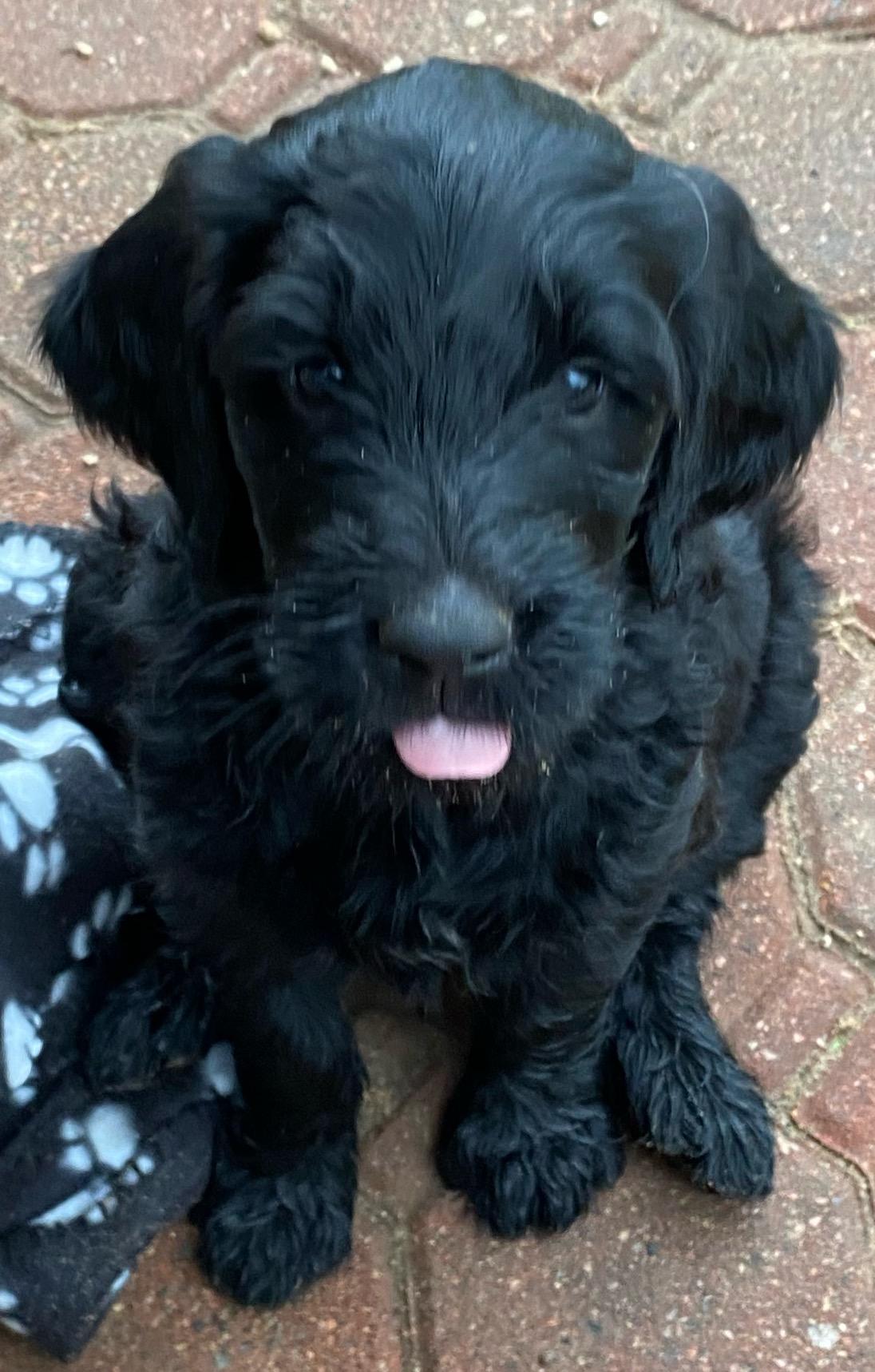Frankie is a gray, standard Goldendoodle. The is dominate in her pack. She has black, silver-tipped coat. Frankie is a very calm companion, leader and mother.