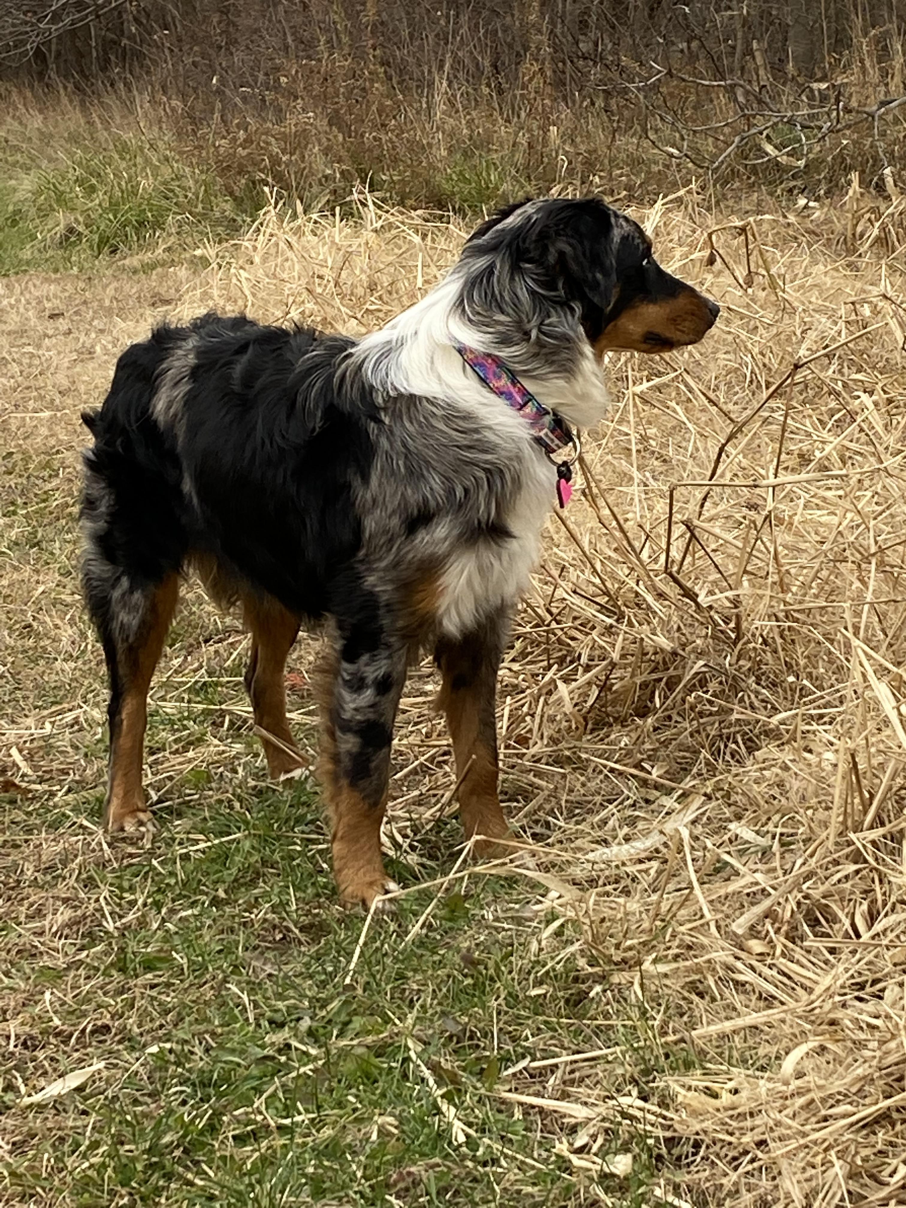 Stunning Blue Merle female with unique coloring and bright blue eyes. Quiet demeanor, prefers people vs the pack. Does my daily chores with me and never leaves my side. When we do get the herding ball out or swift paws she’s right on it. Super fast and loves competing in fast cat. Always wanting to please her humans and super tolerable of other animals while always showing respect.