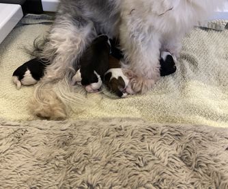 Our puppies include tri-color, black and white, and white. Colors will vary depending on the parent dogs.
