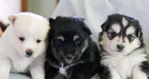 Our Pomsky puppies include black and white, chocolate, merle, and red and white. Colors will vary depending on the parent dogs.