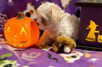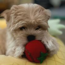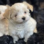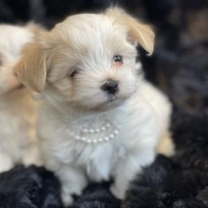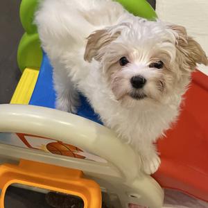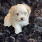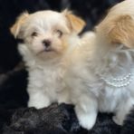 Jewel is a 100% Korean Maltese. With her short nose, big eyes and round skull she is a wonderful model of what a Korean Maltese should look like. She is an energetic puppy still…growing up slowly and having a good time doing it. She is happy, never grumpy or snappy with any dog and never meets a stranger.