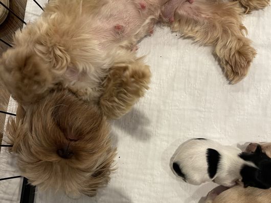 Our puppies get socialization from birth. They are handled and exposed to the things that they will encounter in a home. Through positive reinforcement our puppies are often pee pad trained when they leave our home.