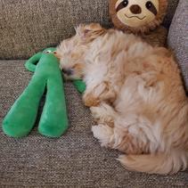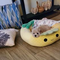 Houdini has a fun personality. He likes to flip his toys to me or turn around and kick them with his hind legs. When he plays with his “brother” he will often turn and either hip check or kick him with his hind legs. He likes to sleep curled up in the crook behind my knees. He is very sweet and plays well with any of the puppies we have in our home. He produces small puppies.