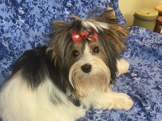She is a biewer in color which is a black and white body with gold on the face (eyebrows ears cheeks or any combination of these)